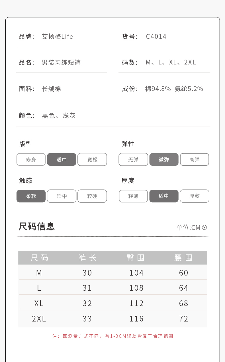 艾扬格 life C4014 男装习练瑜伽短裤 带弹力棉质面料