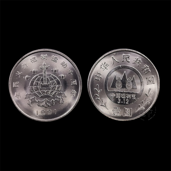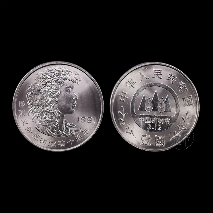 背面图景:绶带、铁锹和树;女青年头像头发由花和绿叶组成;华表、地球、飞翔小鸟
