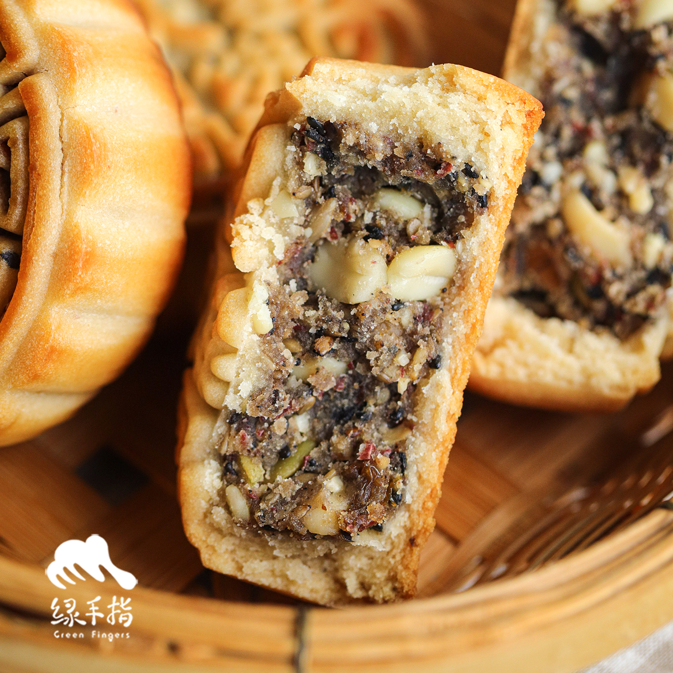 五仁月饼,白芸豆泥包裹花生、南瓜籽、核桃仁、葡萄干、芝麻五种果仁,明火烘焙激发果仁香气,口感丰富酥香。