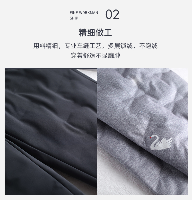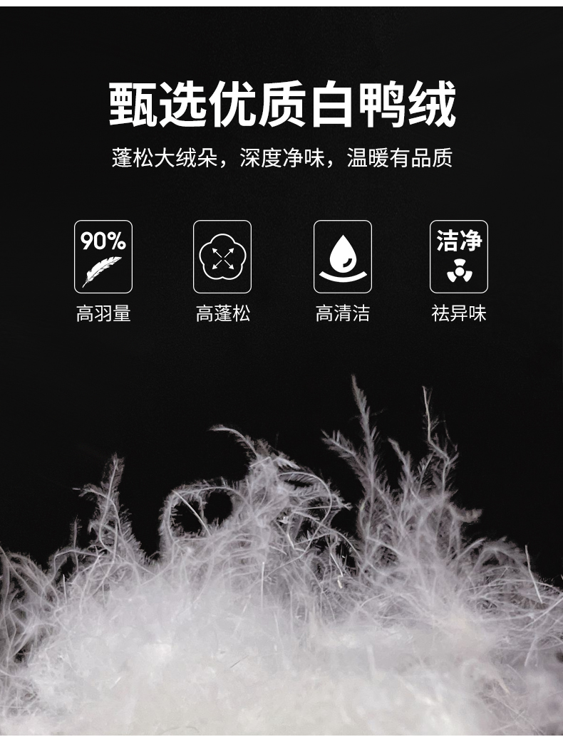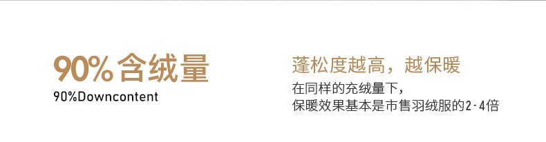 面料:90%锦纶,10%氨纶,里料采用90%聚酯纤维,10%氨纶;填充物:90%羽绒,10%羽毛