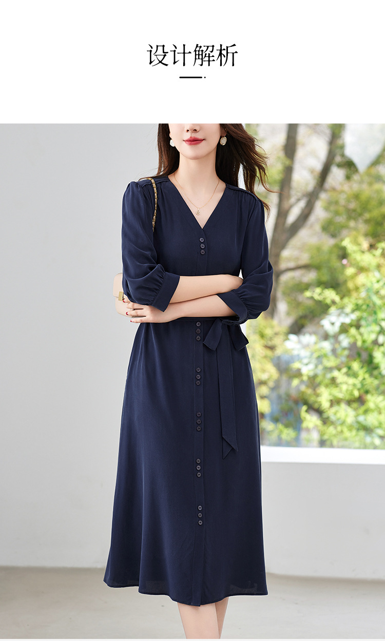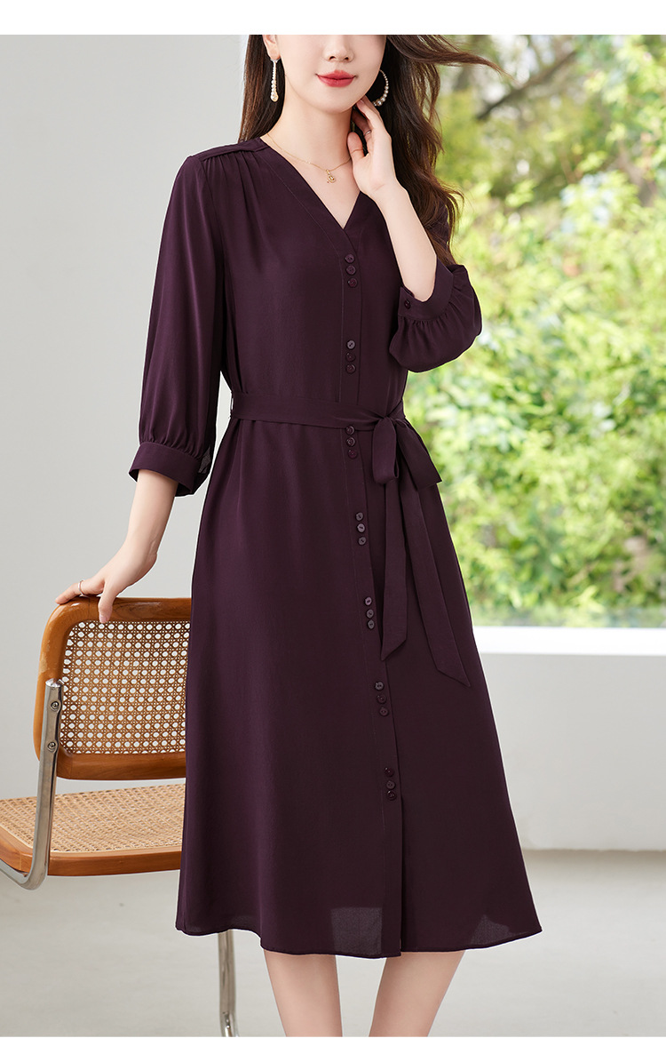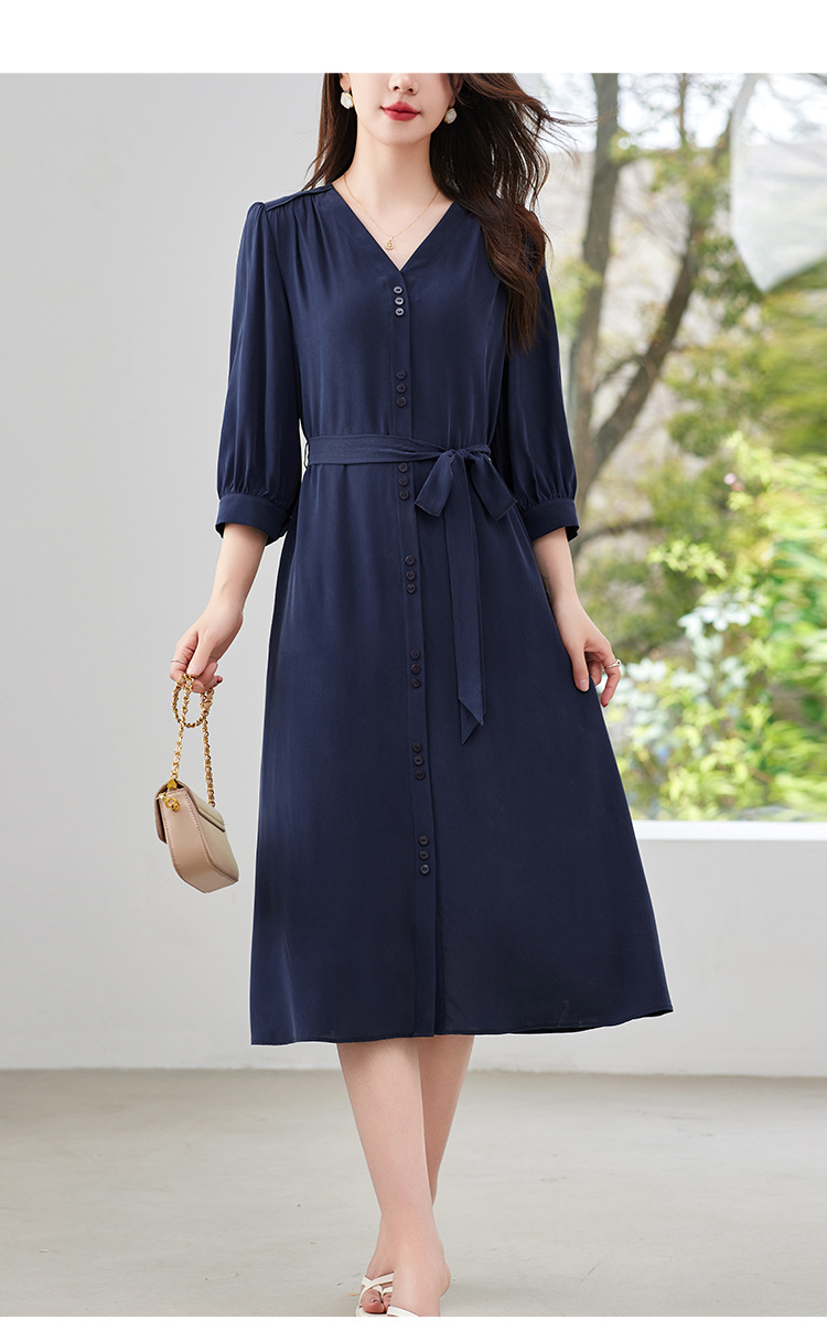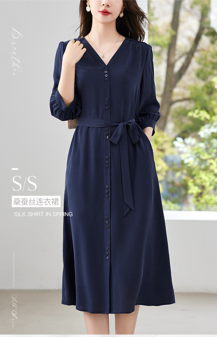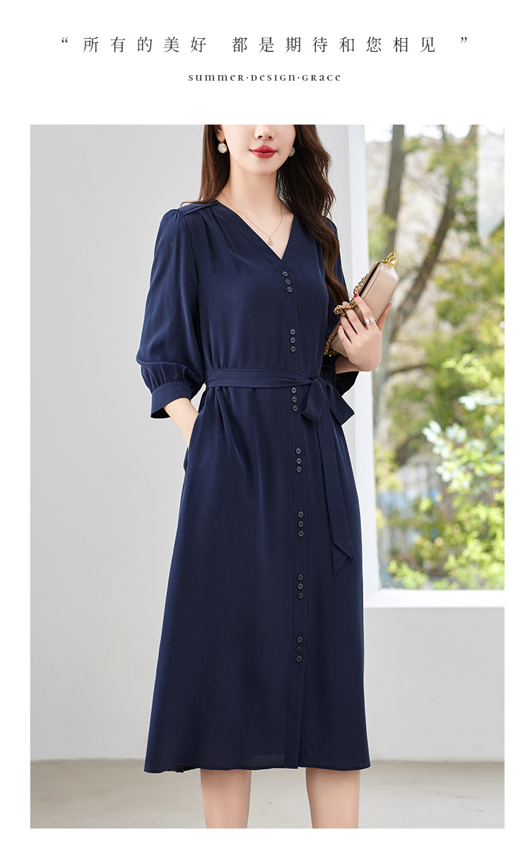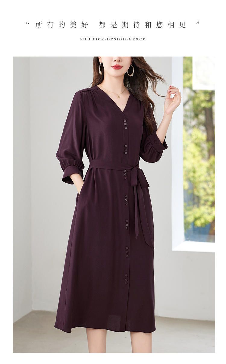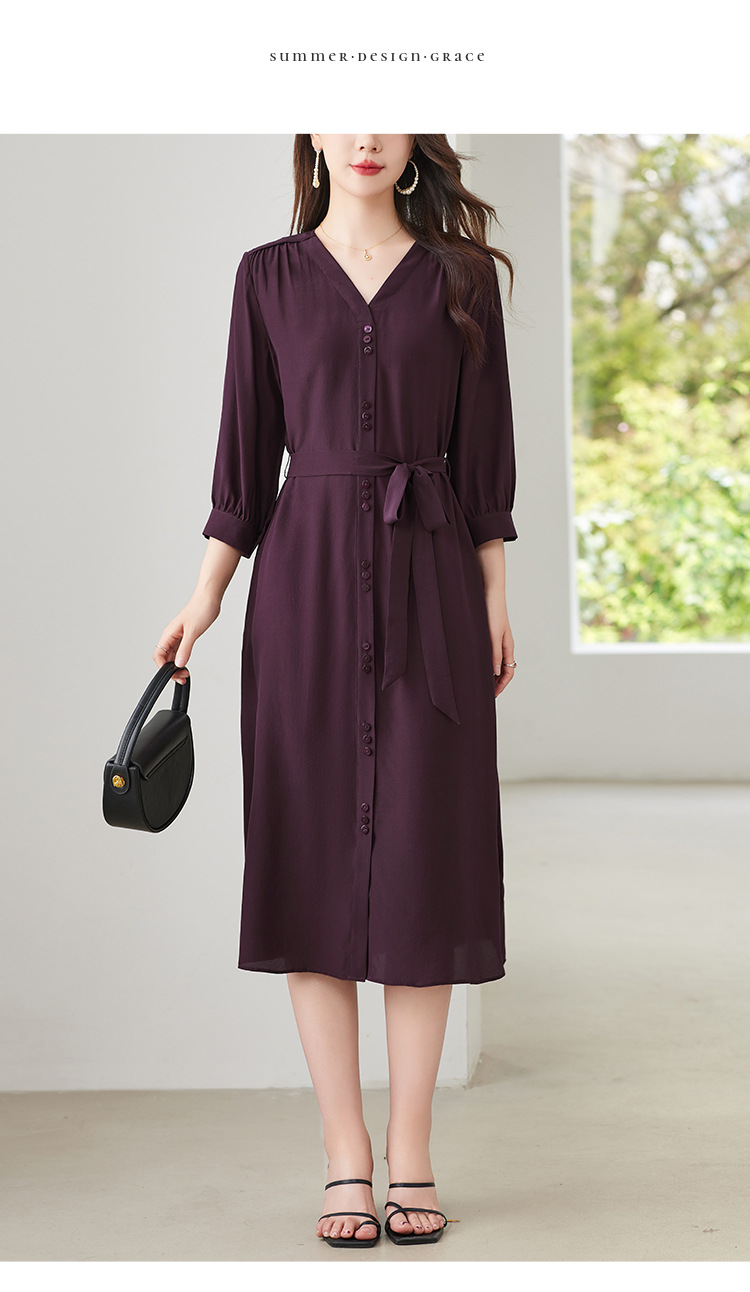 QS-82497380轻奢高端真丝03双绉连衣裙女2024新款夏季V领系带桑蚕丝长裙子