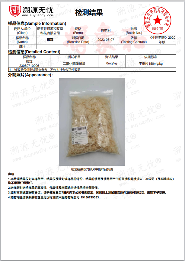 第三方检测机构检测:银耳多糖含量高达:42.2%,粗纤维:71.4%