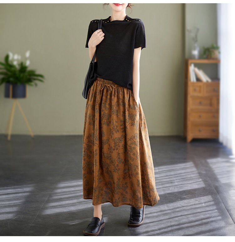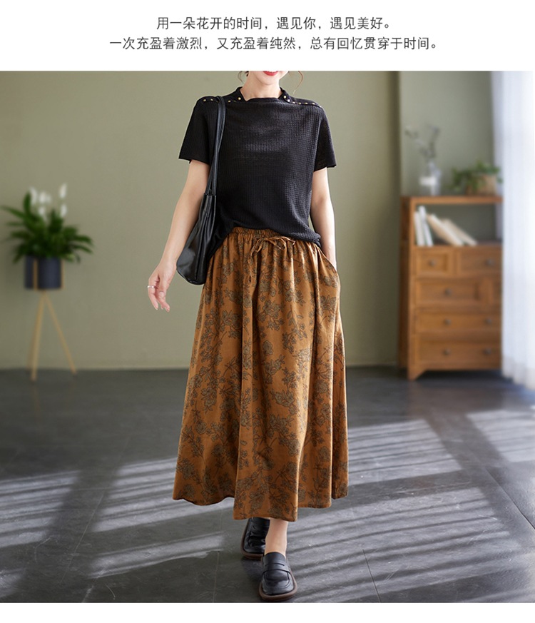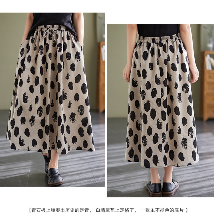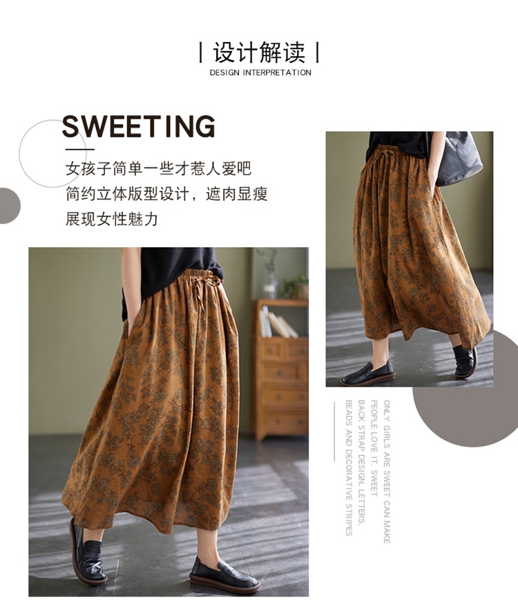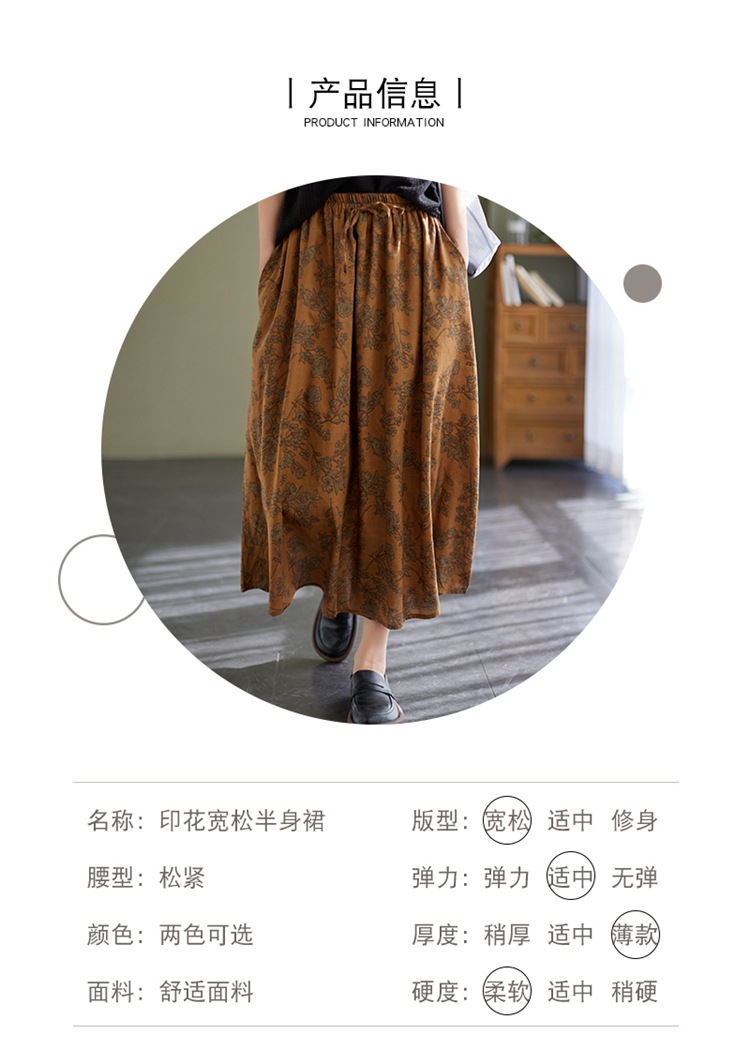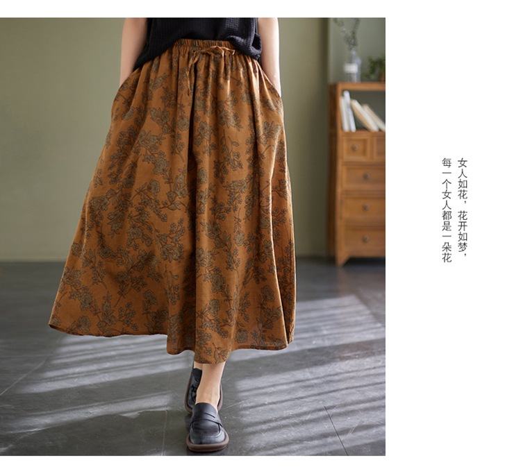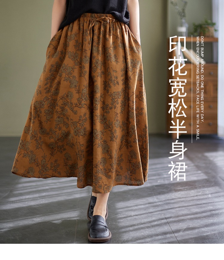 雀说 复古棉麻印花宽松松紧腰显瘦大摆中长款半身裙JMB091-555