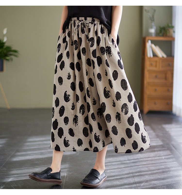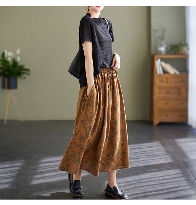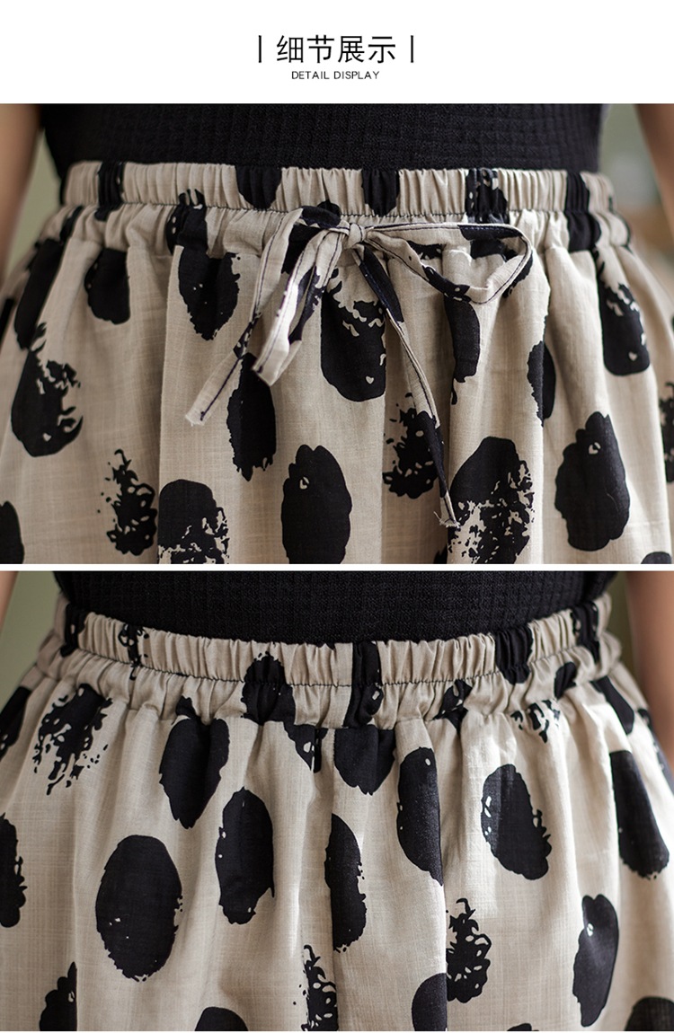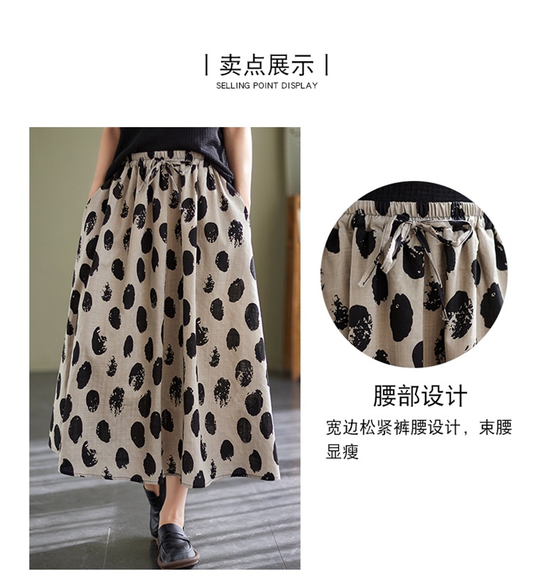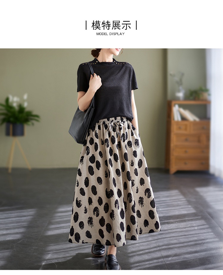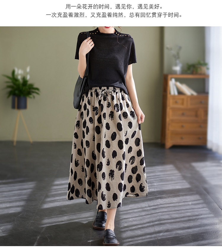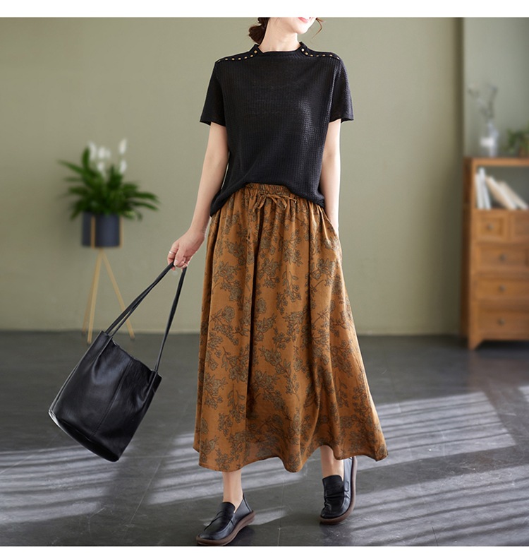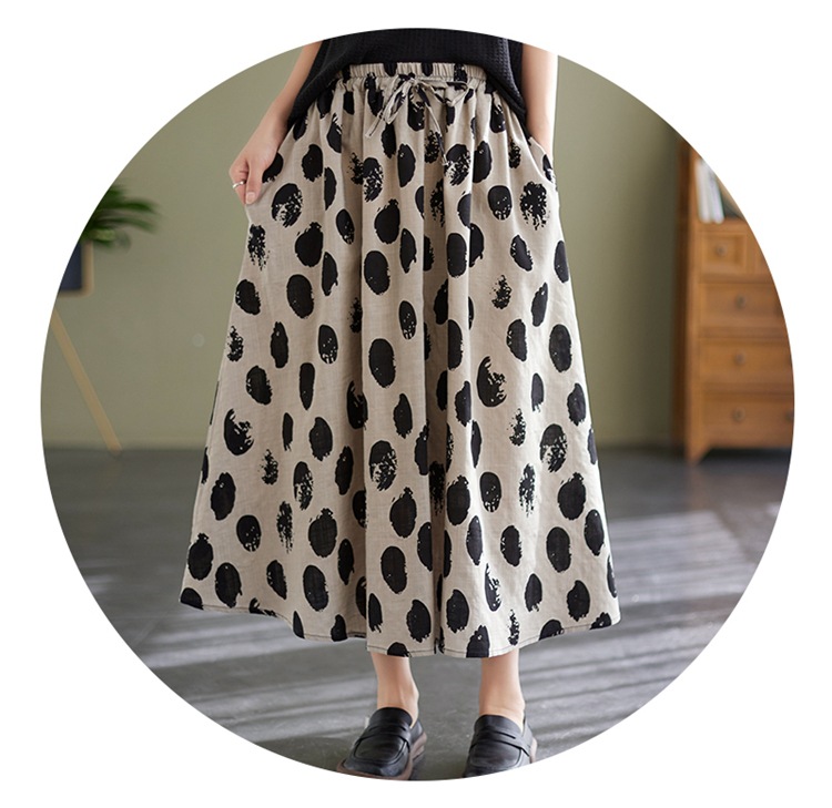 雀说 复古棉麻印花宽松松紧腰显瘦大摆中长款半身裙JMB091-555