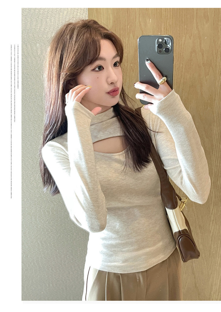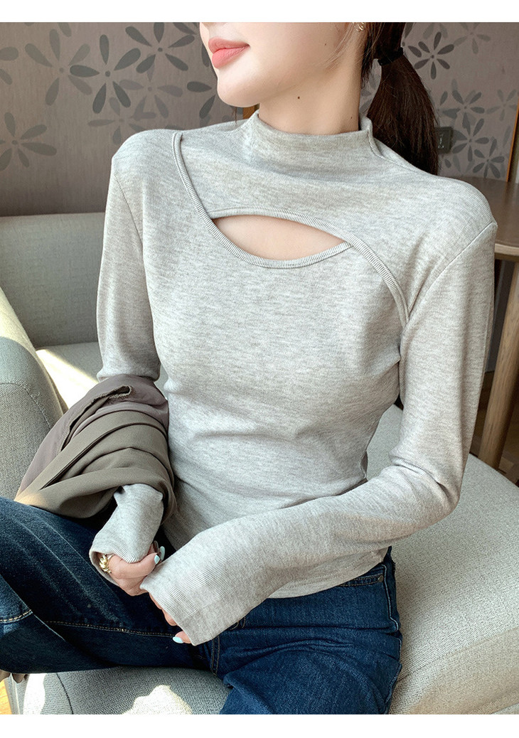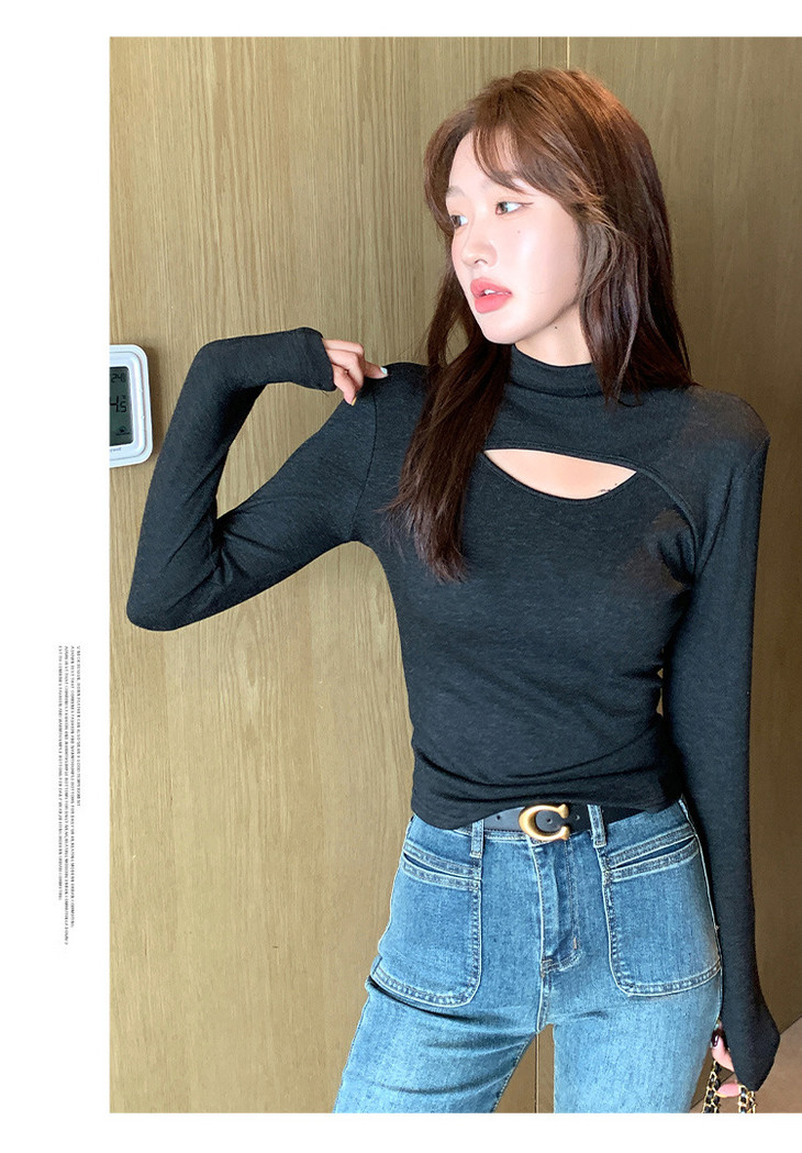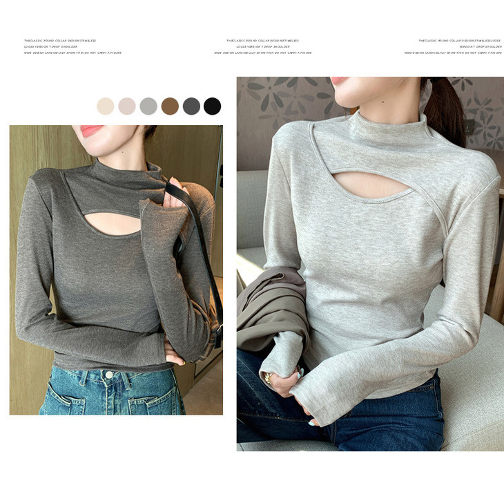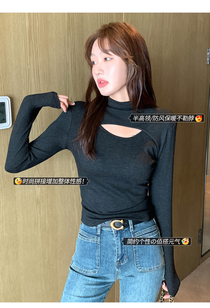 【秒杀】成人女士新款拼接挖洞春秋小心机打底衫女半高领镂空辣妹设计感长袖
