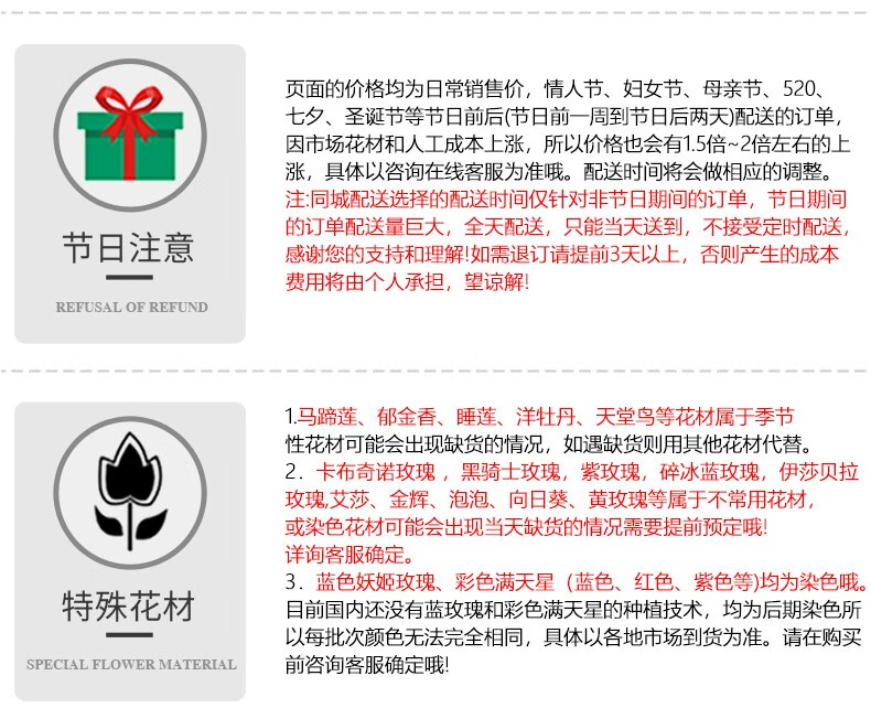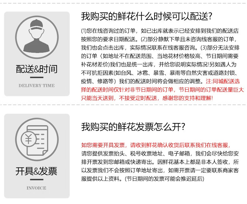 - 本店承接全国市区同城送花服务,同城花店专人专车送花上门。平时下单30分钟至3小时送达! 下单后为了不影响您的订单配送,请在微信公众号上和客服确认,谢谢配合 投诉电话:15815551580