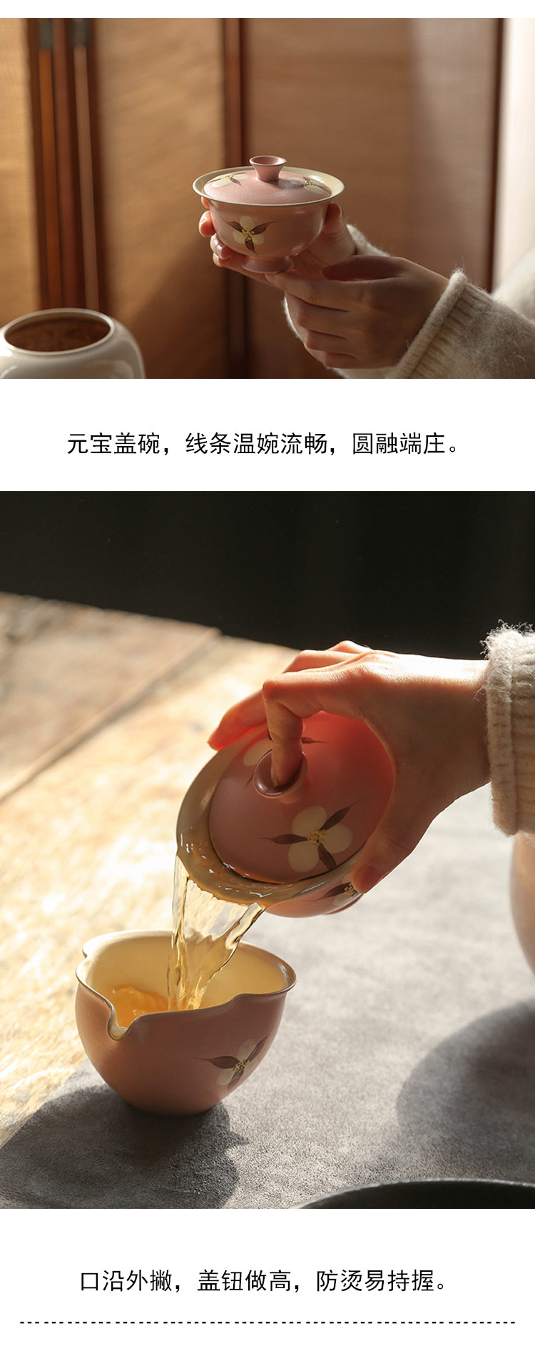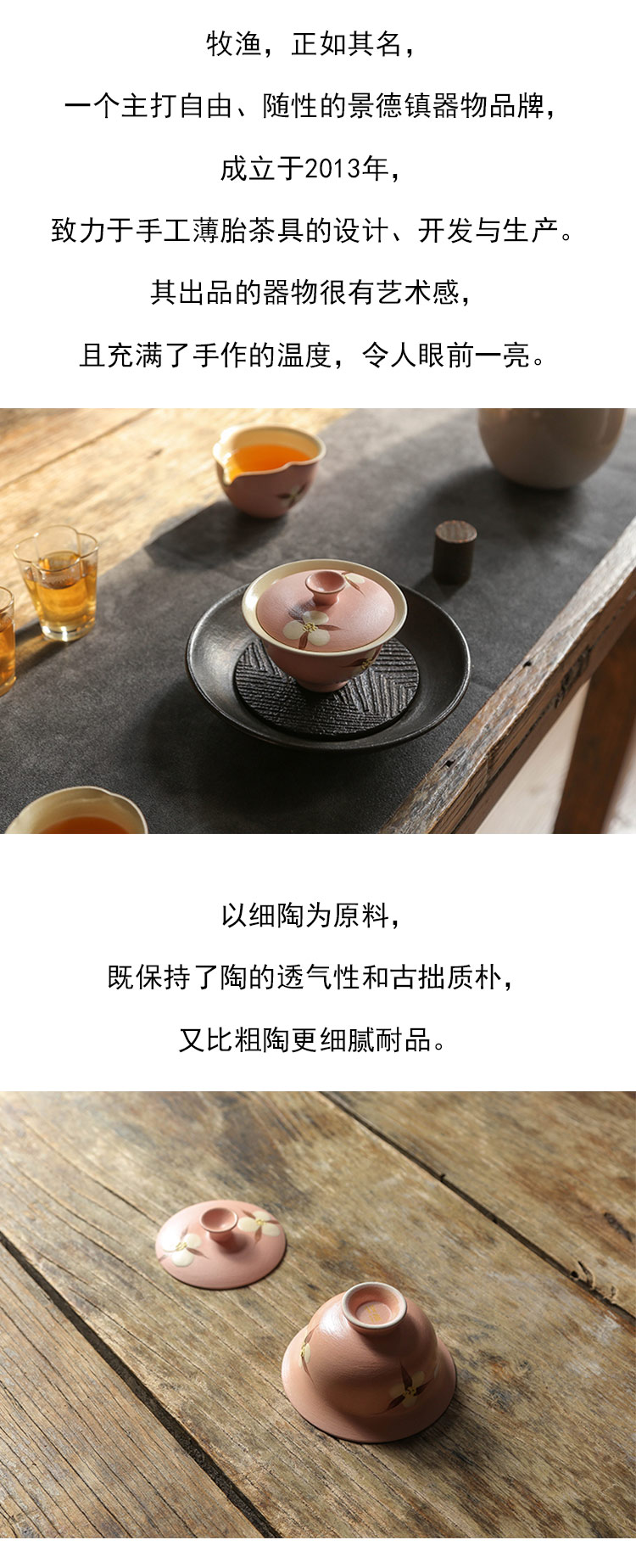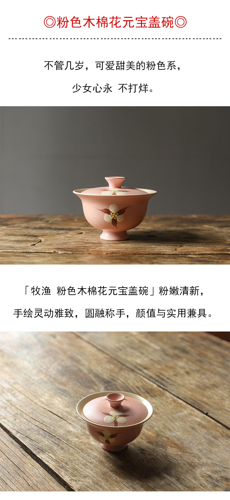 茶香记 牧渔粉色木棉花元宝盖碗景德镇手作薄胎手绘粉嫩清新陶瓷160ml