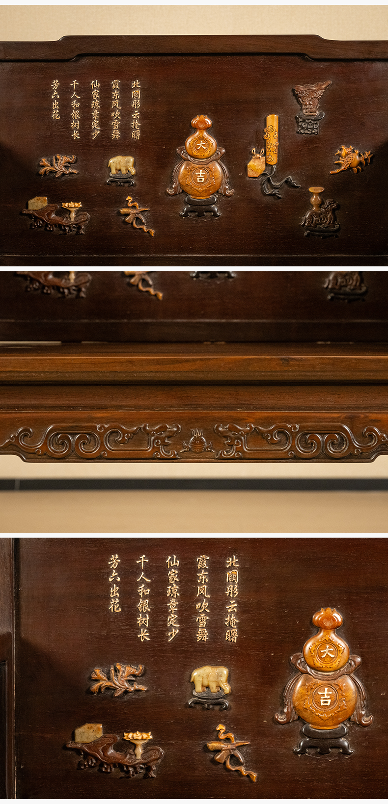 清 红木百宝嵌博古清供图诗文三围屏宝座