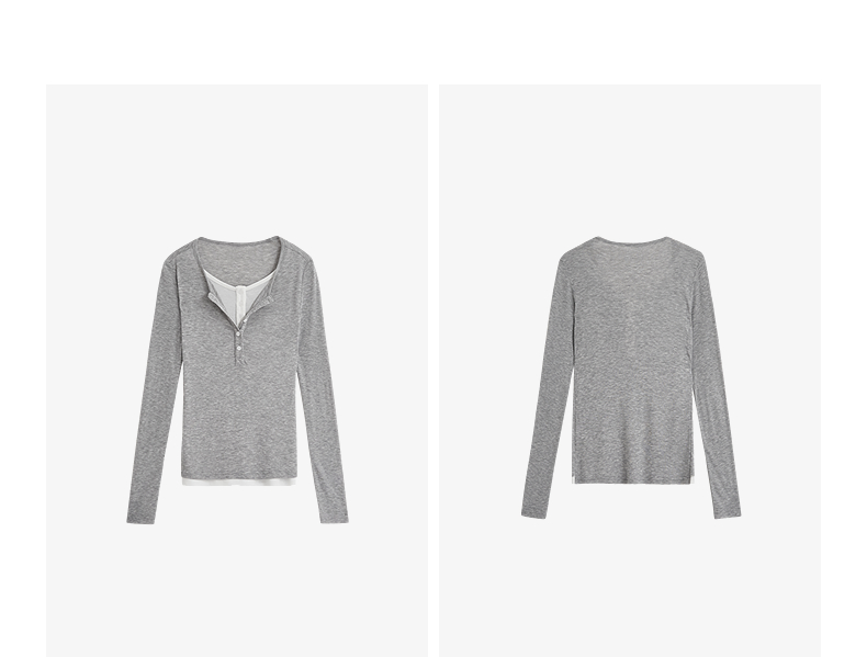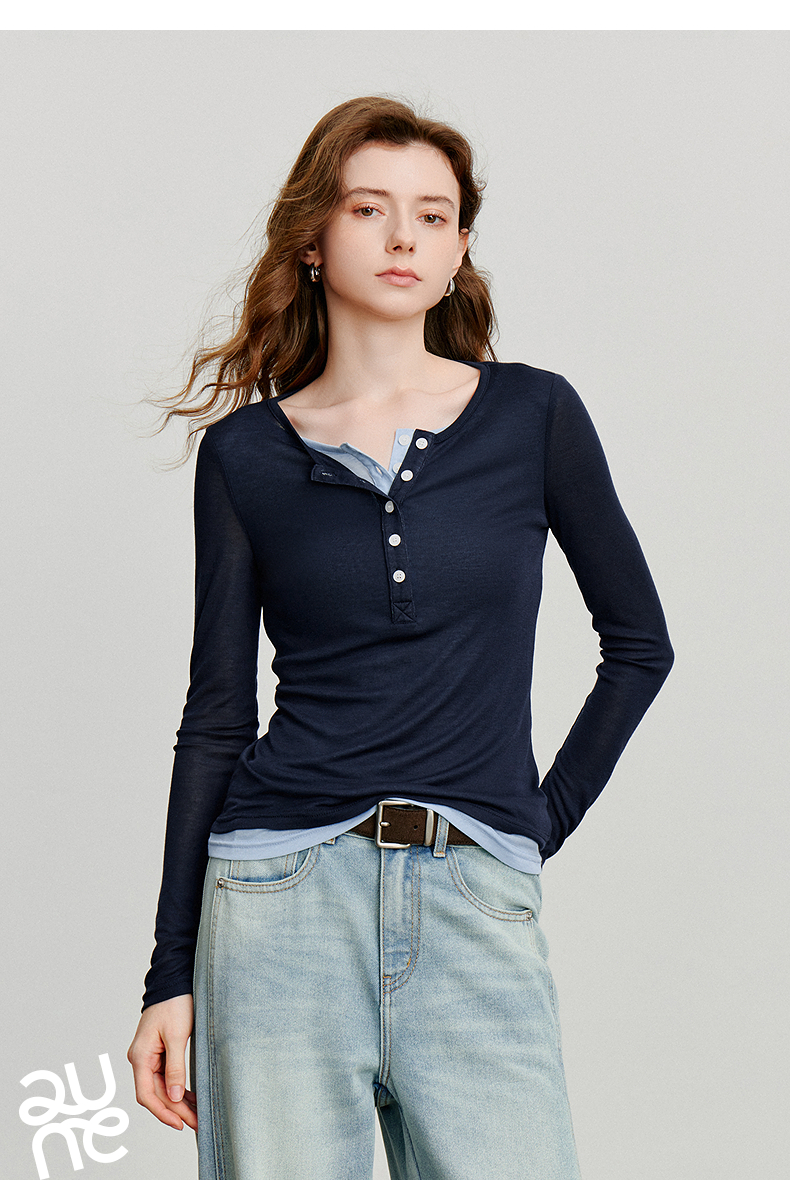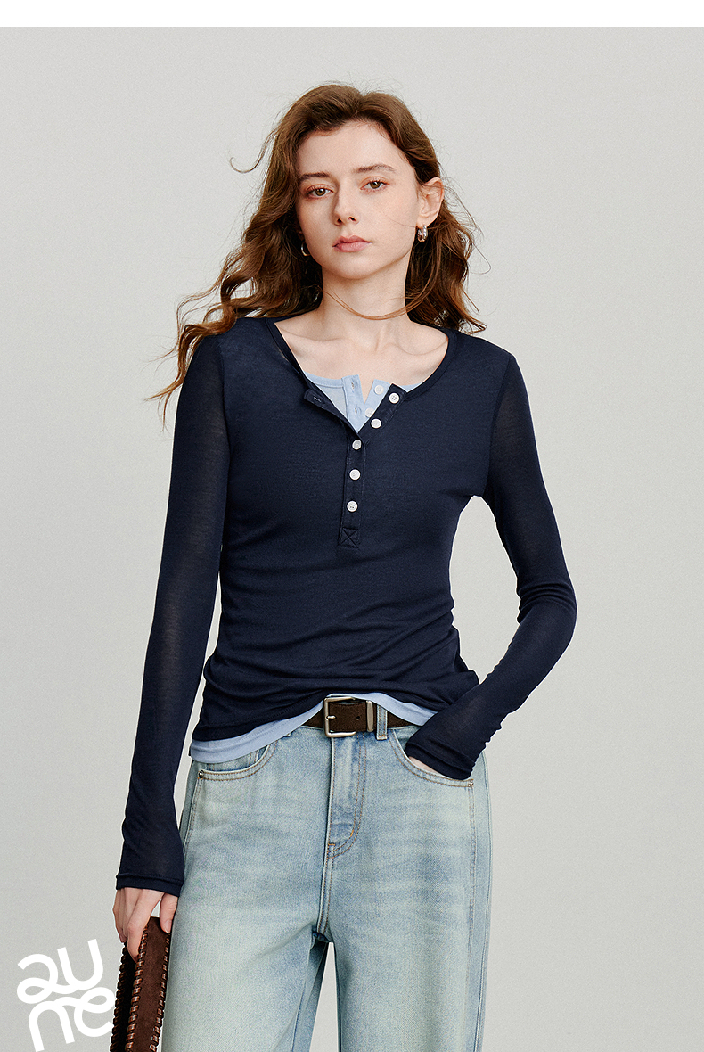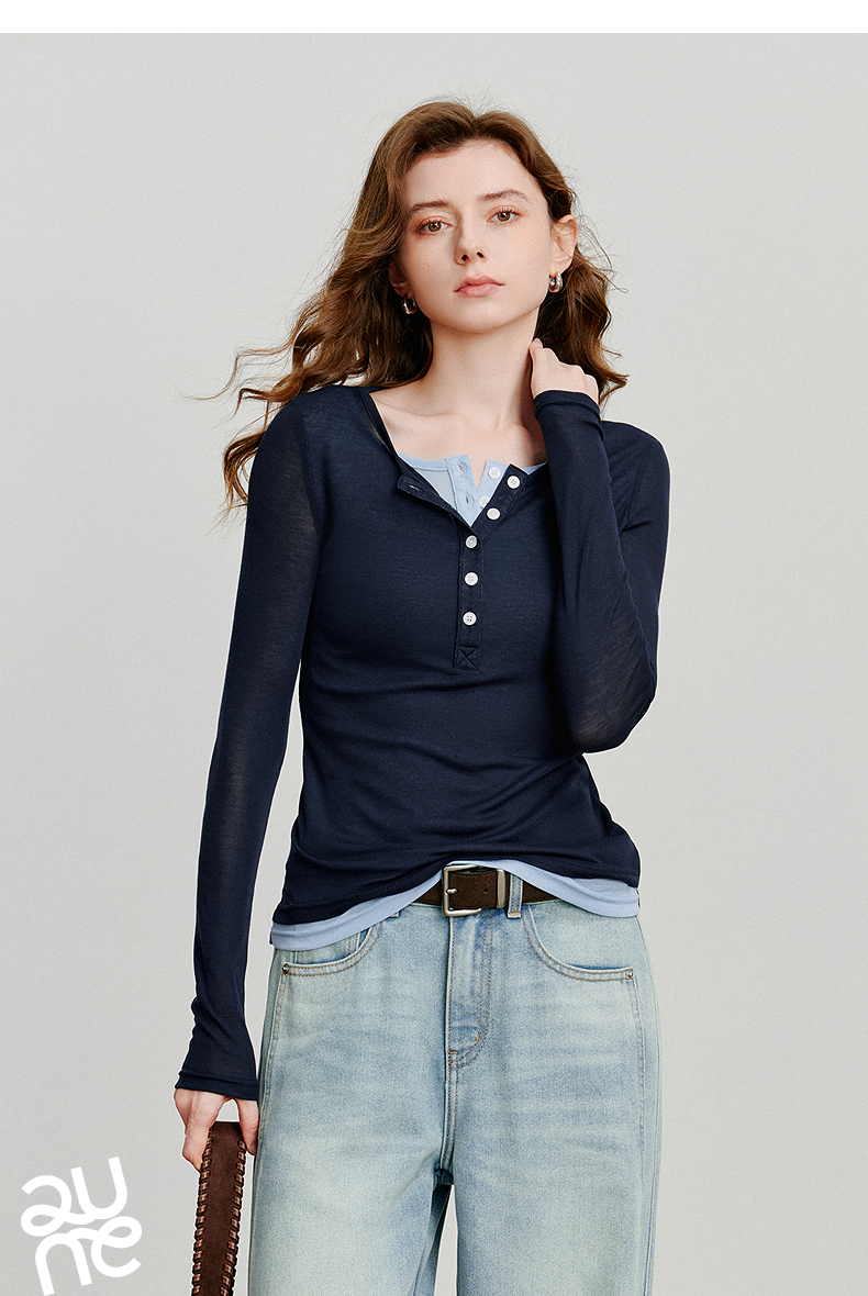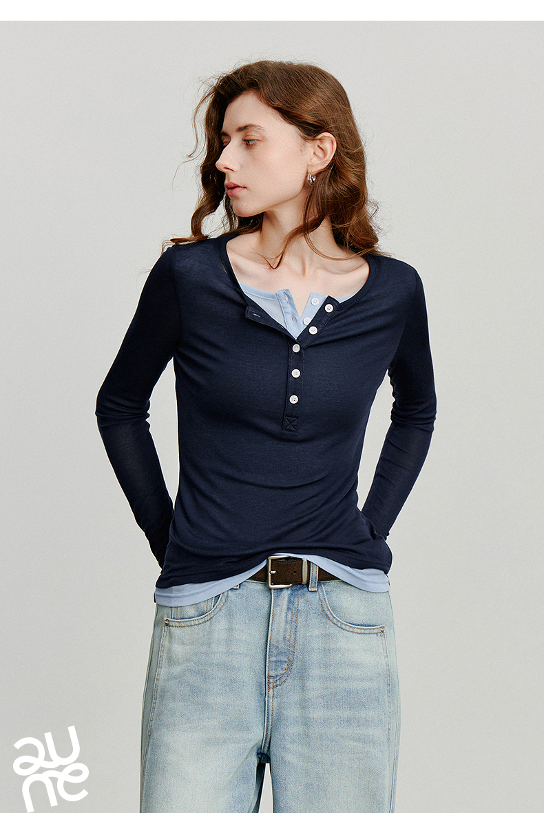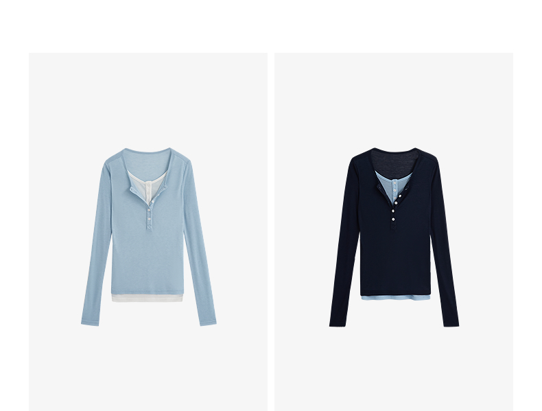 初语轻薄软糯长袖T恤女撞色假两件时髦叠穿打底衫上衣