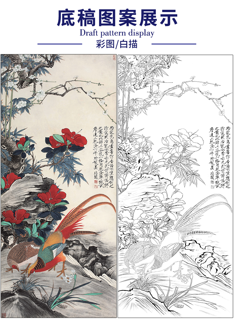 于非闇工笔画白描底稿《锦上添花》锦鸡临摹勾线高清打印稿HS04