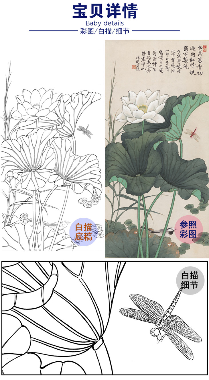 竖幅工笔花鸟白描底稿-于非闇-荷花蜻蜓-A079
