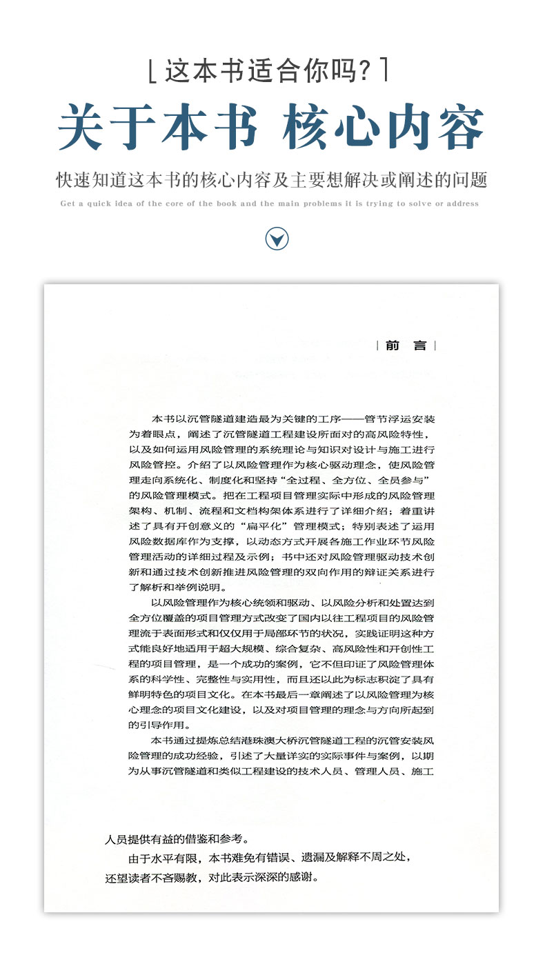 本书以沉管隧道建造最为关键的工序——管节浮运安装为着眼点,阐述了沉管隧道工程建设所面对的高风险特性,以及如何运用风险管理的系统理论与知识对设计与施工进行风险管控。介绍了以风险管理作为核心驱动理念,使风险管理走向系统化、制度化和坚持“全过程、全方位、全员参与”的风险管理模式。把在工程项目管理实际中形成的风险管理架构、机制、流程和文档构架体系进行了详细介绍;着重讲述了具有开创意义的“扁平化”管理模式;特别表述了运用风险数据库作为支撑,以动态方式开展各施工作业环节风险管理活动的详细过程及示例;书中还对风险管理驱动技术创新和通过技术创新推进风险管理的双向作用的辩证关系进行了解析和举例说明。