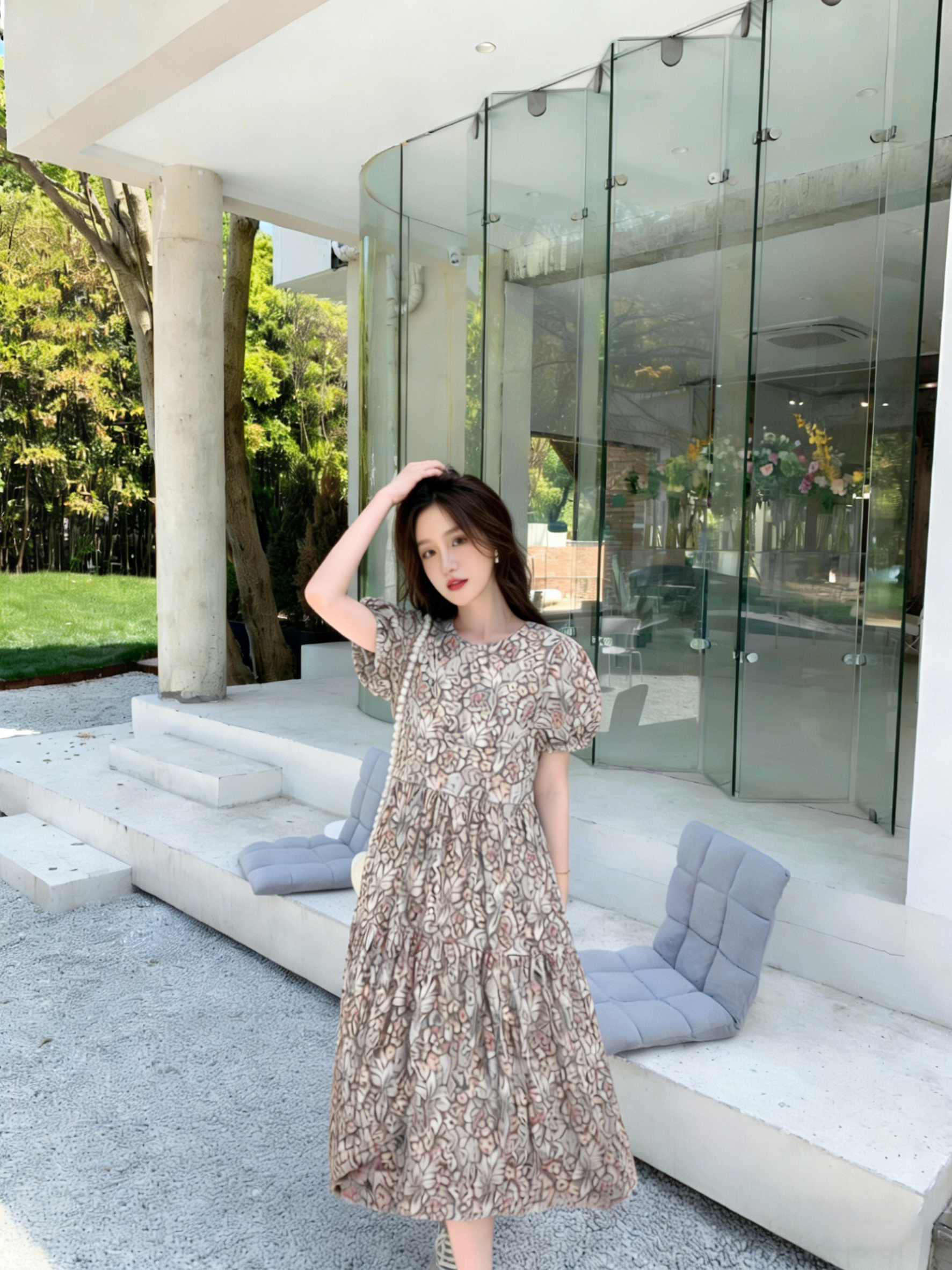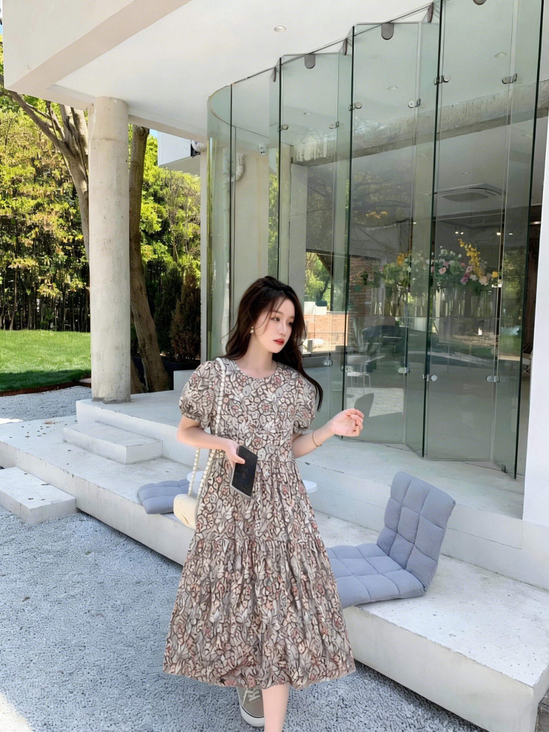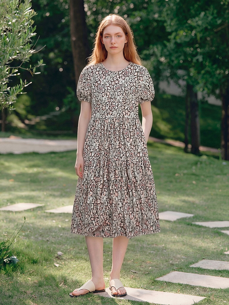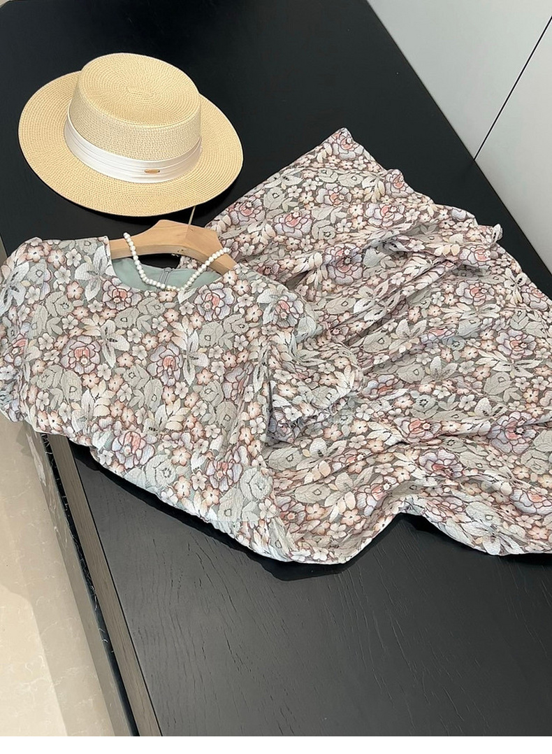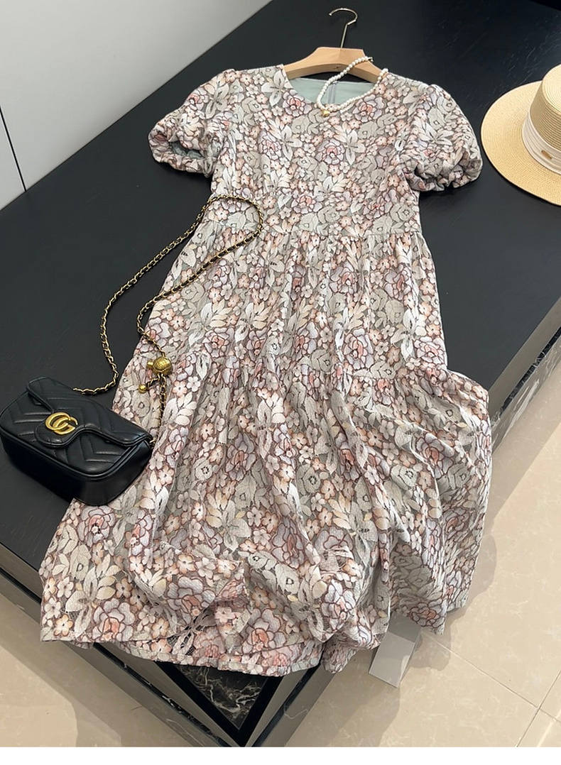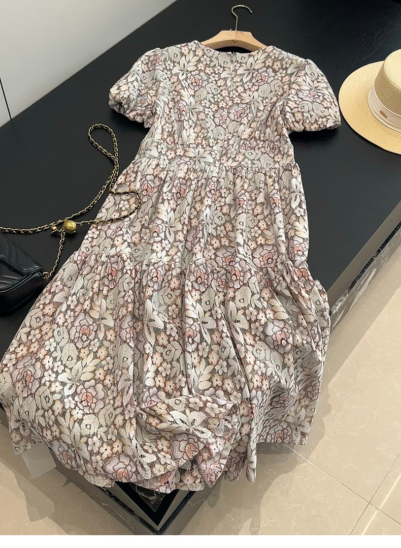 天猫同步【浪漫莫奈花园】拉夏贝尔/La Chapelle高端轻奢!简约花朵小众设计短袖长裙泡泡袖修身小裙