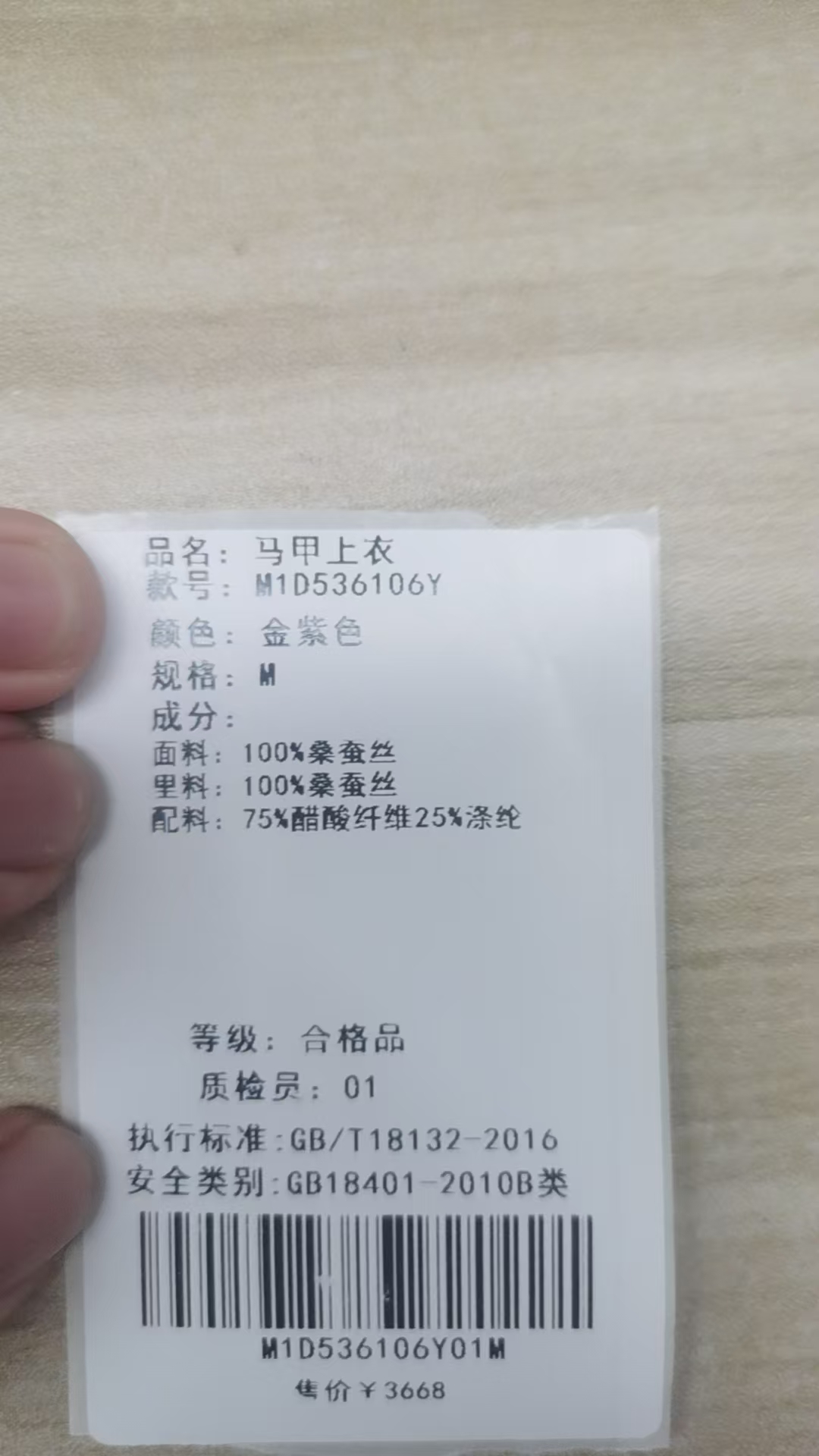 面料:100%桑蚕丝 里料:100%桑蚕丝 配料:75%醋酸纤维 25%涤纶