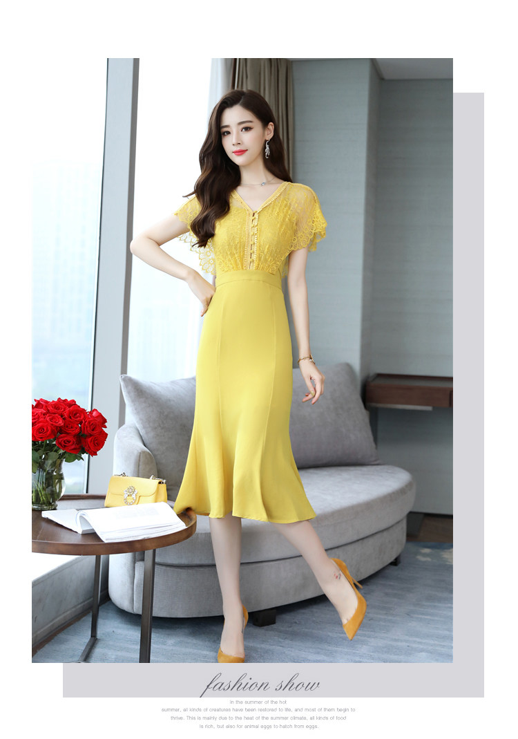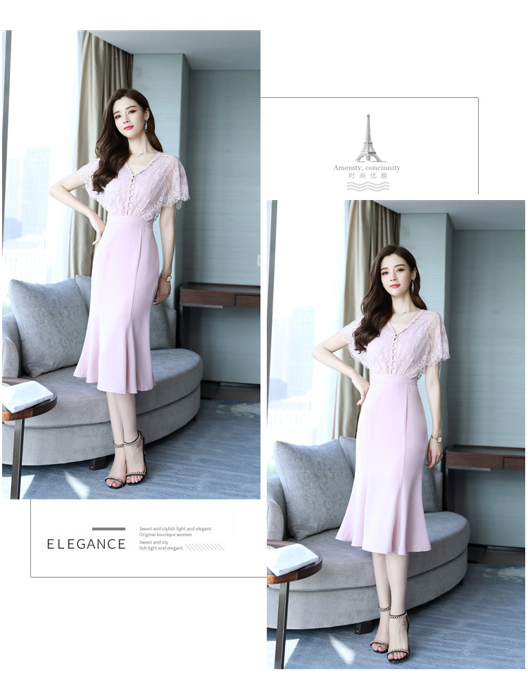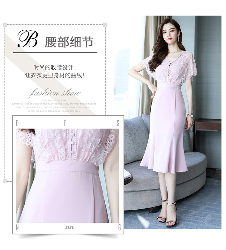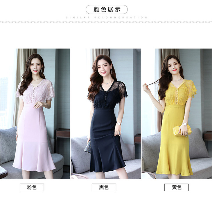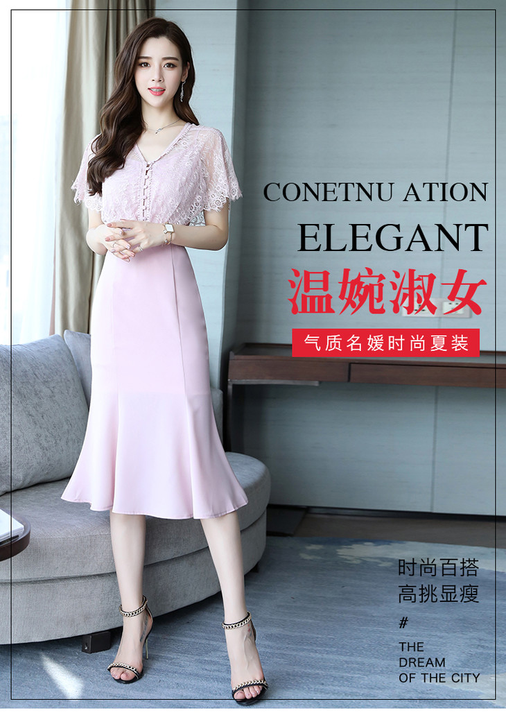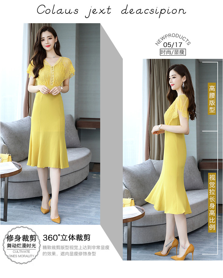 XP-BBL1052夏季V领短袖网纱拼接套头显廋大码鱼尾裙