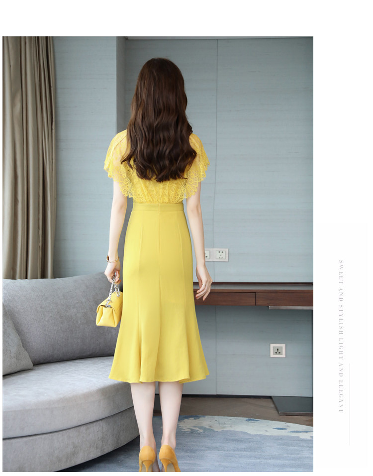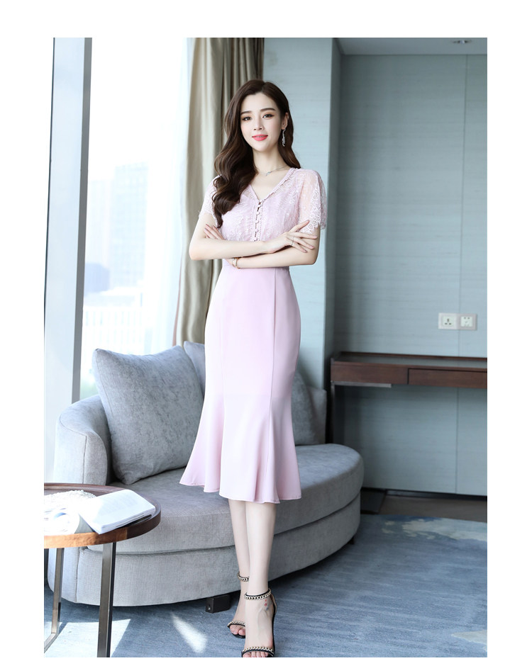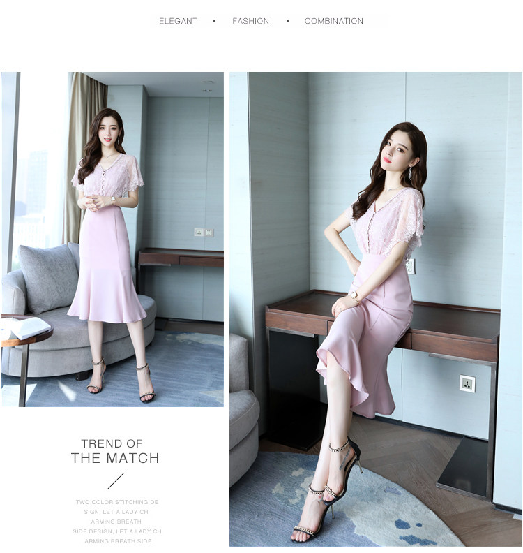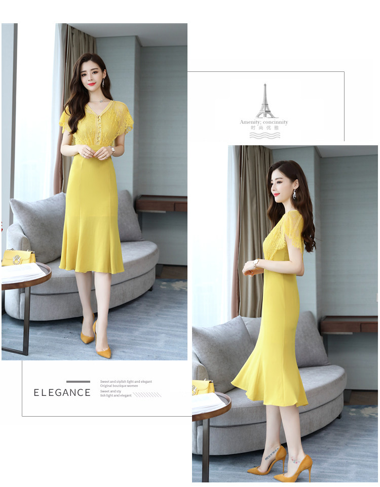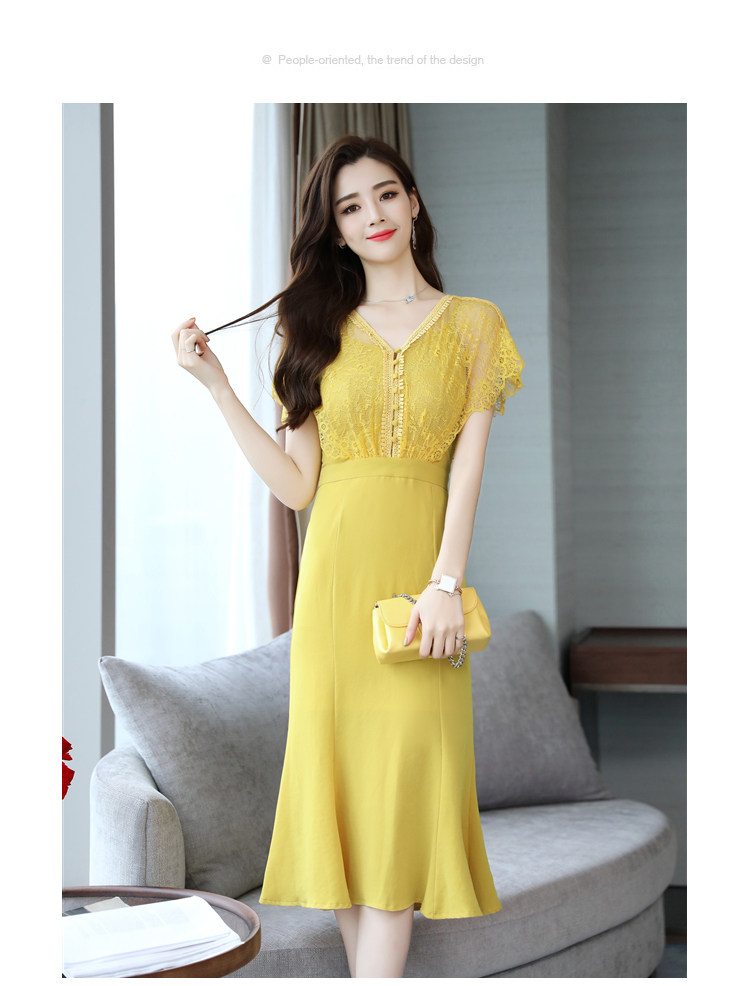 XP-BBL1052夏季V领短袖网纱拼接套头显廋大码鱼尾裙