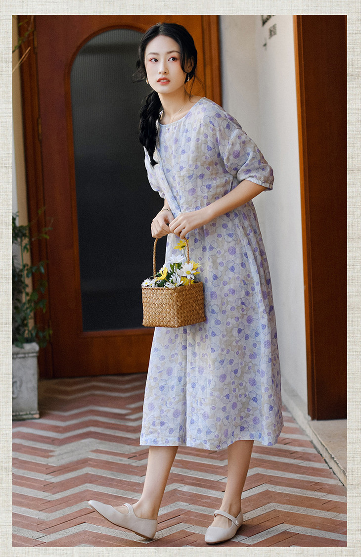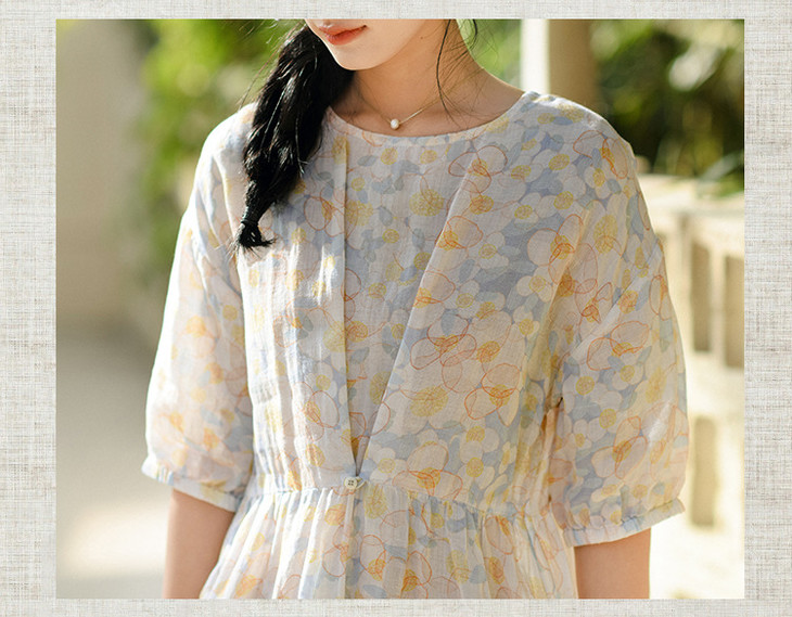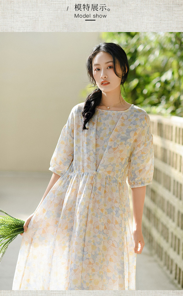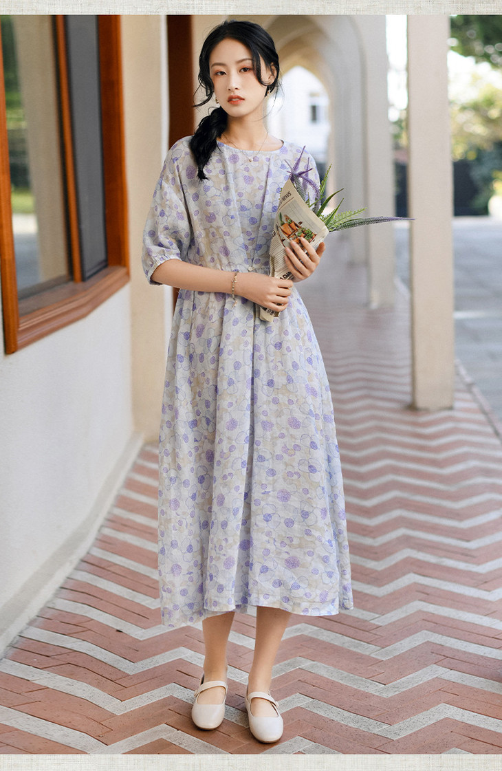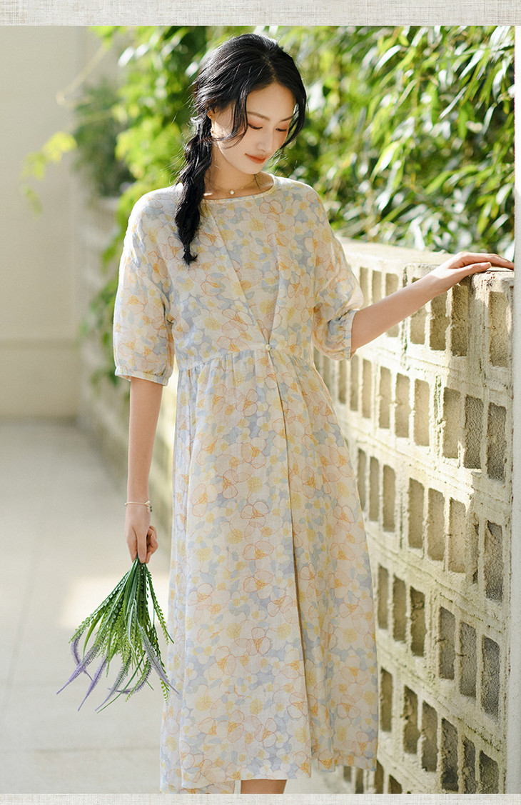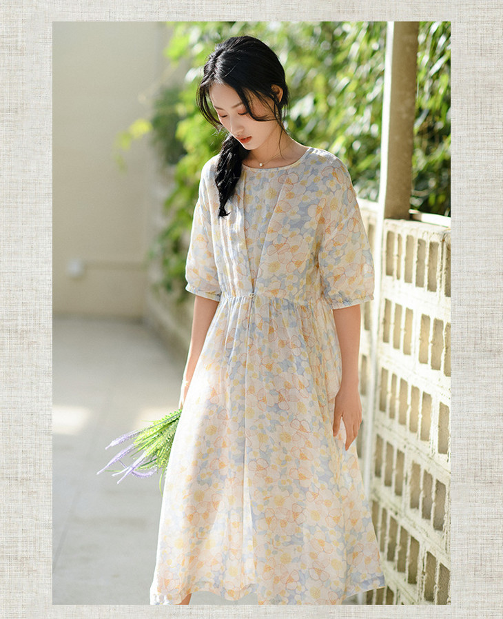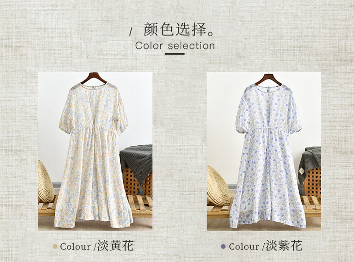 QMFS5671新款优雅气质收腰圆领短袖棉麻碎花连衣裙