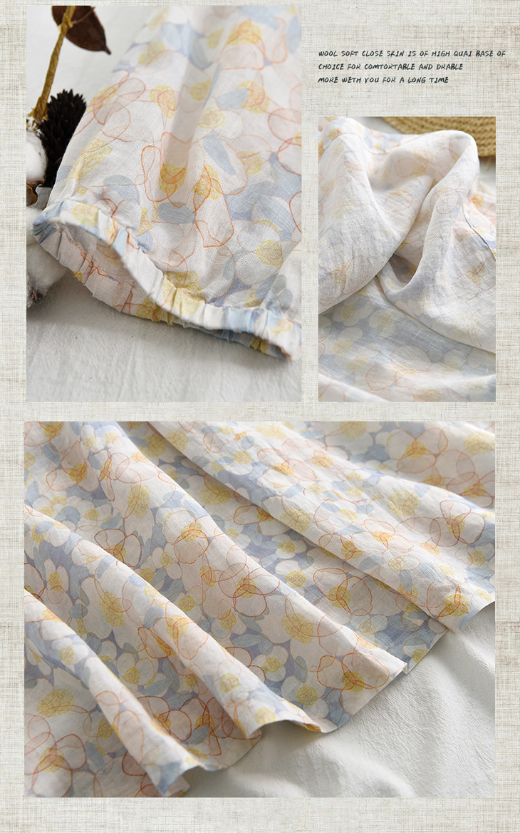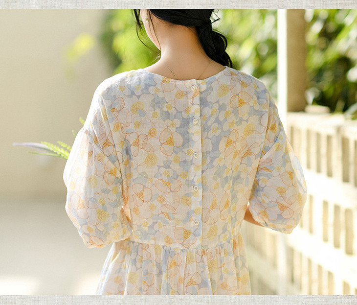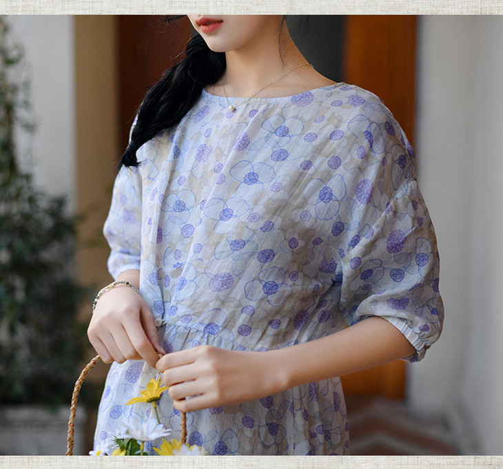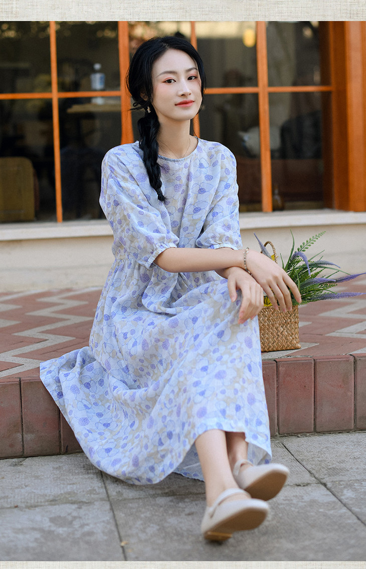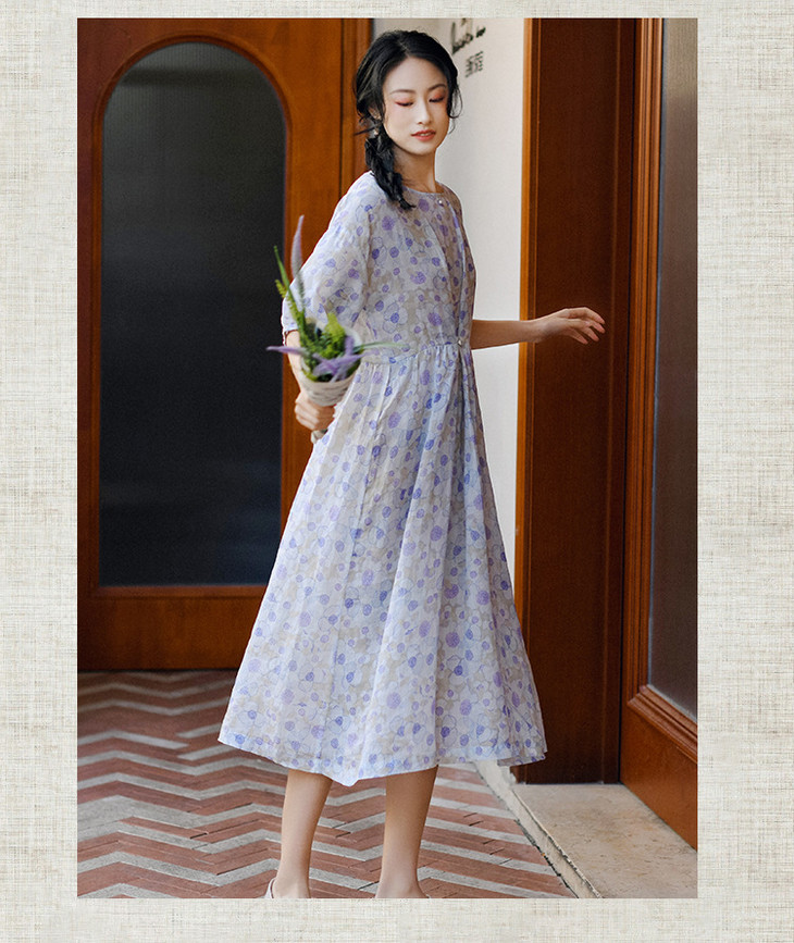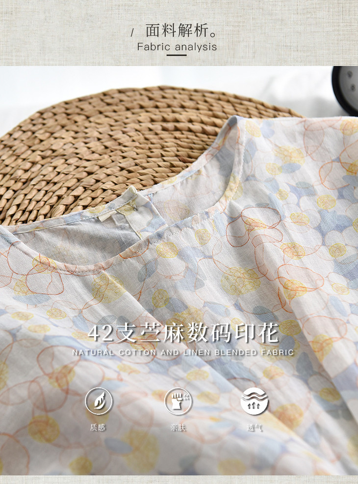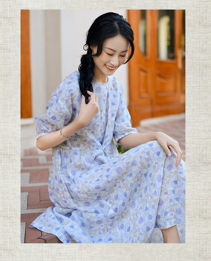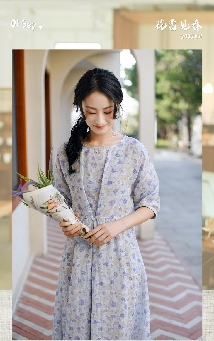 QMFS5671新款优雅气质收腰圆领短袖棉麻碎花连衣裙
