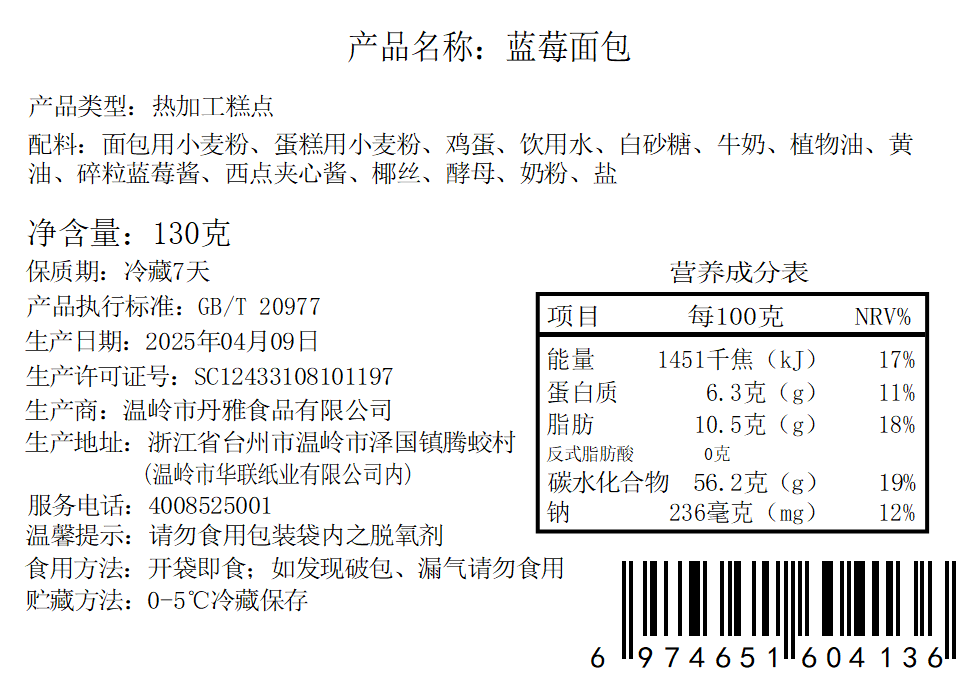 【品名】蓝莓面包/草莓面包 【规格】130克 【生产日期】现做现发 【保质期】冷藏7天(0一5度冷藏保存) 【产地】台州 【发货地】台州 【发货快递】随机不指定 【发货时效】48小时 【不发地区】新疆,西藏,内蒙,海南,甘肃,青海,宁夏 【加运费地区】北京➕2 上海➕1 【售后说明】 短保食品是根据订单按需生产,没有库存。下单3小时后,拒绝退款。介意者慎拍!手工制作,大小难免统一,完美主义勿拍 1.产品质量问题包售后; 2.短保食品下单信息务必准确,因地址不详/电话错误疑难件/拒收,签收超时,不赔付; 3.物流破损,签收24小时内运单号和产品照反馈,补发或者退款。