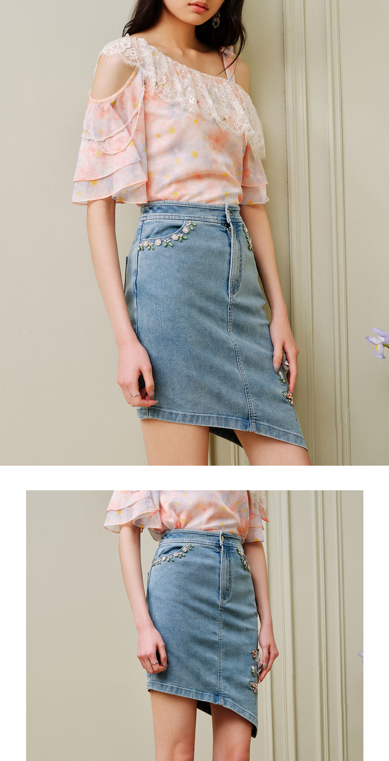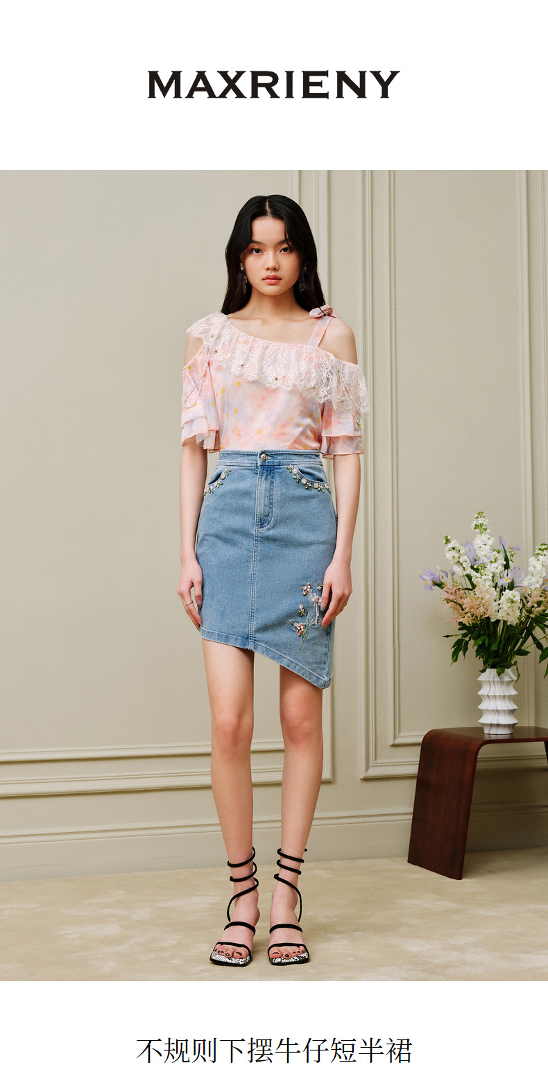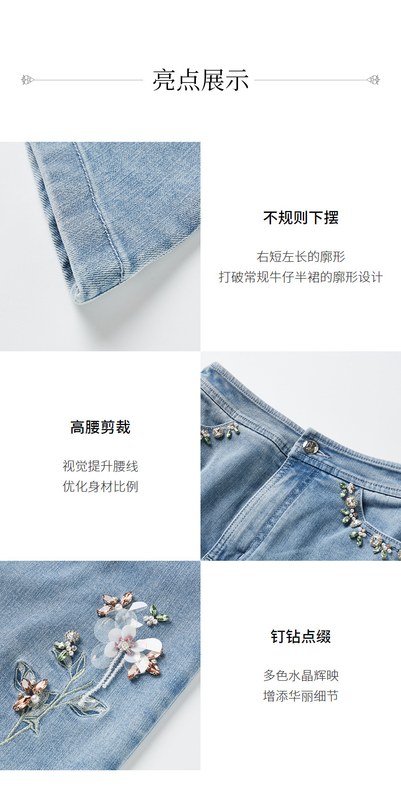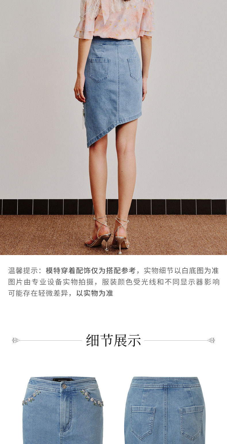 MAXRIENY不规则下摆牛仔短裙高腰廓形钉钻半身裙(货号:MC88SK310)
