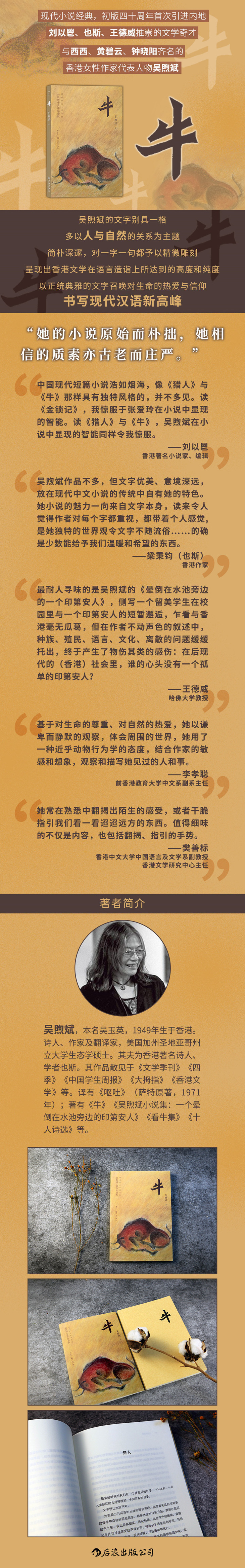 《牛》1980年由素叶出版社首次出版,收入短篇小说9篇;2016年由牛津大学出版社再版,增加《信》《一个晕倒在水池旁边的印第安人》;本书为初版四十周年纪念版,经作者重新校订,加入《蝙蝠》、作者后记。全书共计11篇小说,并有刘以鬯作序、梁秉钧作跋。小说多以自然与人的关系为主题,充满灵性,文字优美。目 录
