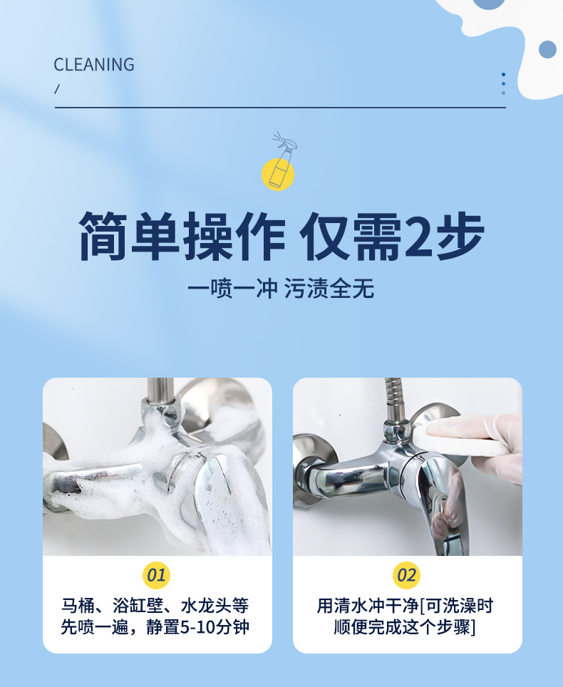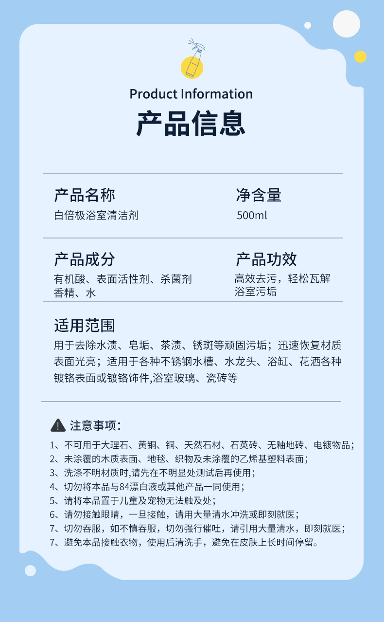 【注意事项】不能除铁锈,不可用于大理石,切勿将本品与84漂白液或其他洁厕产品一起使用