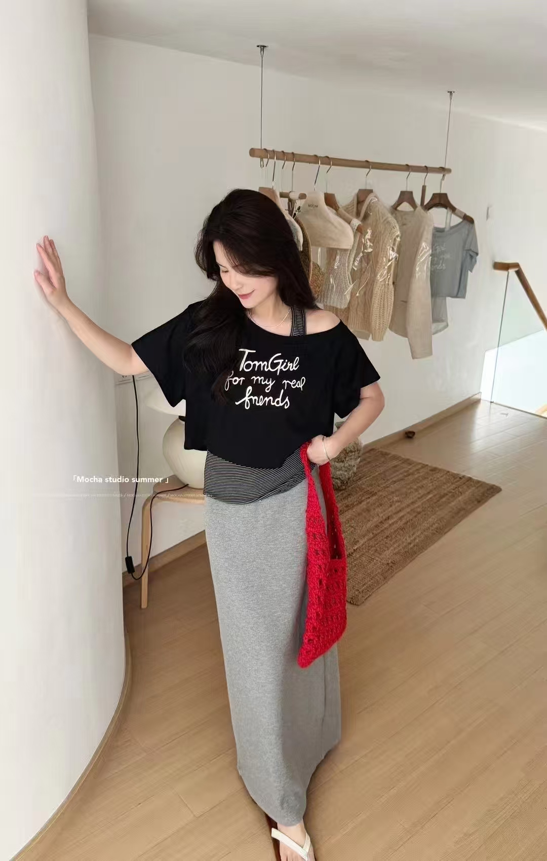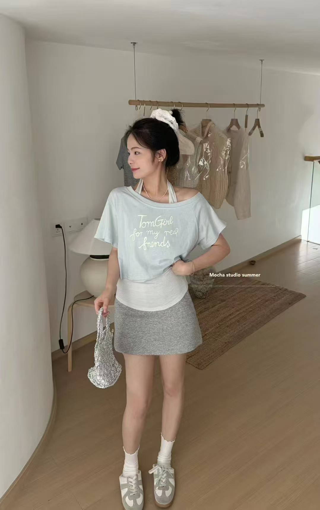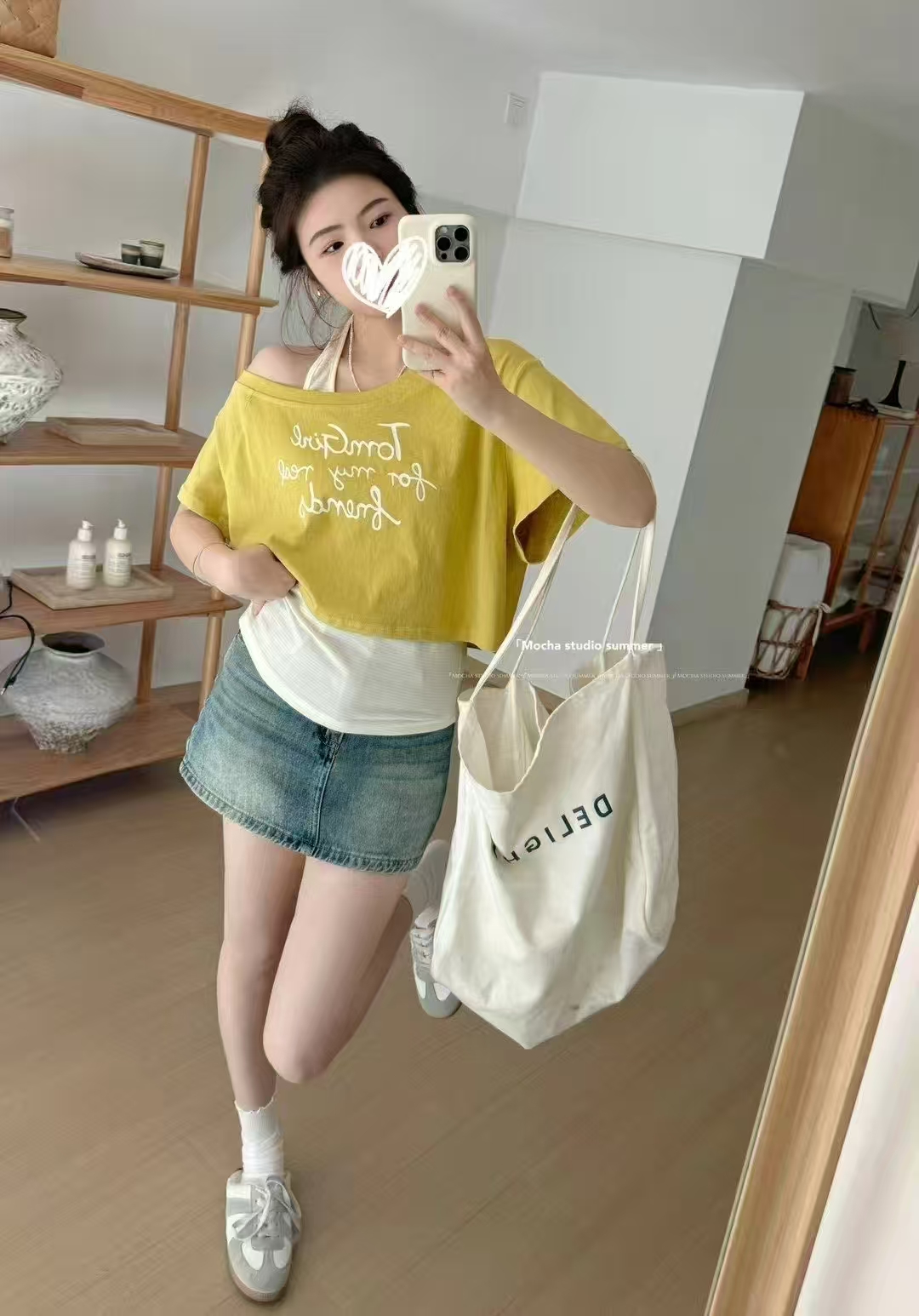 【GZ】无忧购韩版时尚百搭显瘦斜领露肩短袖T恤真两件套1128(截单后3-5天发货)