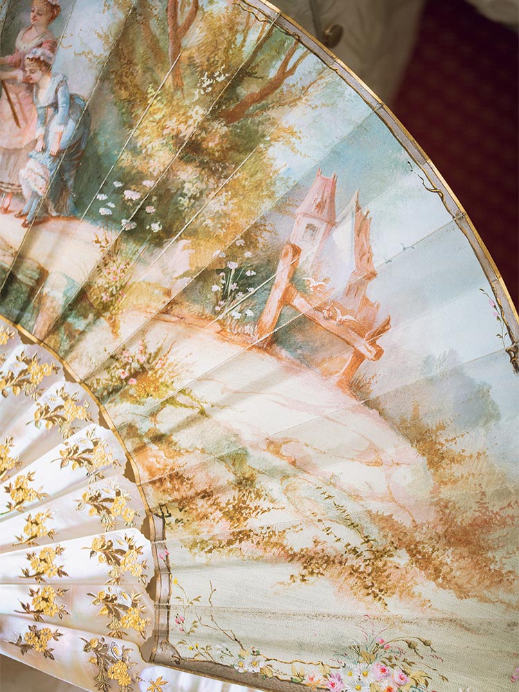 【已售】独角鹿西洋古董 1890年代法国Duvelleroy工坊签名创作描金母贝镂雕扇骨装饰钓鱼时光主题手绘扇面双面折扇