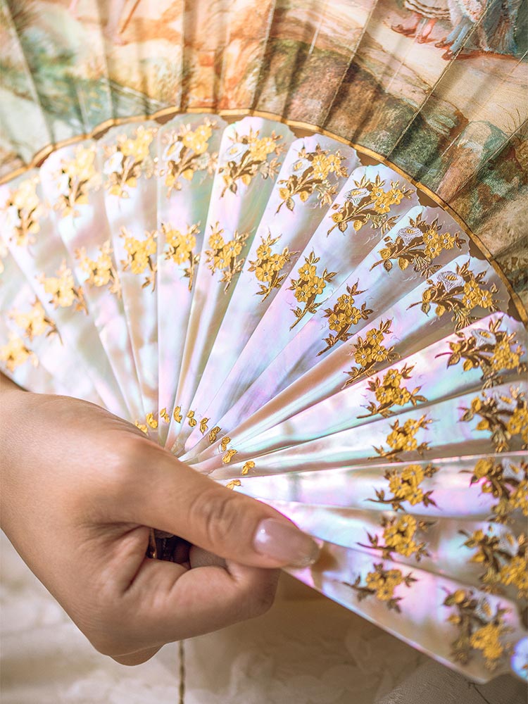 1890年代法国Duvelleroy工坊签名创作描金母贝镂雕扇骨装饰钓鱼时光主题手绘扇面双面折扇