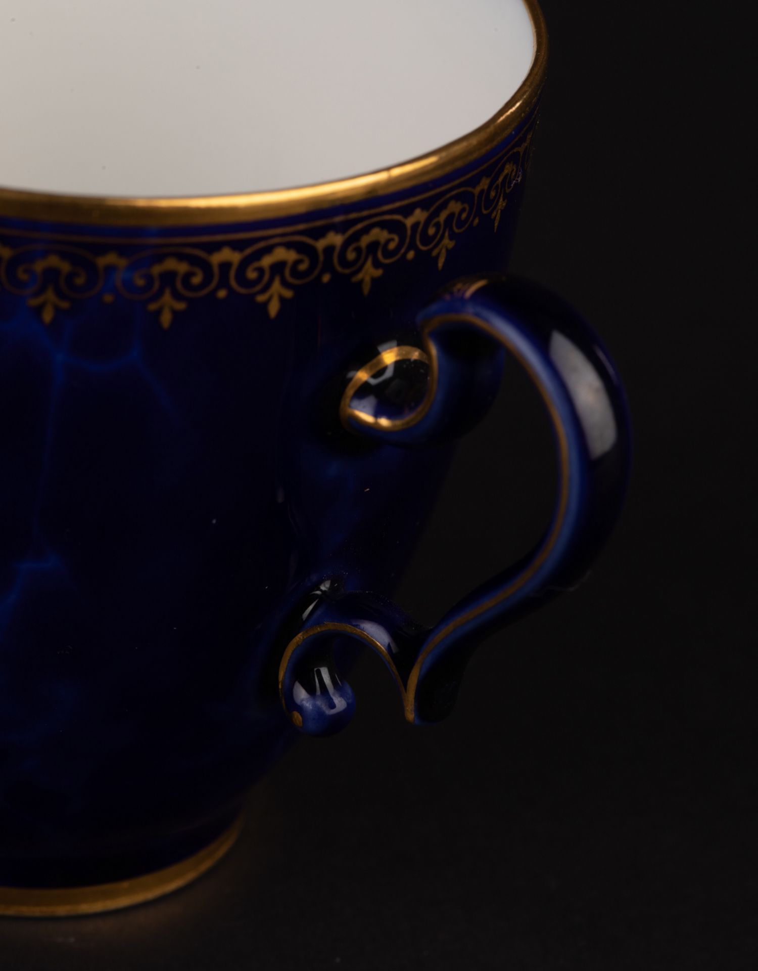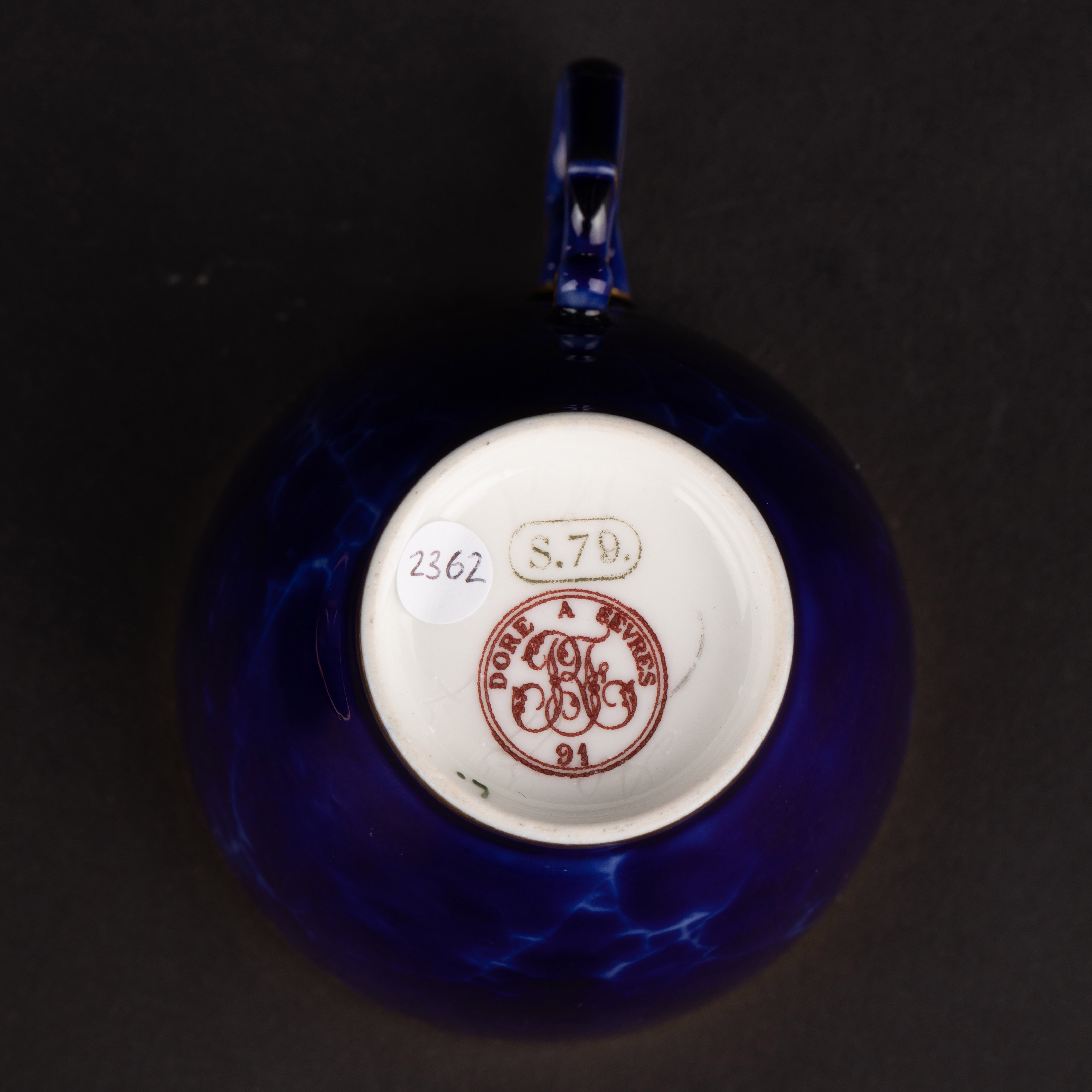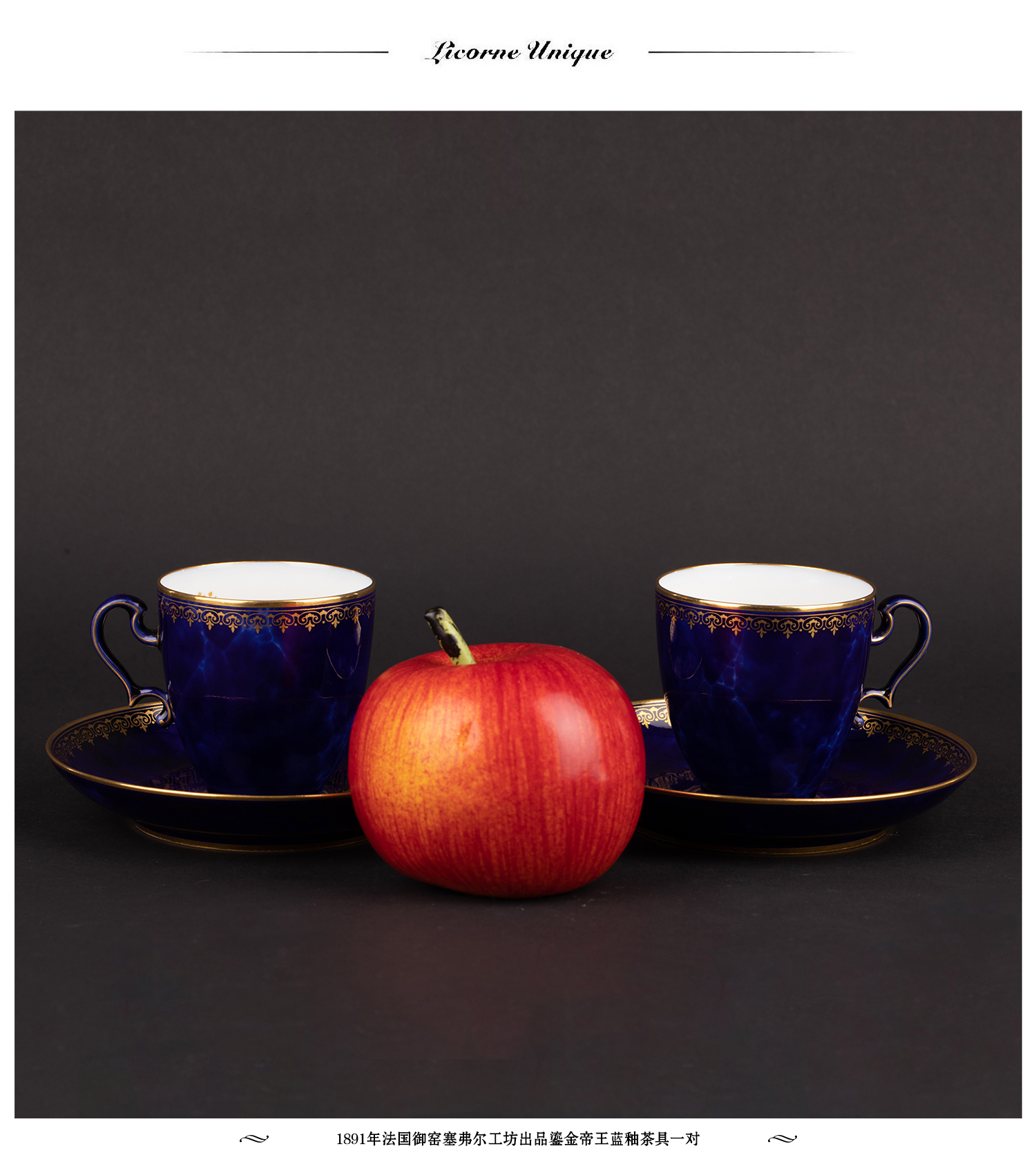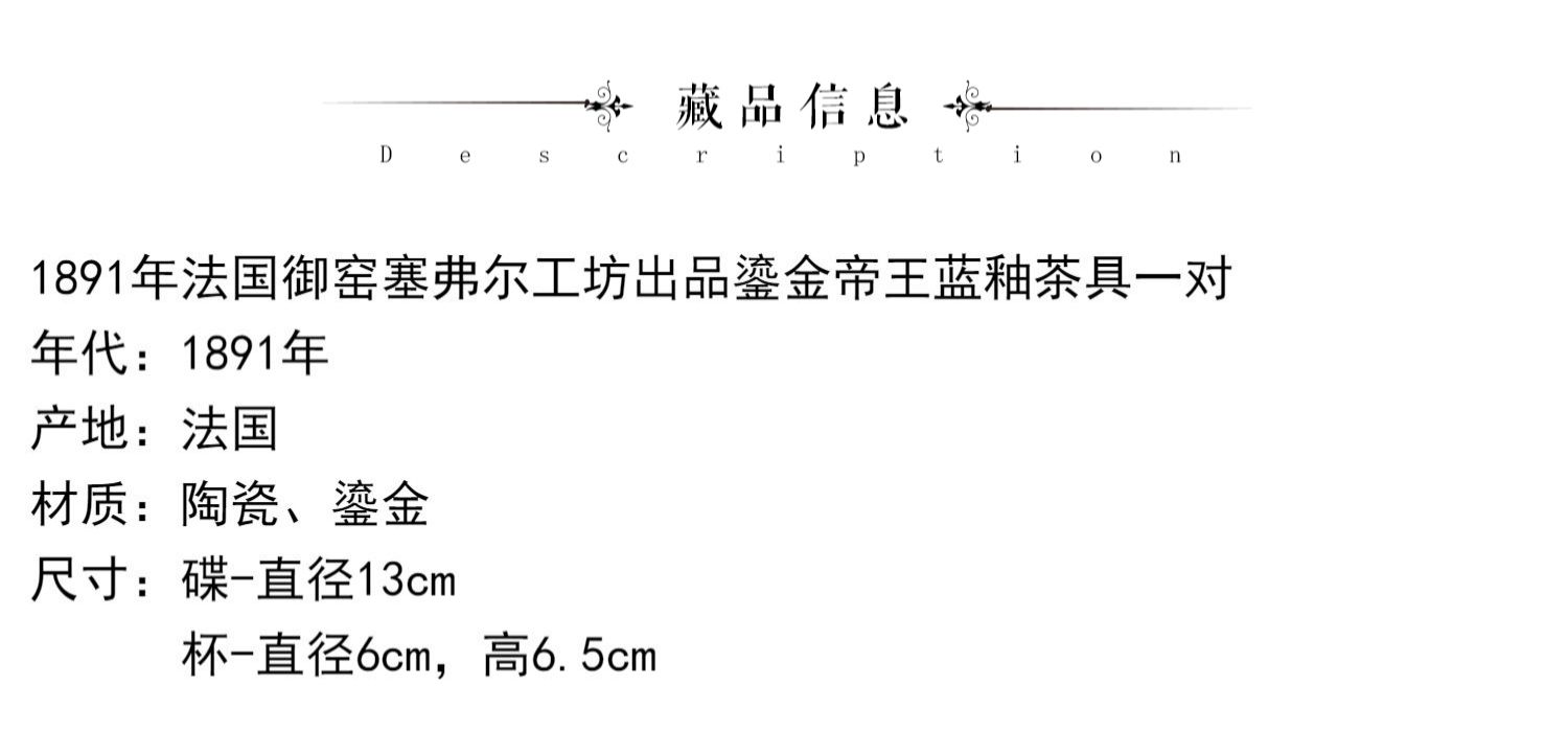 独角鹿西洋古董1891年法国御窑塞弗尔工坊鎏金帝王蓝釉茶具一对