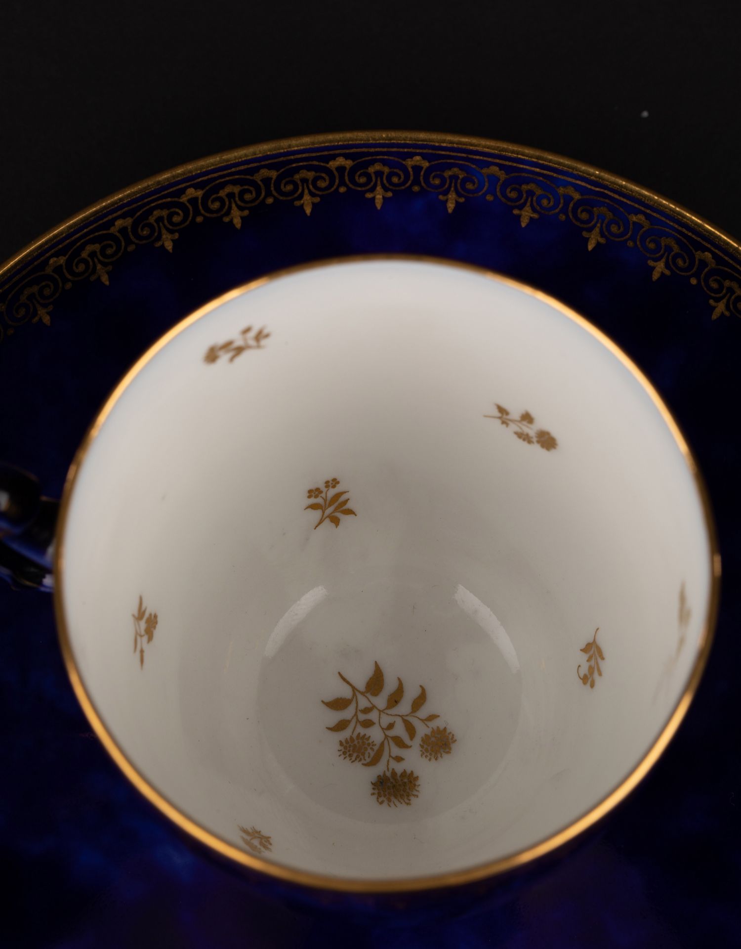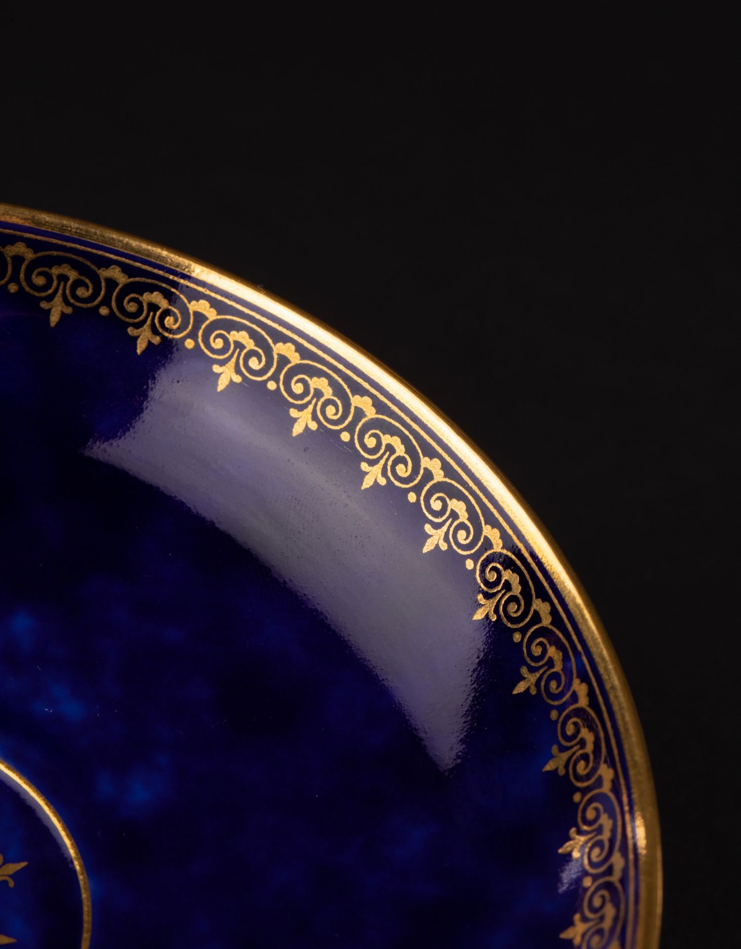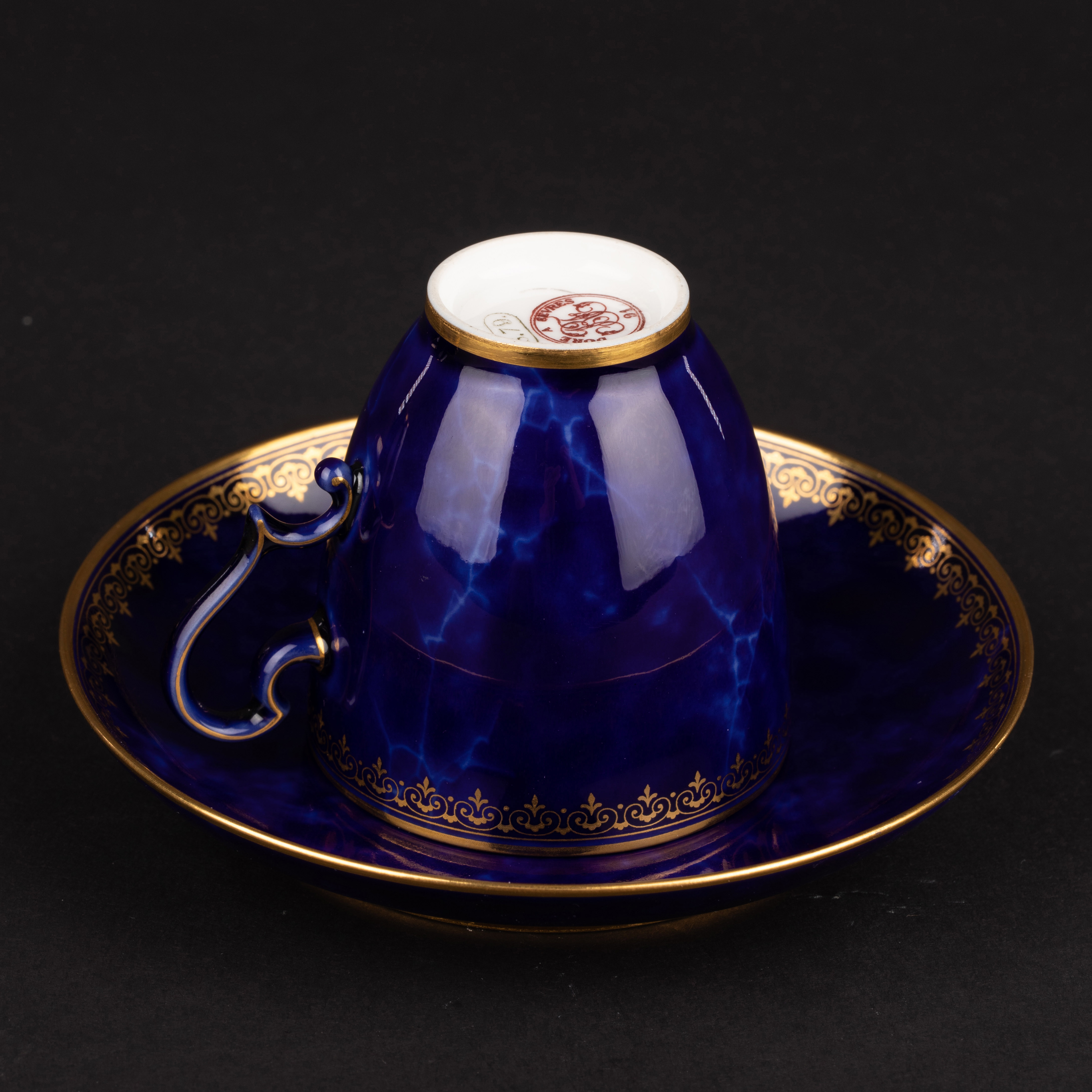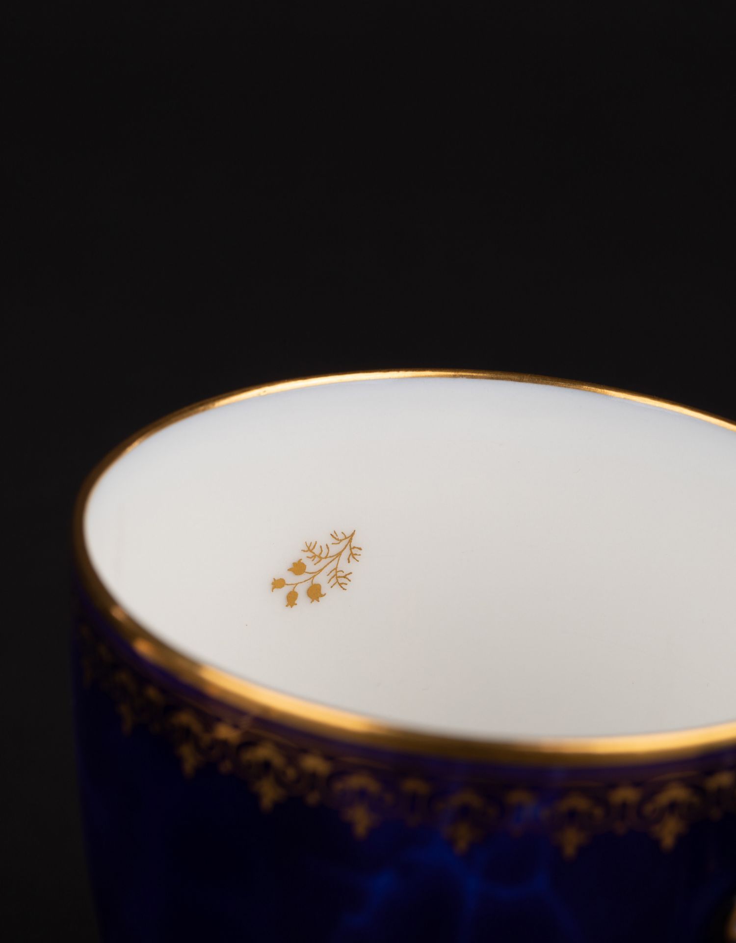 独角鹿西洋古董1891年法国御窑塞弗尔工坊鎏金帝王蓝釉茶具一对