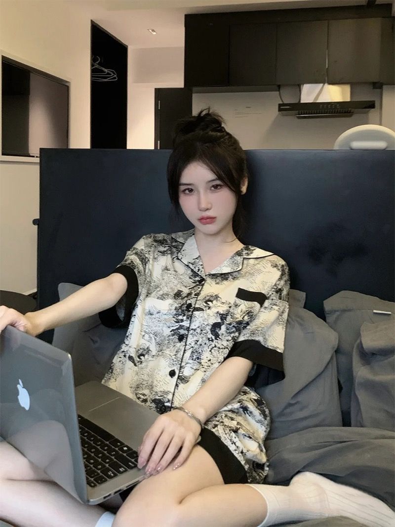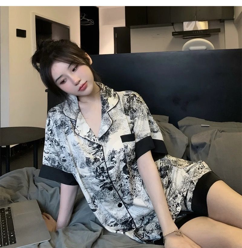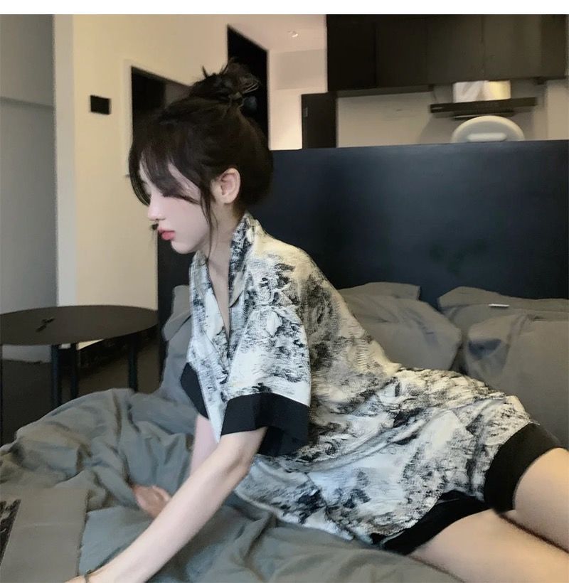 【中式美学❗水墨家居套装】甄选细腻缎面面料,触感丝滑如绸,垂坠感十足,上身轻盈不闷汗,融合东方美学与现代潮流,自带清冷高级感,睡衣女夏季新款ins甜美风,薄款短袖家居服套装潮L