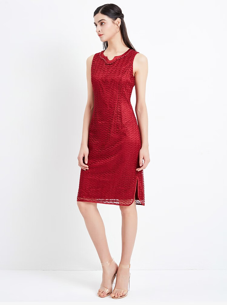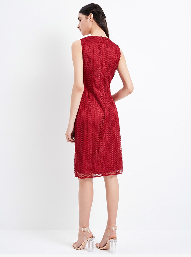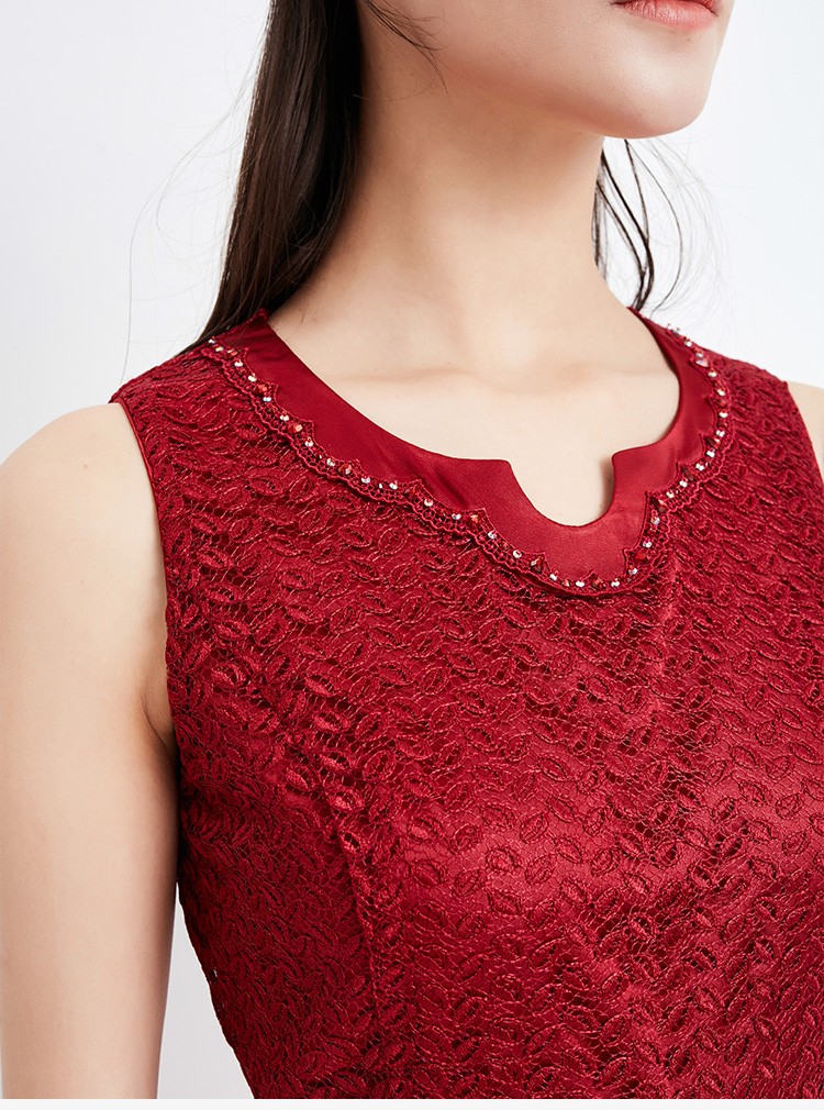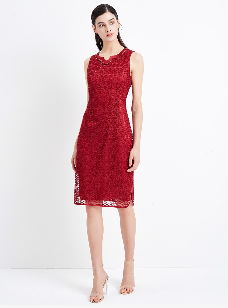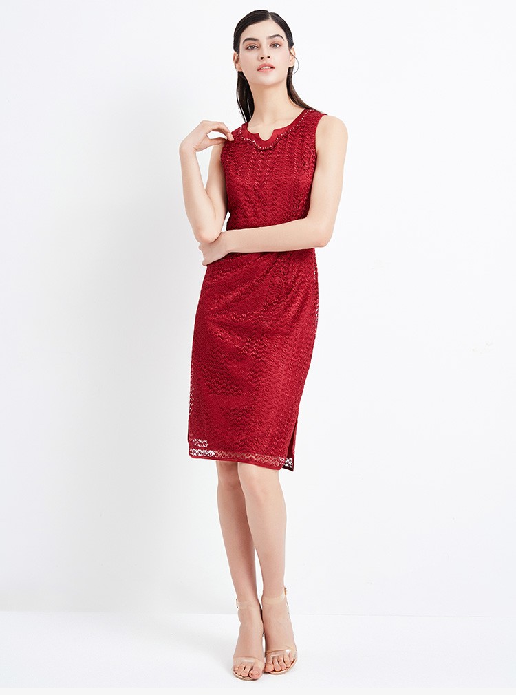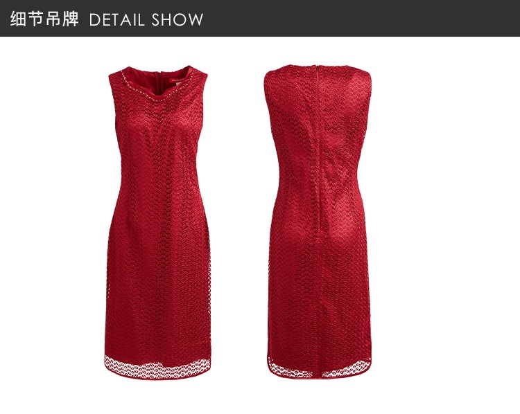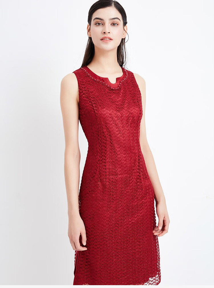 皮尔卡丹女装季新款红色无袖圆领连衣裙气质时尚A字裙女