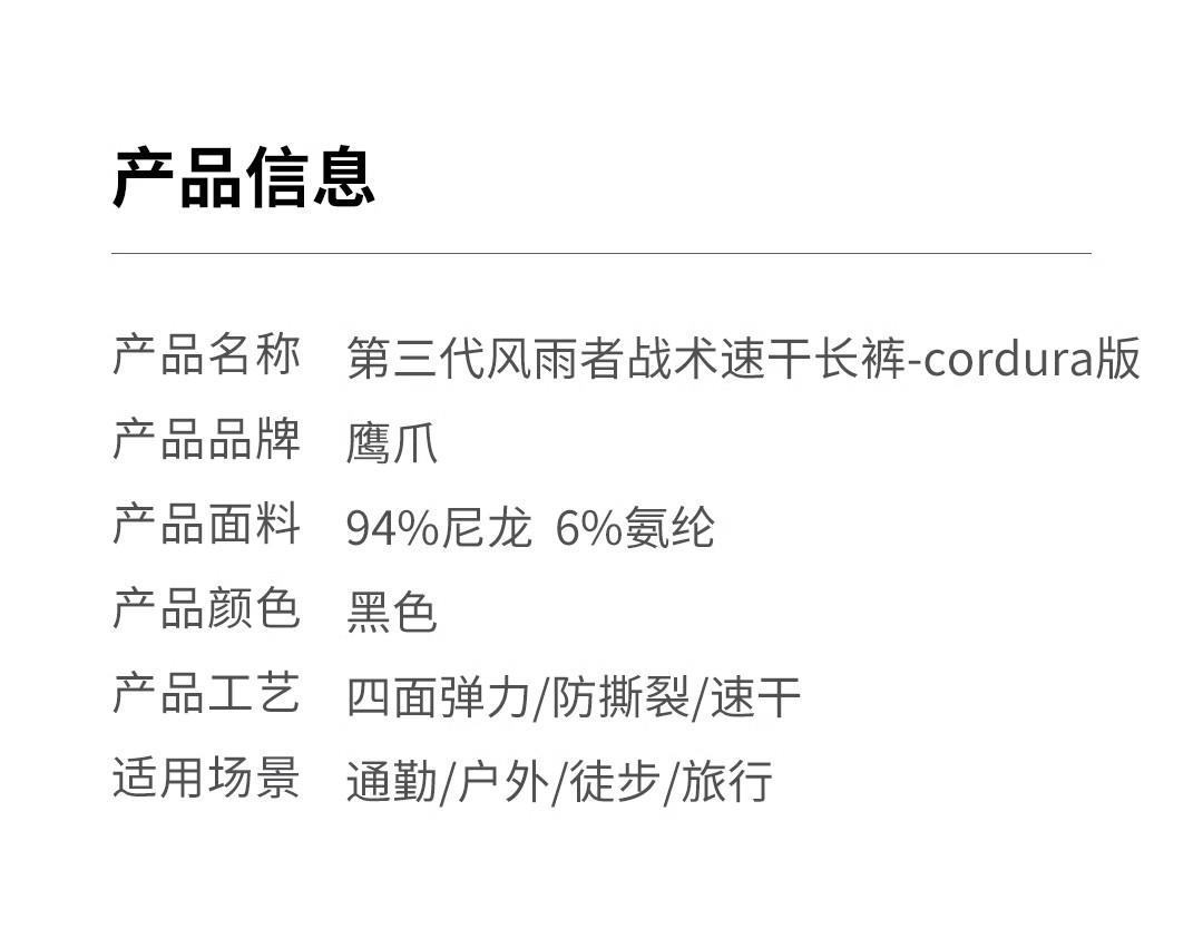 鹰爪三代风雨者考杜拉CORDURA战术速干长裤男户外徒步运动休闲裤