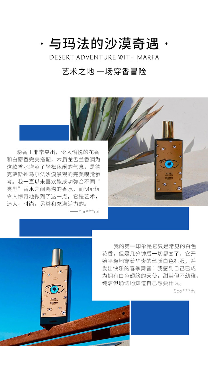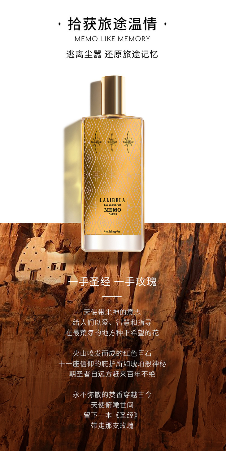 “在草原闻日暮袅袅,在山林闻生命复苏,在湖海闻万物归宁,在宫殿闻苍穹下沉,在都市闻尘嚣之外,Memo Paris,是无数场来自嗅觉的冒险,以每一段旅途的回忆为灵感,用香水让灵魂与目的地再次相遇。”