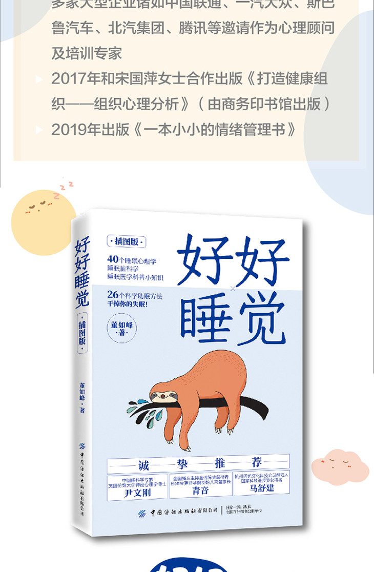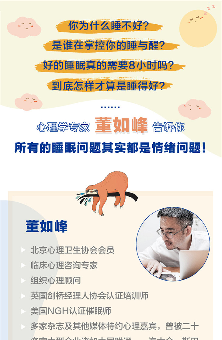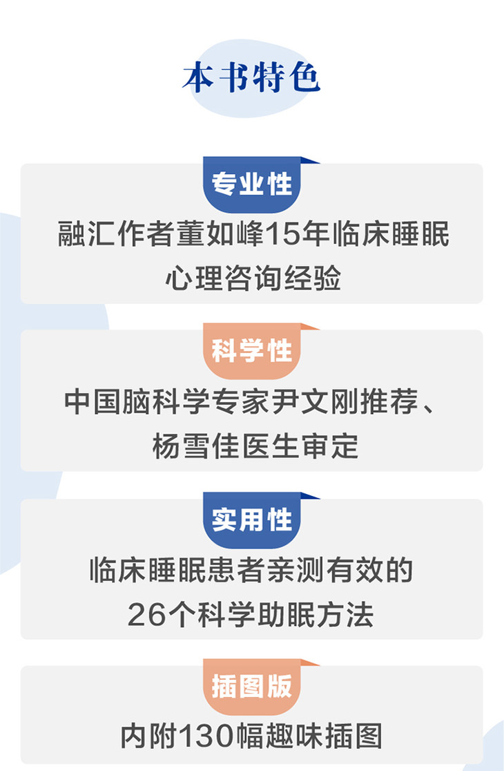 3.专业作者:作者董如峰拥有15年临床心理咨询经验,接待过大量的睡眠困扰患者,书中的助眠方法都曾被来访者运用过并反馈良好