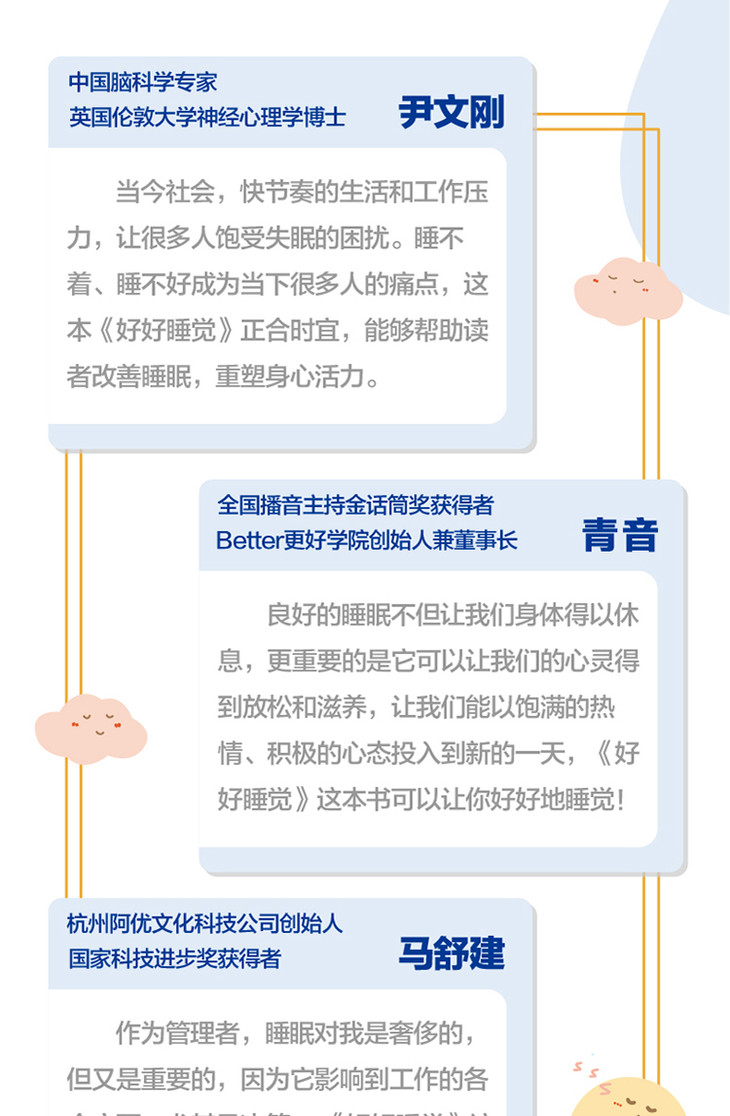 《好好睡觉》以图文并茂的形式介绍了20条科学助眠方法,40条睡眠心理学、睡眠脑科学和睡眠医学等方面的科普小知识,便于读者对睡眠的深刻认识。除此之外,还指出了我们日常生活中常见的一些睡眠误区,旨在帮助睡眠困扰者科学助眠。
