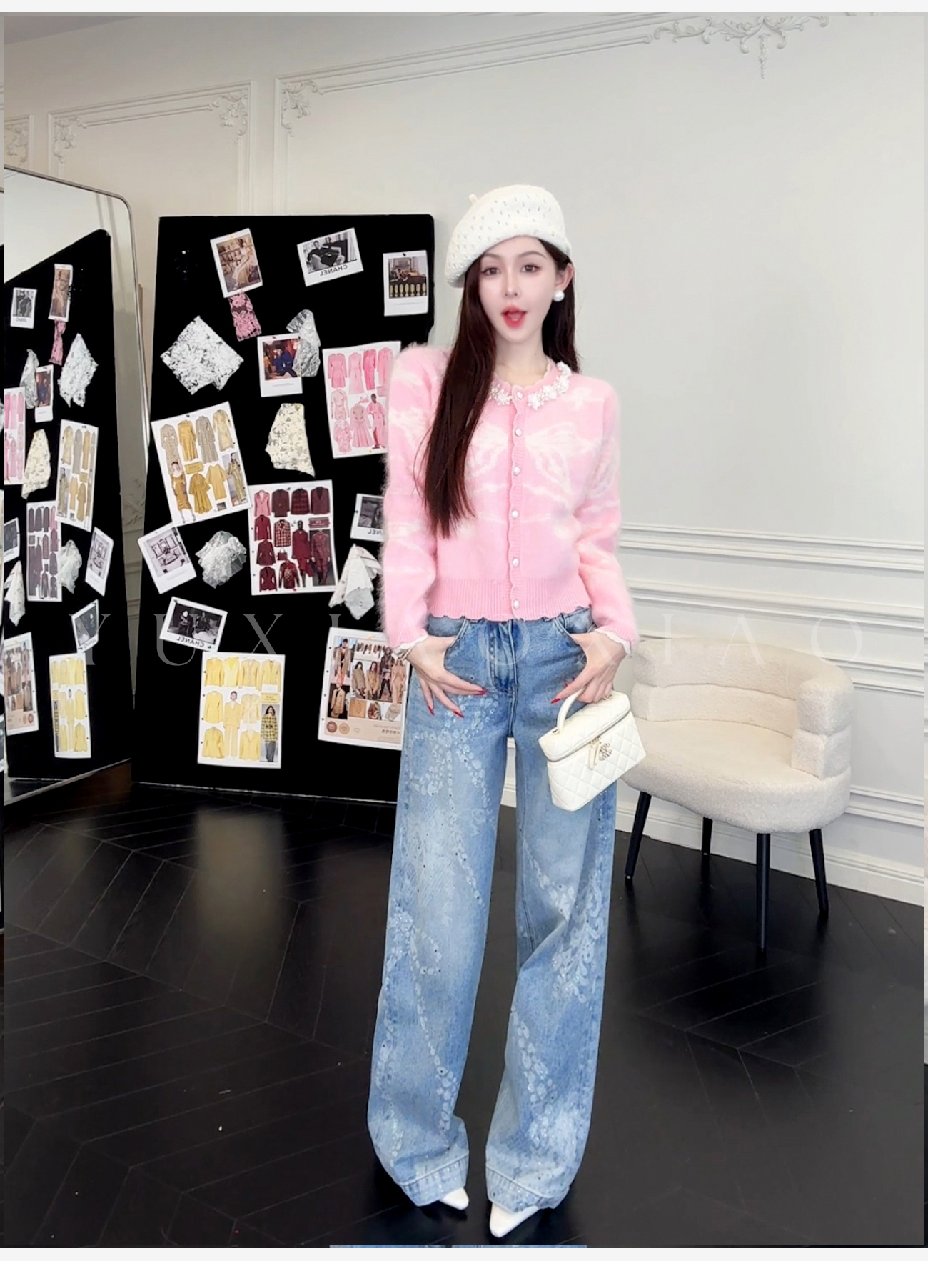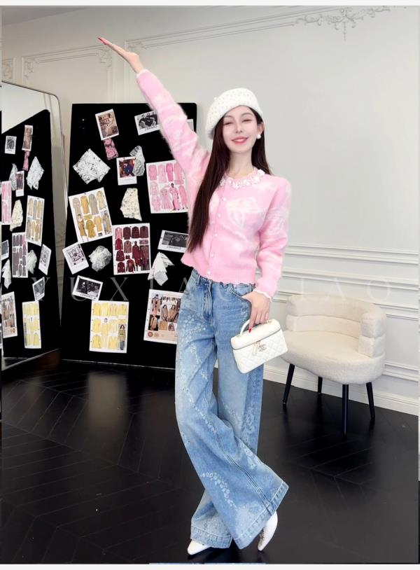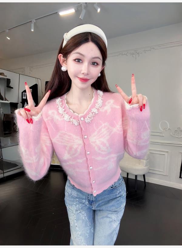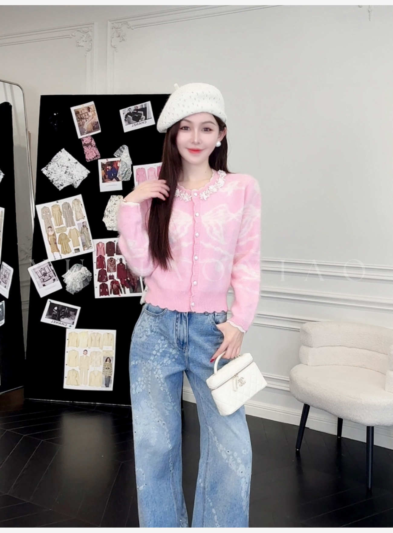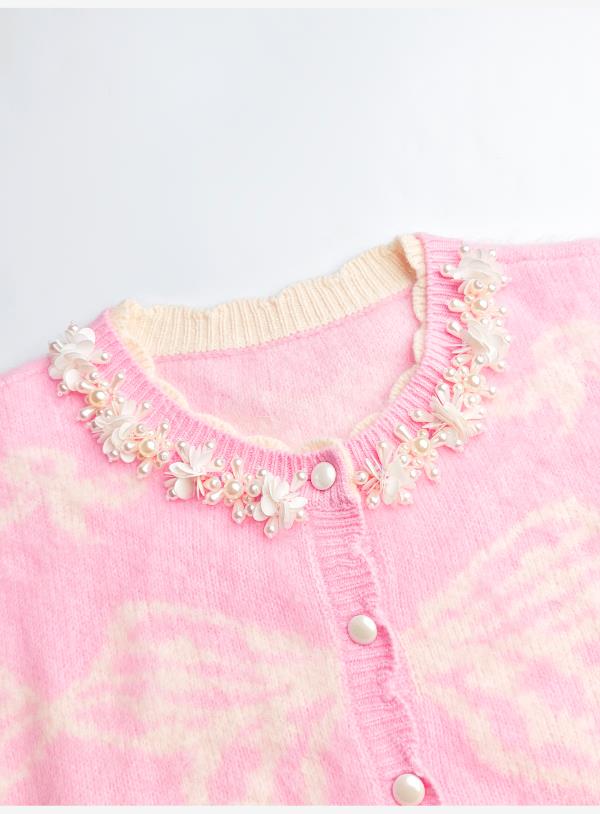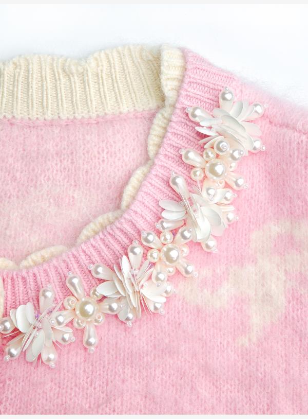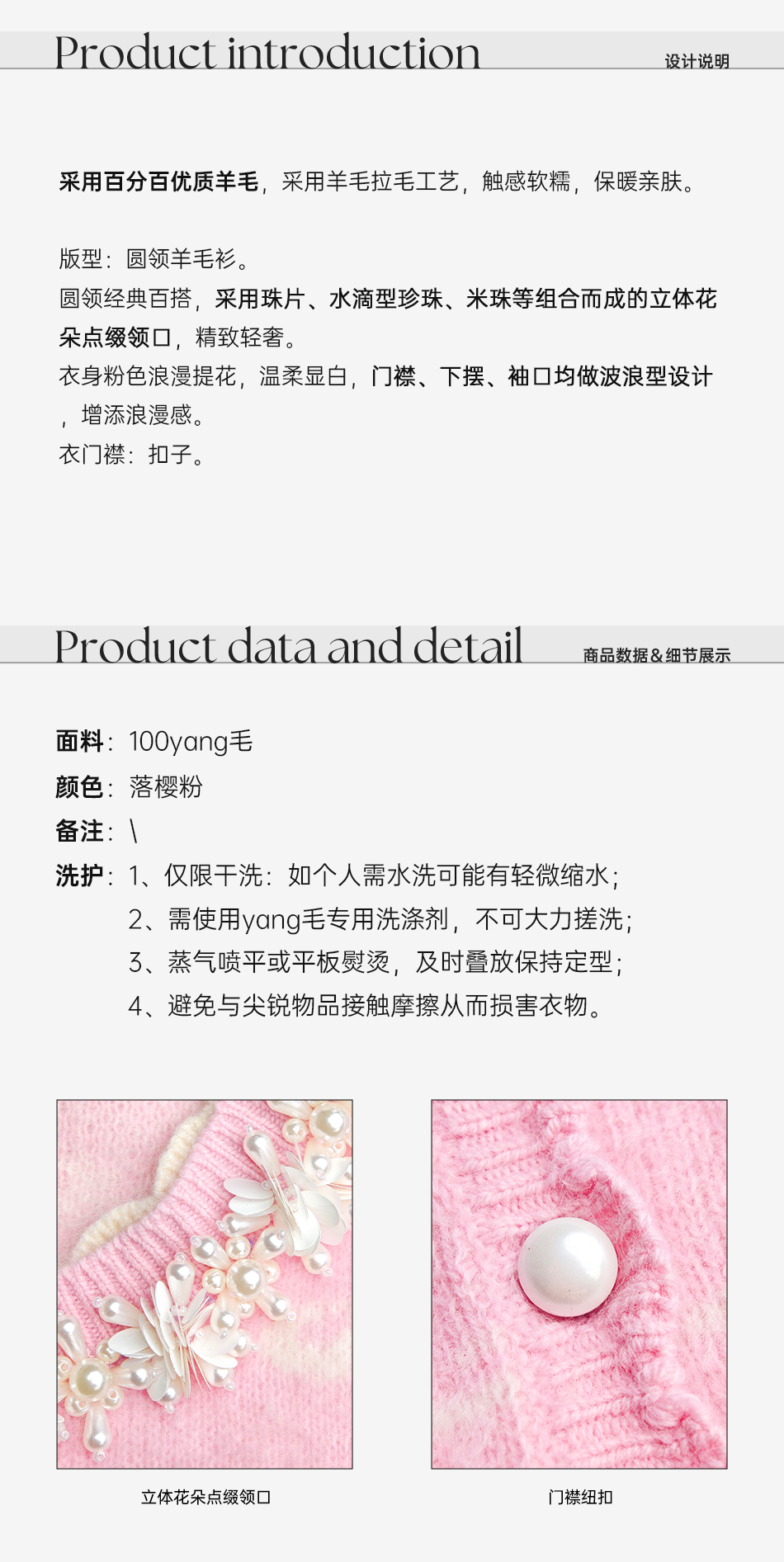 余潇潇【甜心爱丽丝】柔软亲肤100羊毛珠片珍珠立体花朵圆领羊毛衫