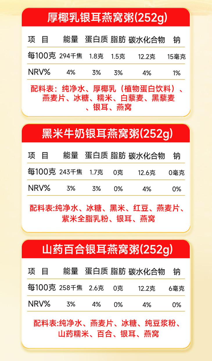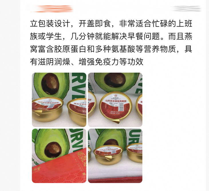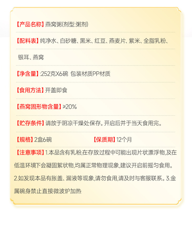 燕窝粥是🥣252g*6碗装,早餐代餐两相宜 精选印度尼西亚进口燕窝 搭配了银耳、山药、百合、燕麦等多种优质食材,精心熬制成粥 口感细腻,香甜可口,每一口都是满满的滋养与享受💖