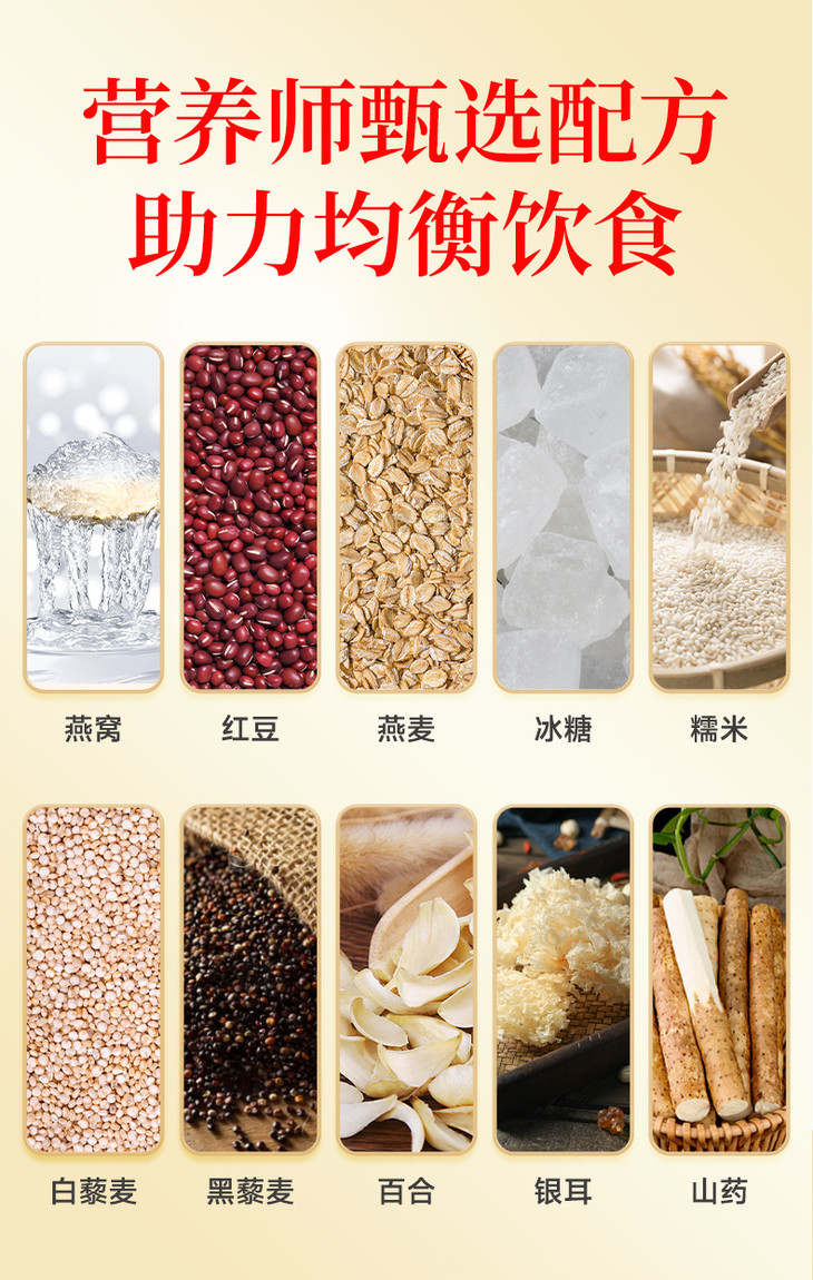 燕窝粥搭配的银耳富含天然植物胶质,山药、 百合,与燕窝共同作用,能起到更好的滋补效果