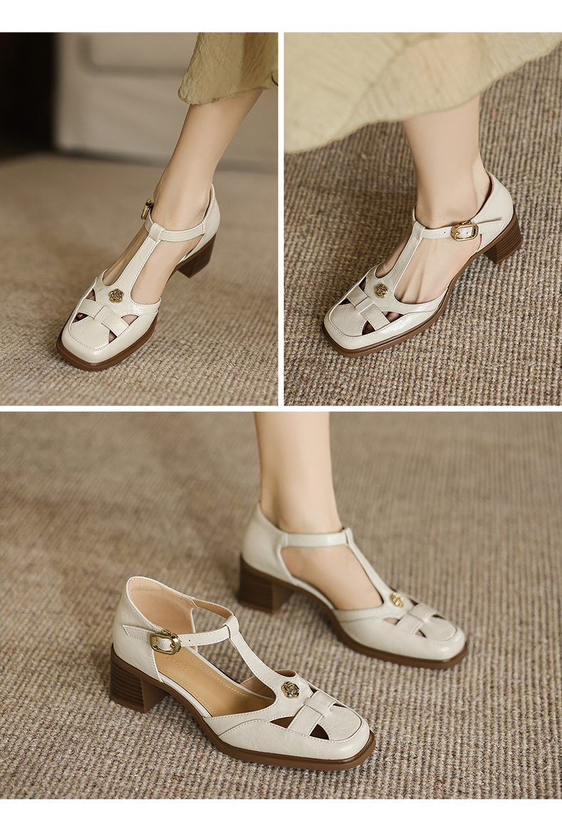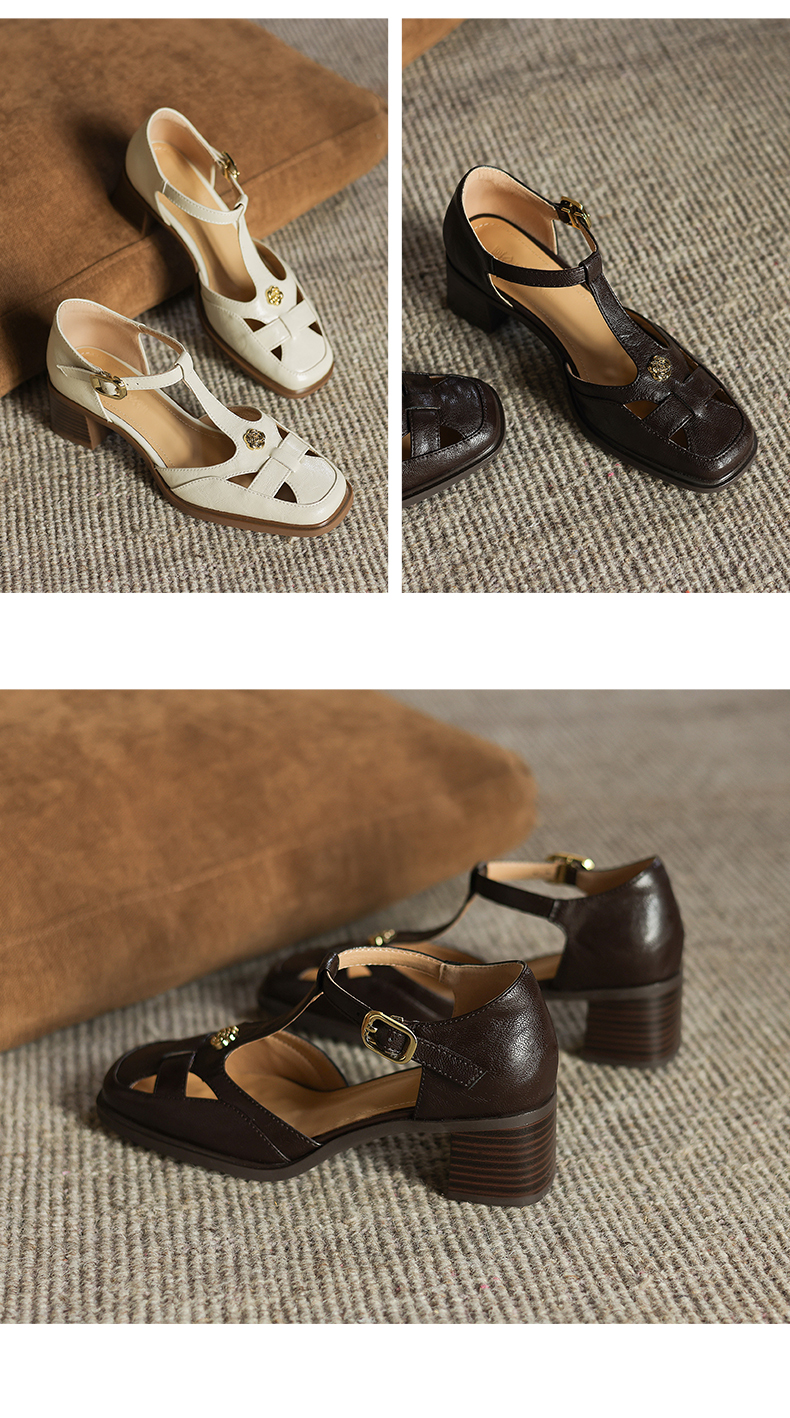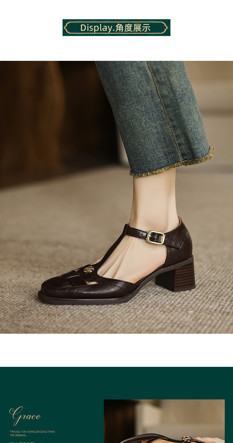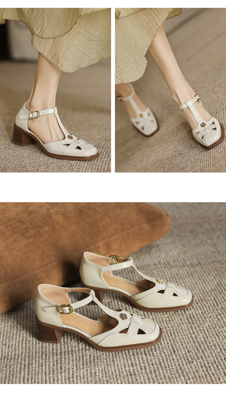 阿么手工女鞋包头粗跟凉鞋女夏外穿软底软面真皮镂空罗马鞋子5CM