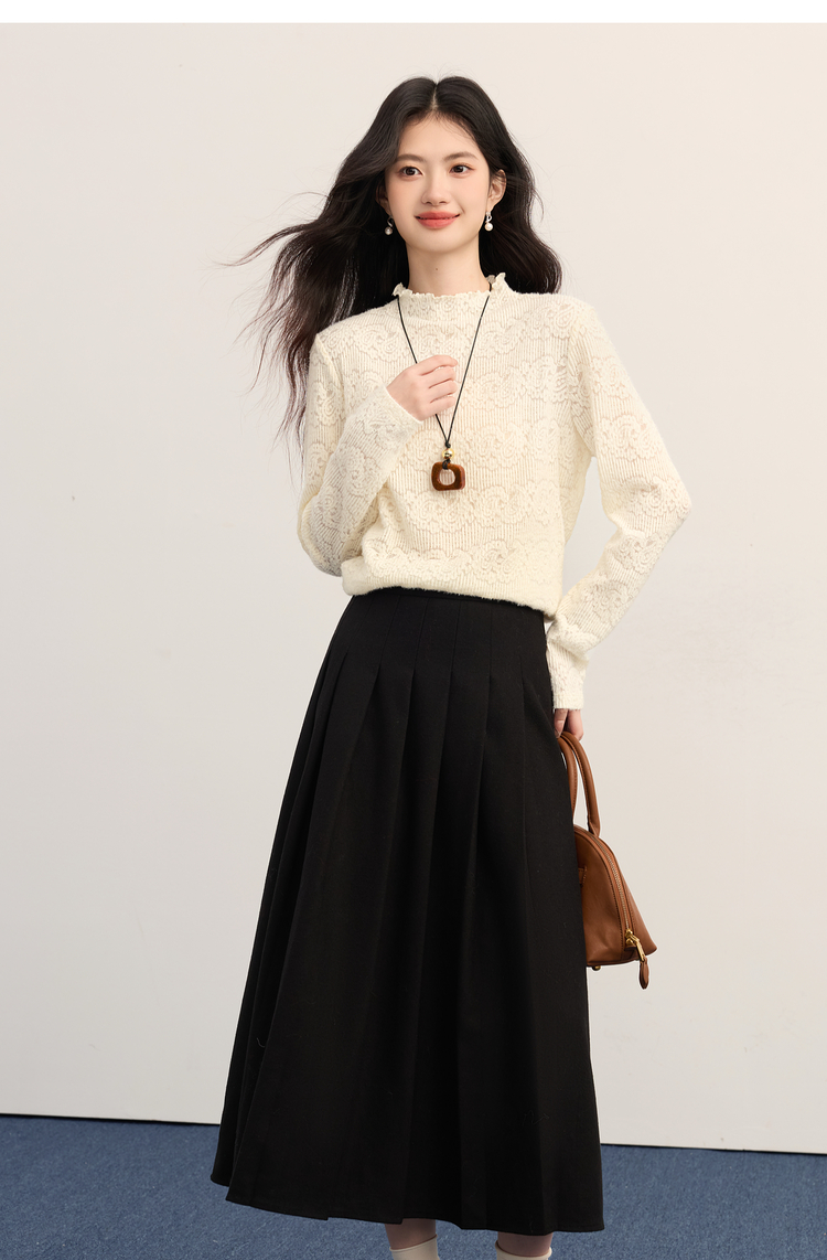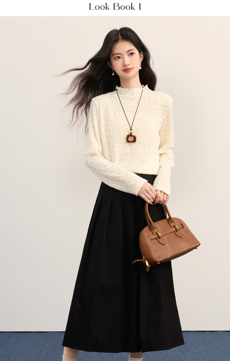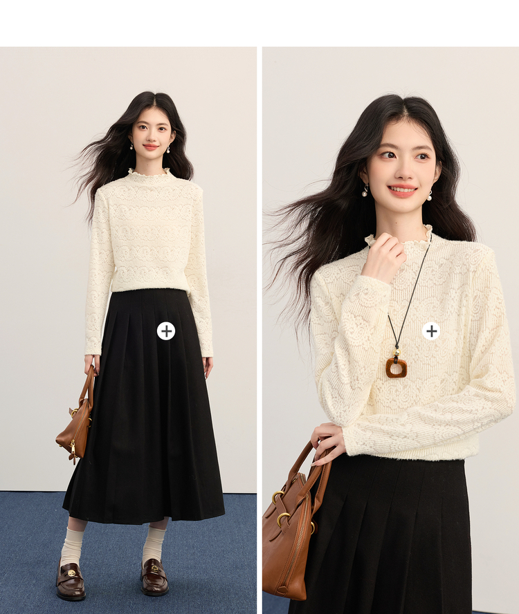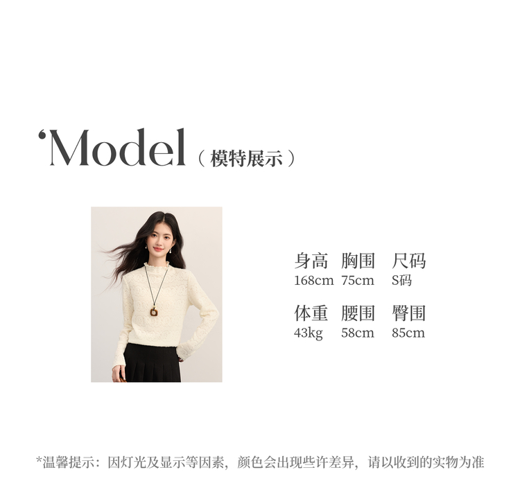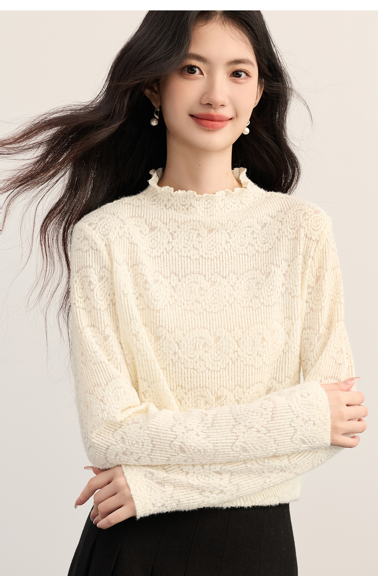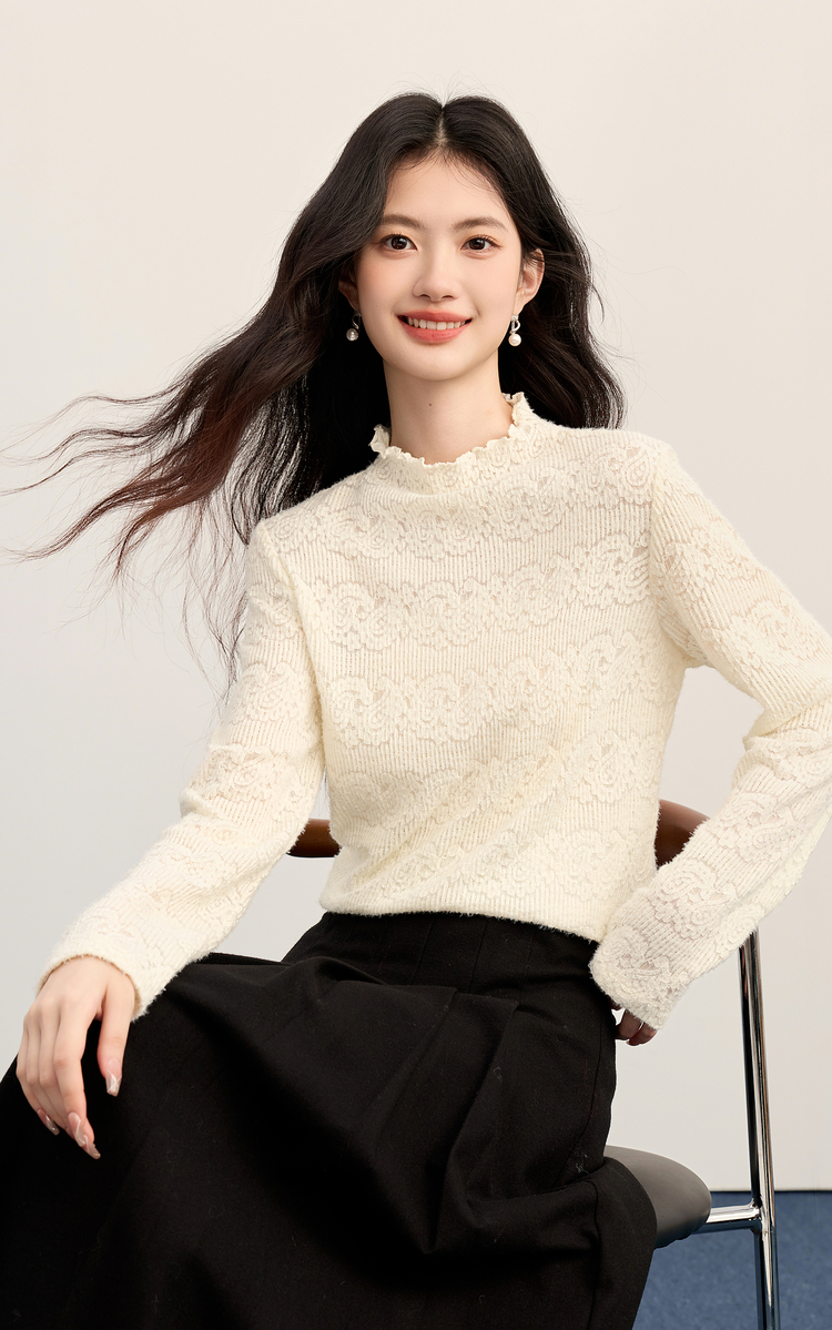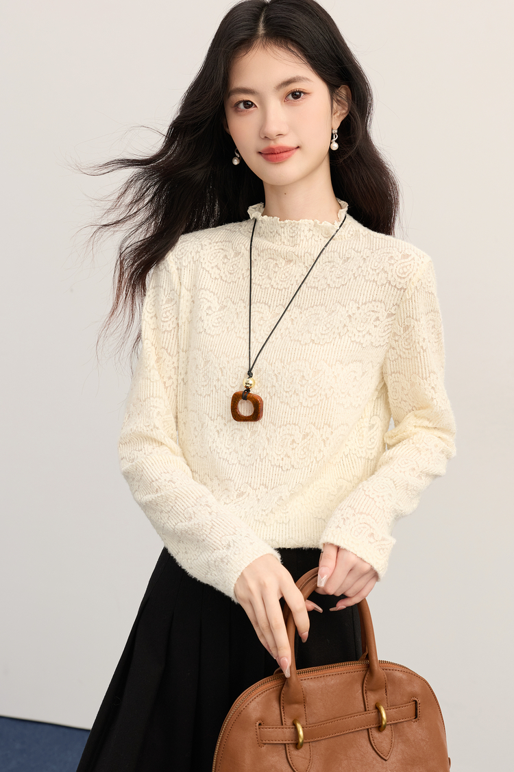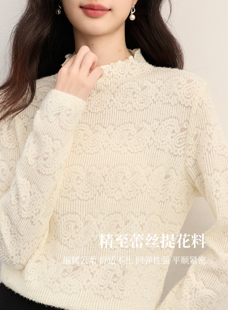 【11/26新品】熙世界法式杏色半高领蕾丝打底衫女2025秋冬新款气质内搭正肩上衣