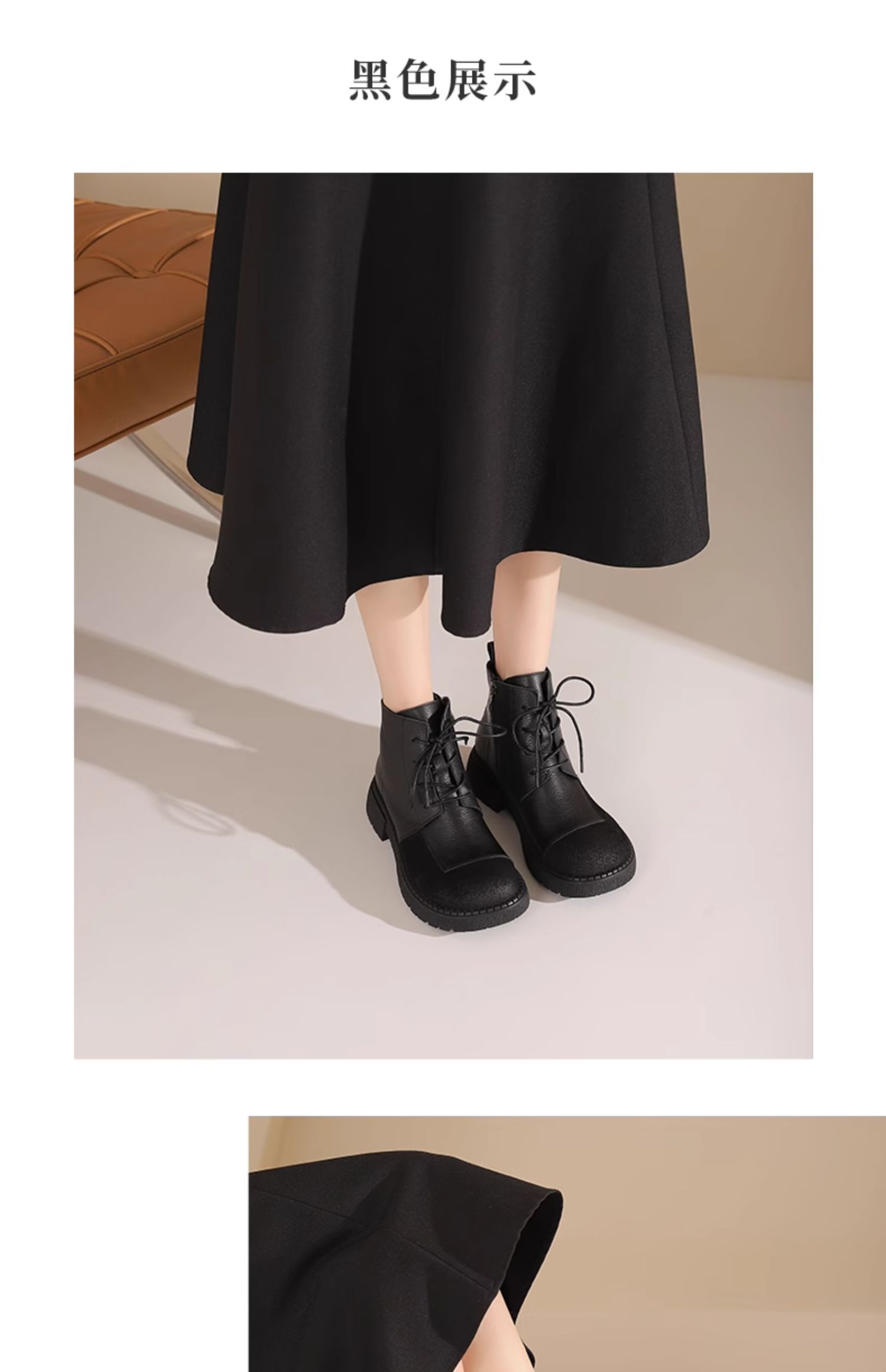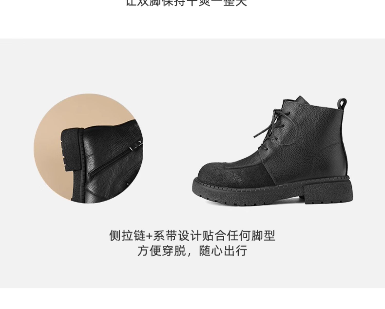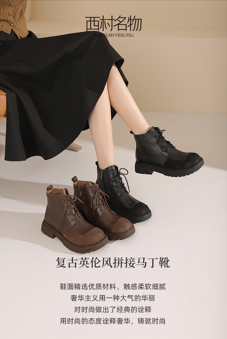西村名物2024秋冬新款复古厚底系带英伦风中跟真皮马丁靴女T24DS47821