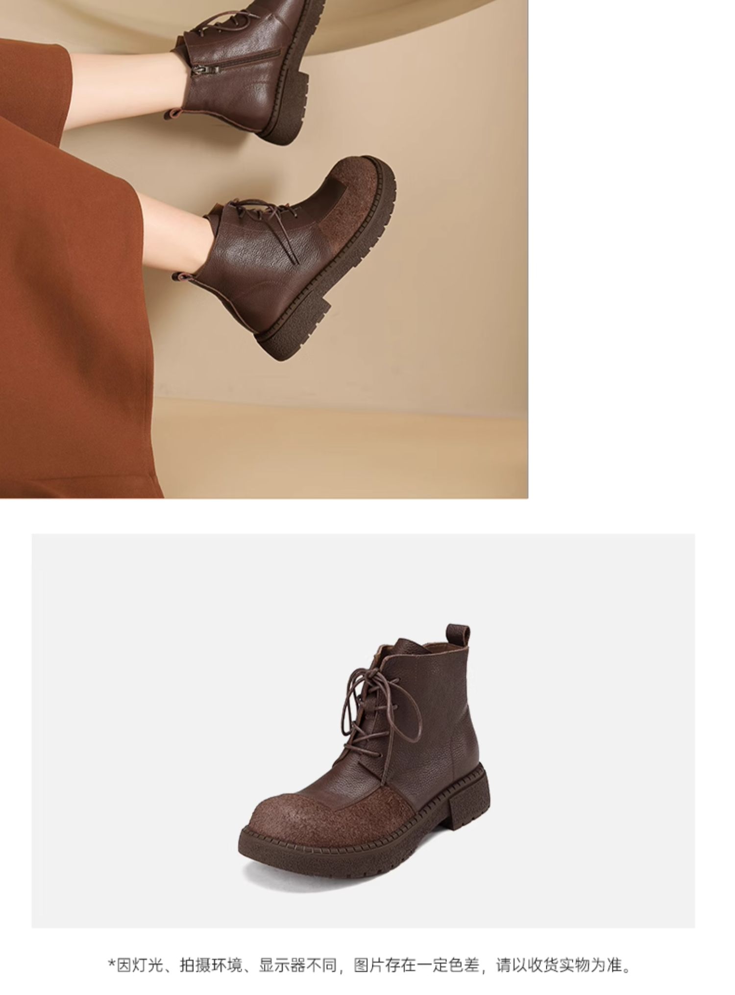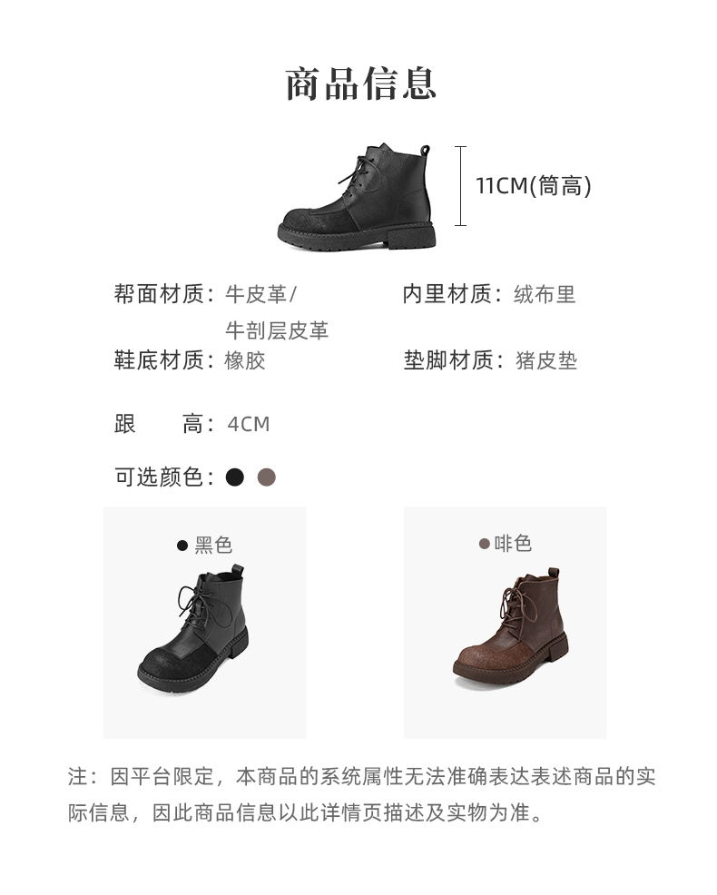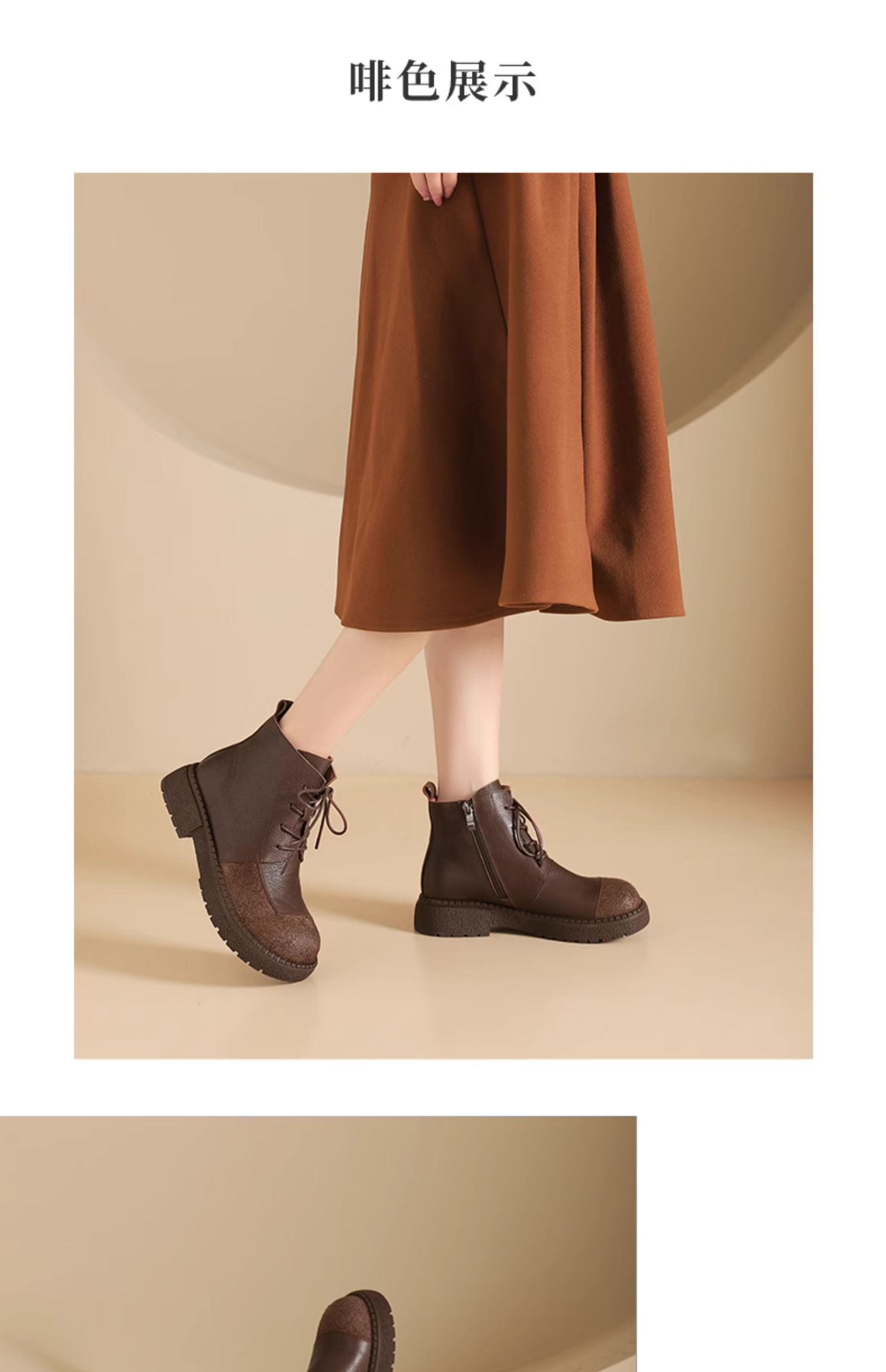 西村名物2024秋冬新款复古厚底系带英伦风中跟真皮马丁靴女T24DS47821