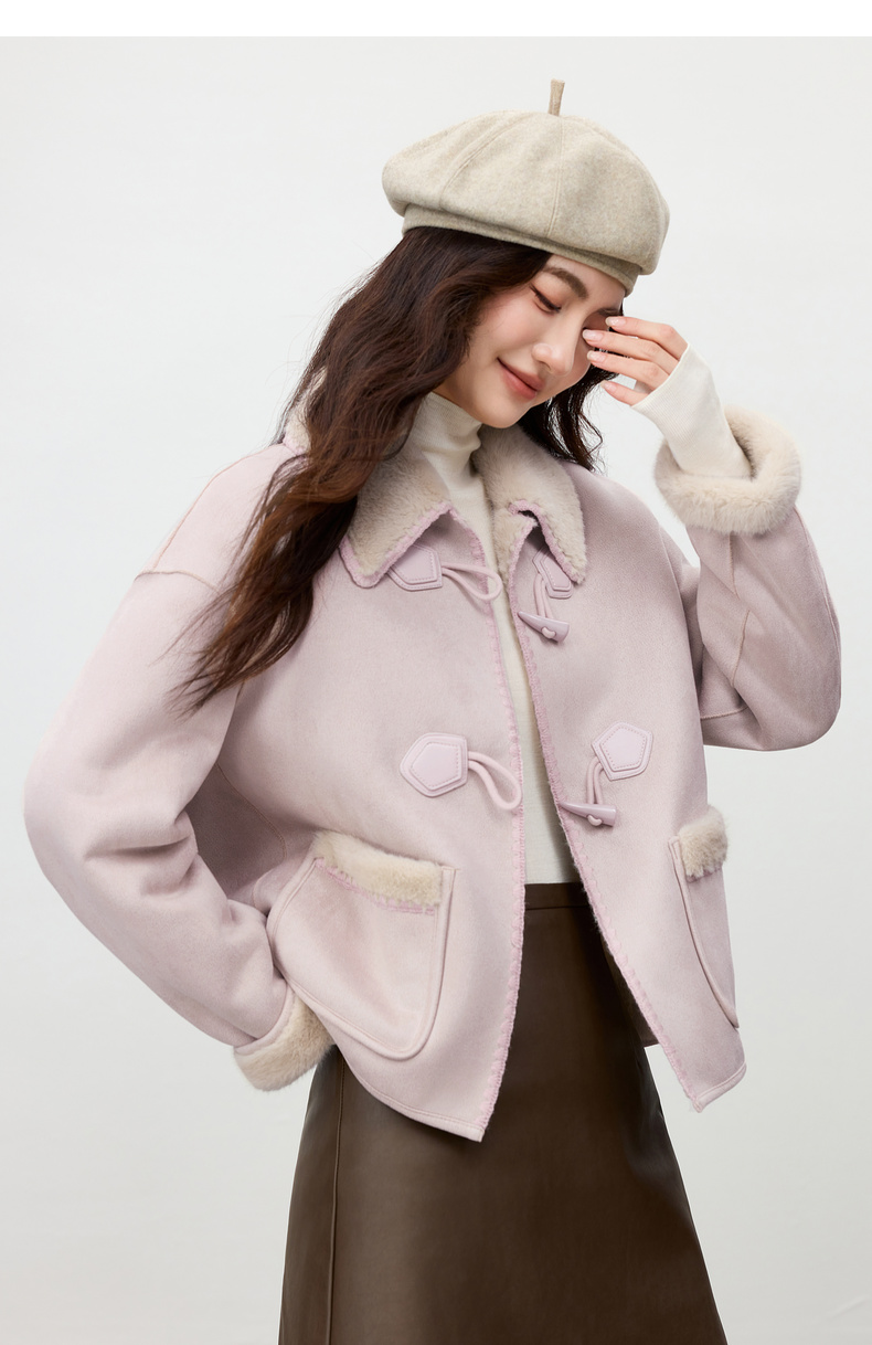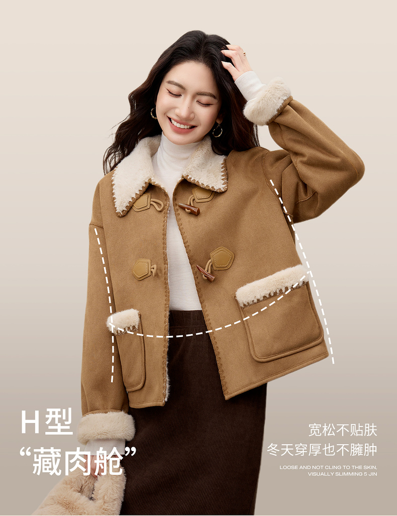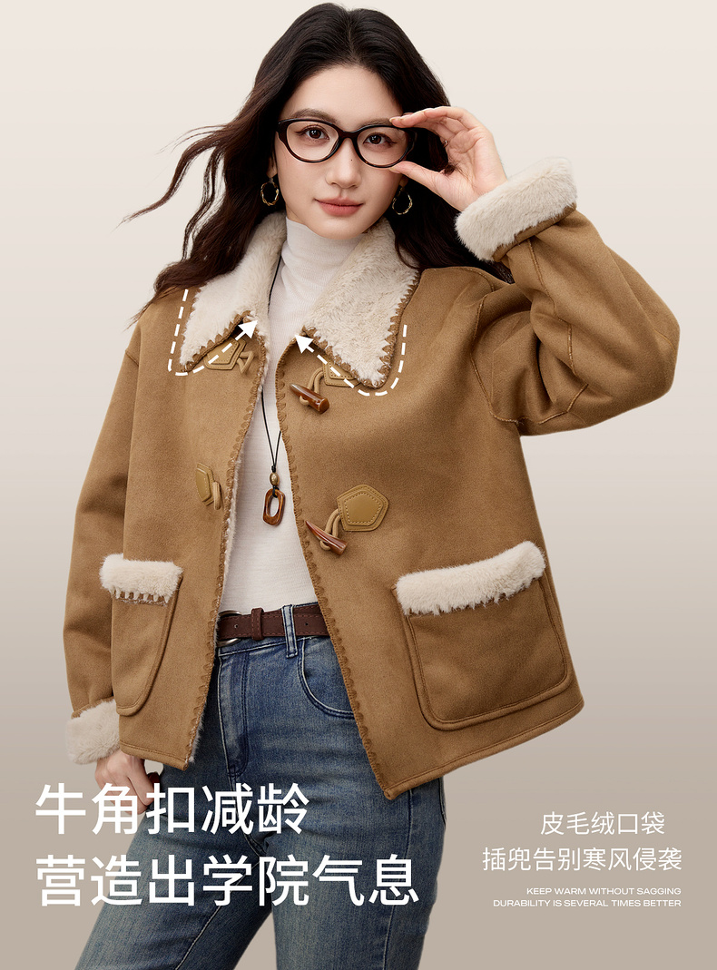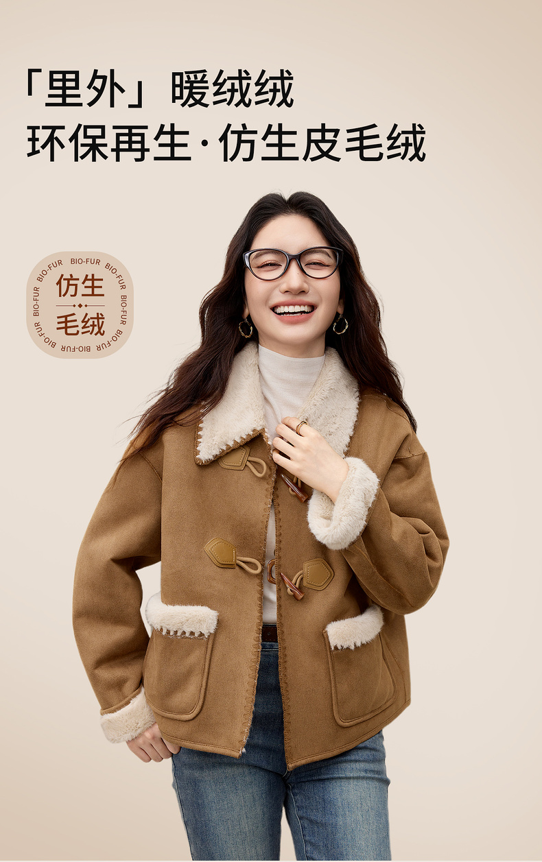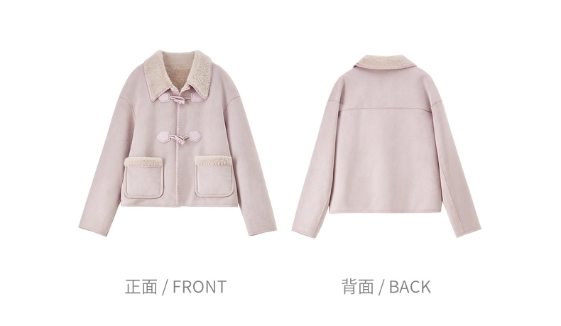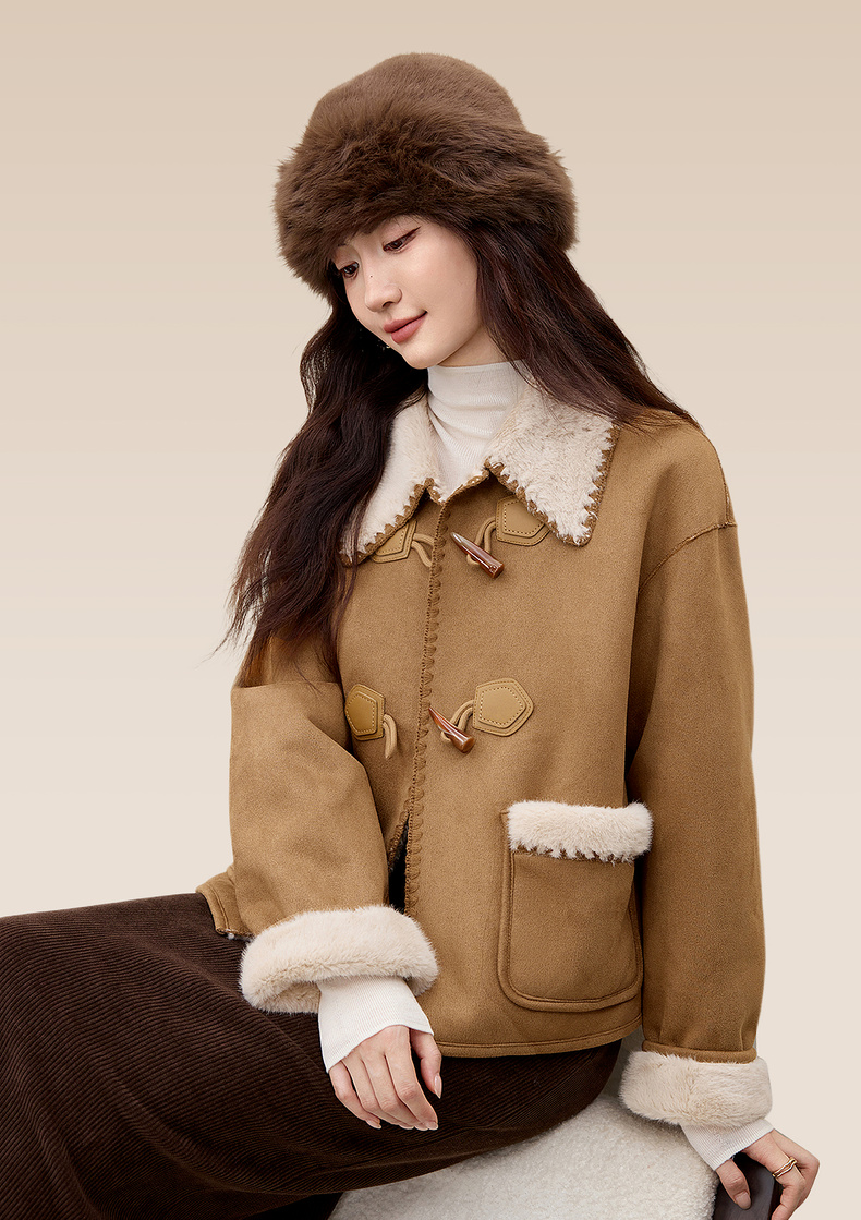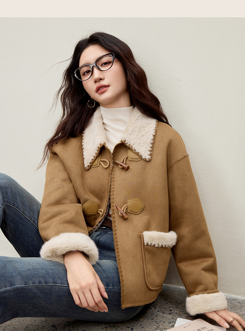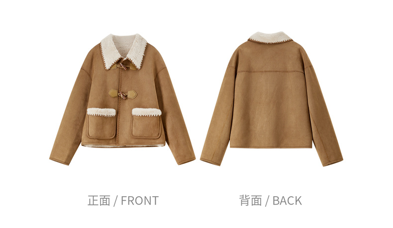【内购】【皮毛绒保暖】学院风撞色翻领牛角扣山峦专机线宽松落肩显瘦外套-W54PA4095