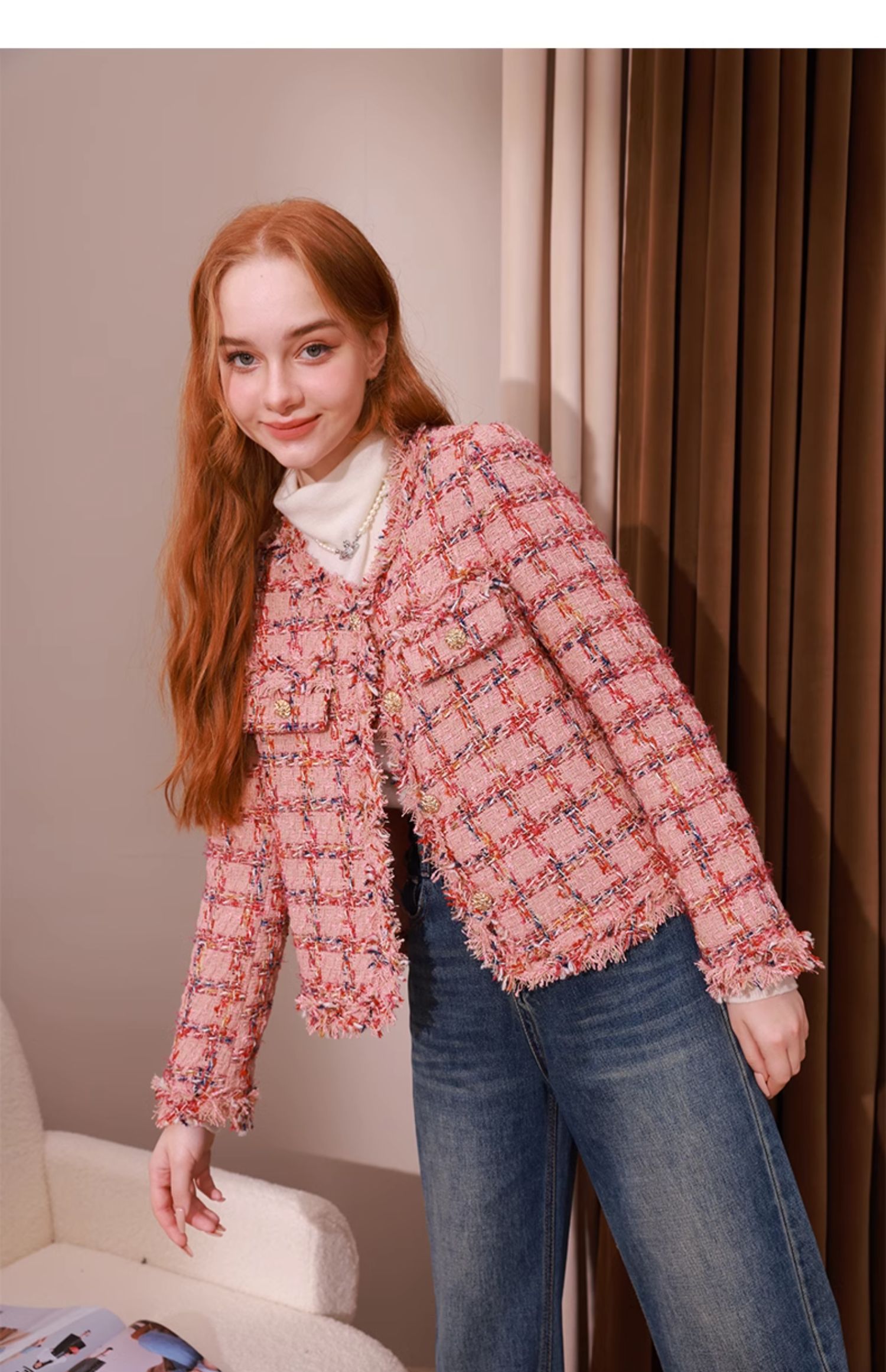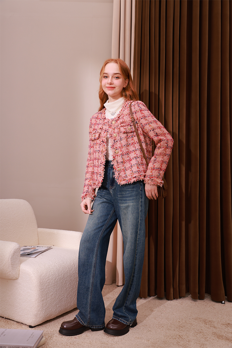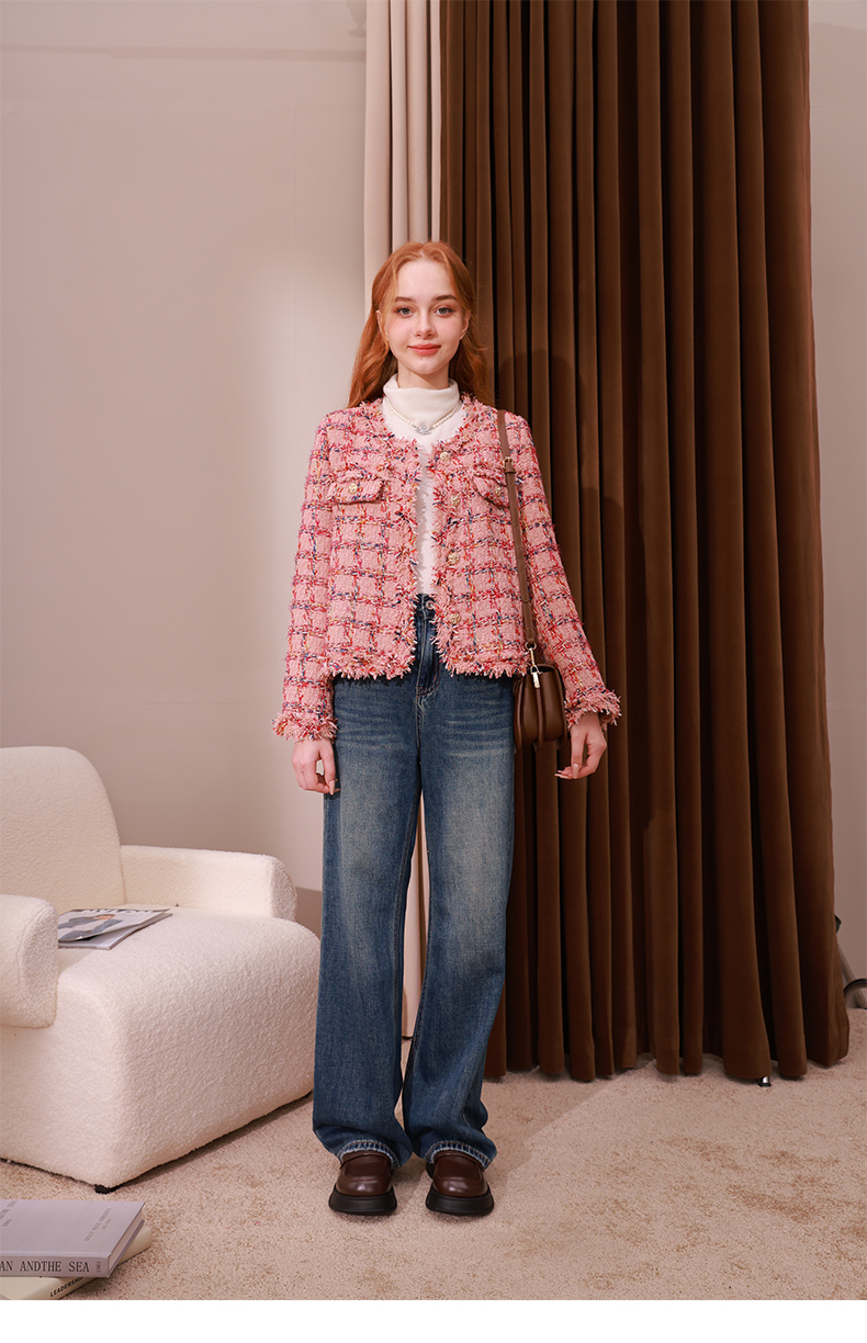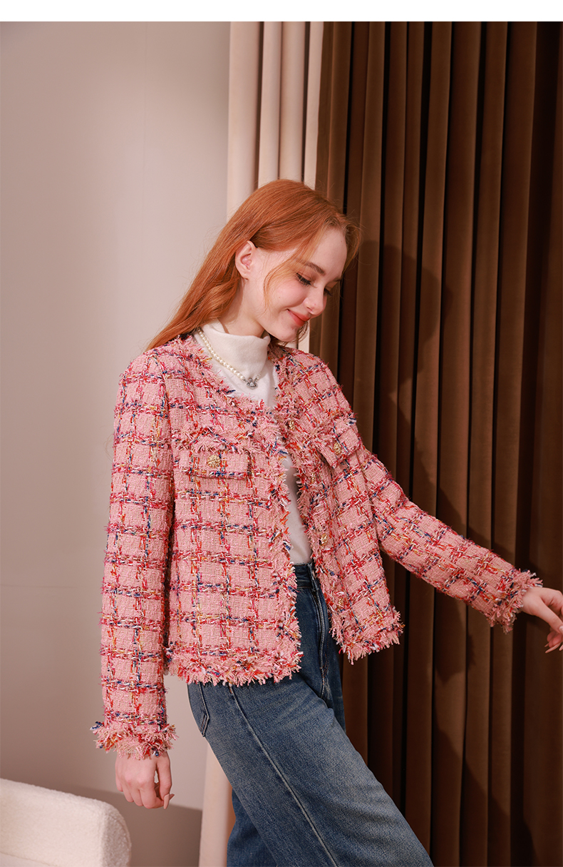 mc2小香风粉色格子外套女2023秋冬新款流水边时尚设计法式名媛风