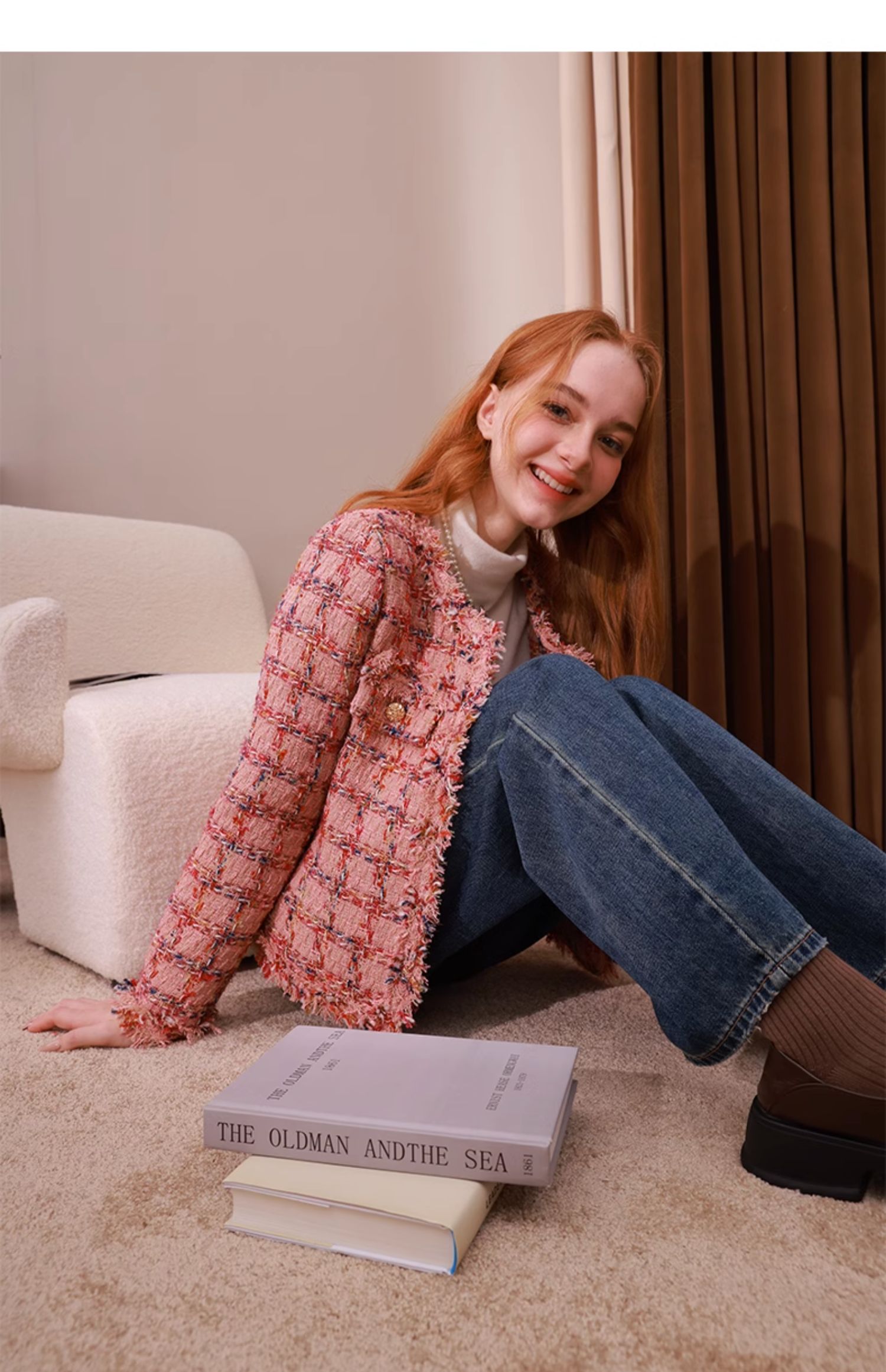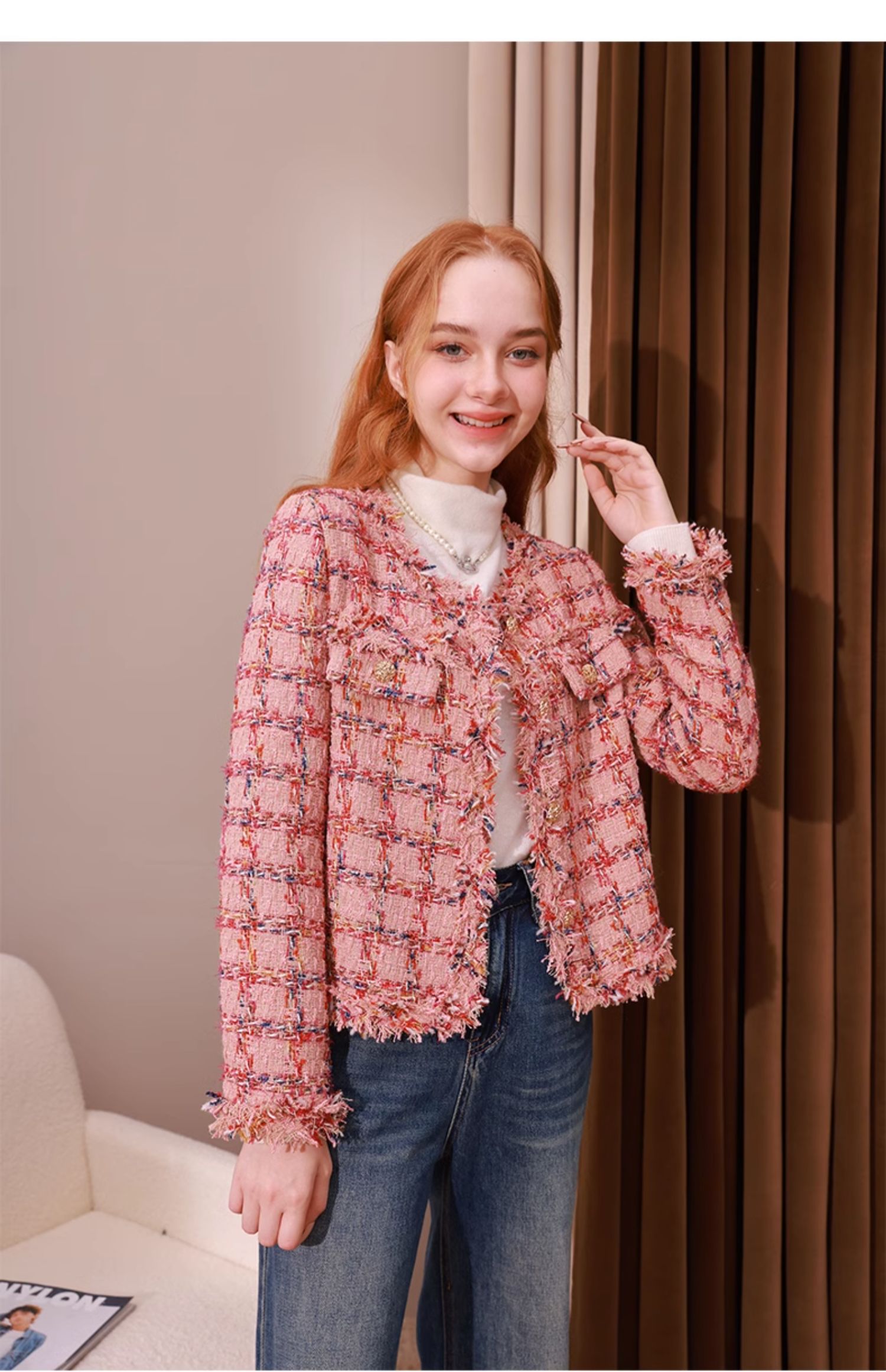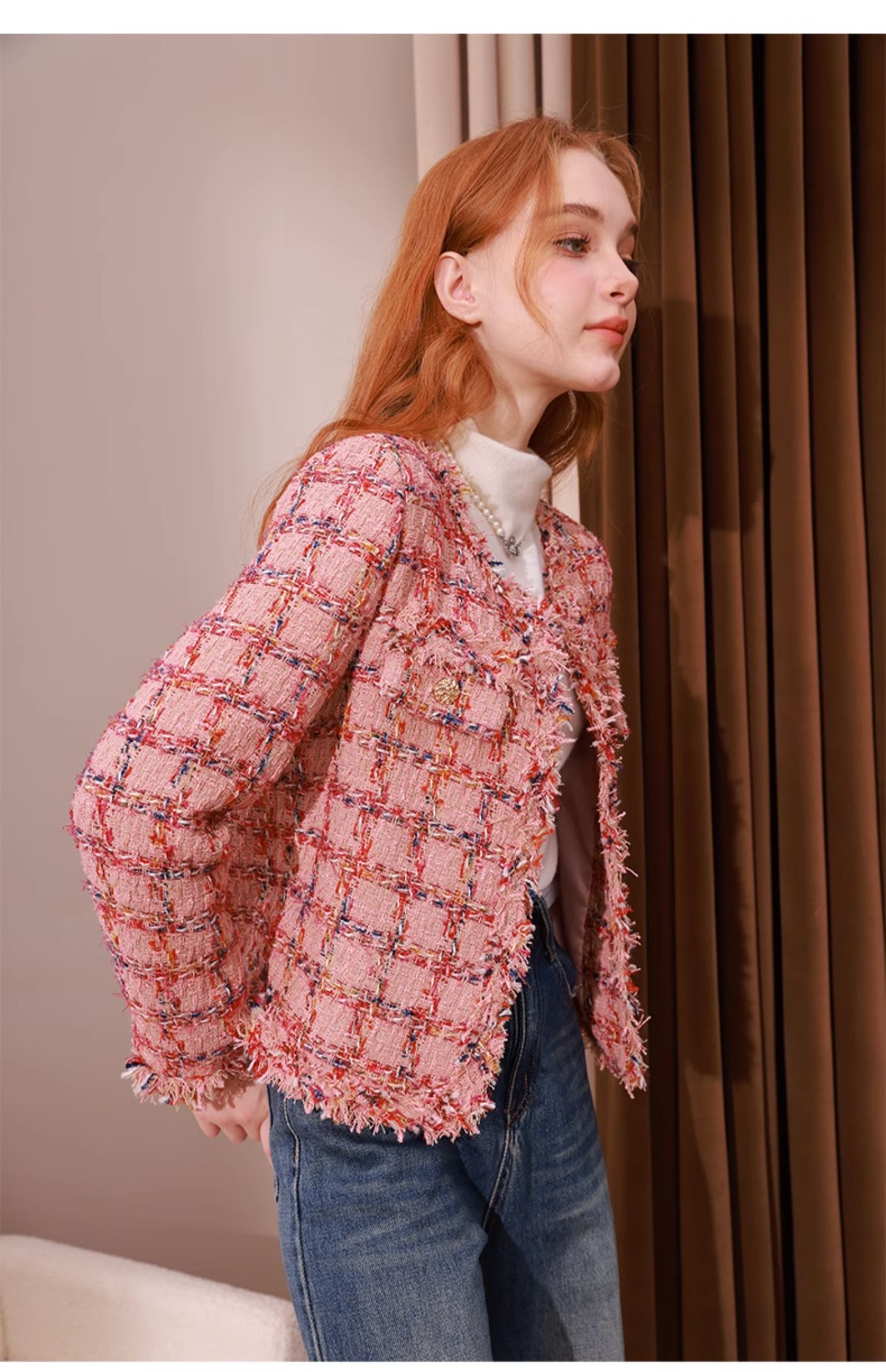 mc2小香风粉色格子外套女2023秋冬新款流水边时尚设计法式名媛风