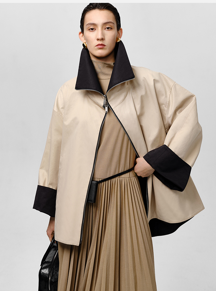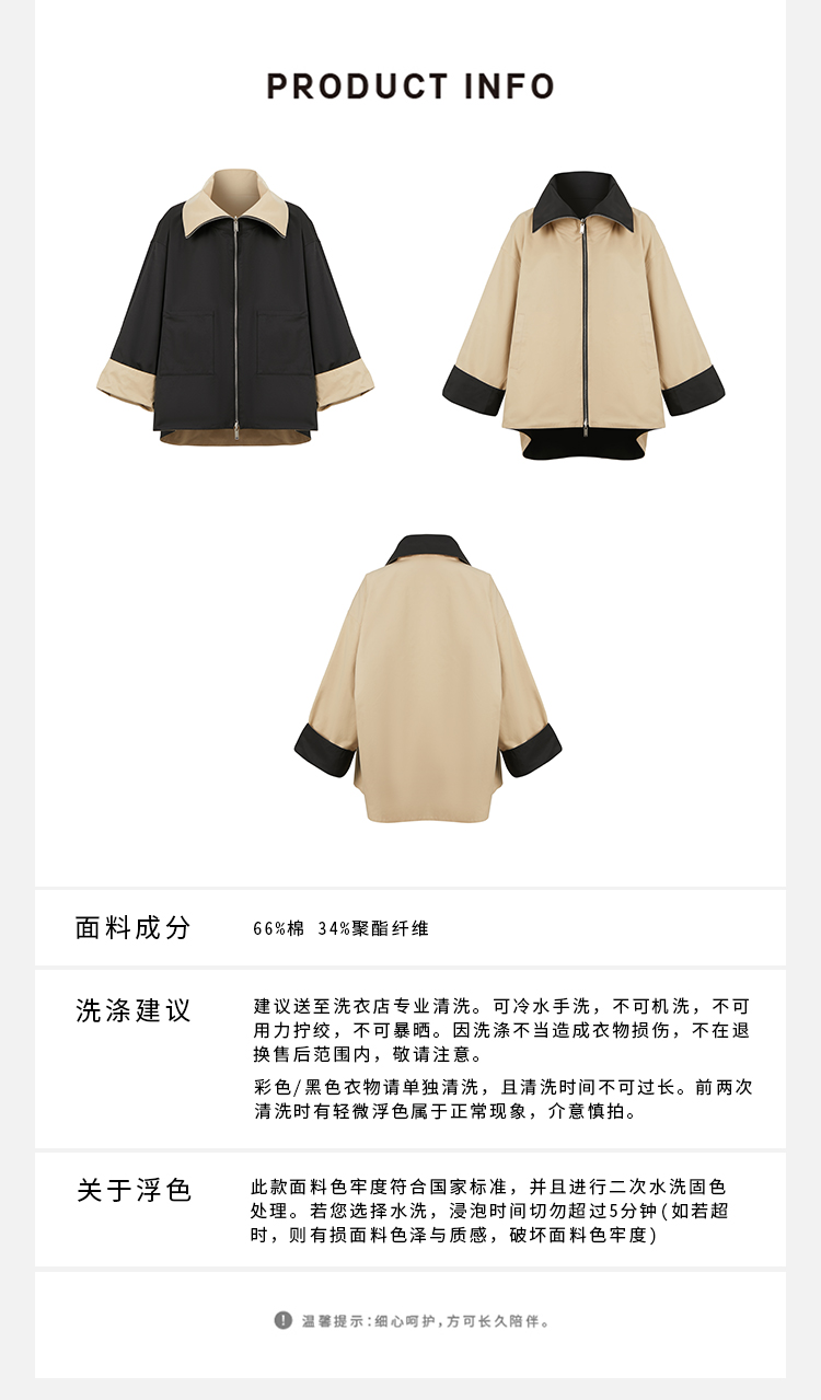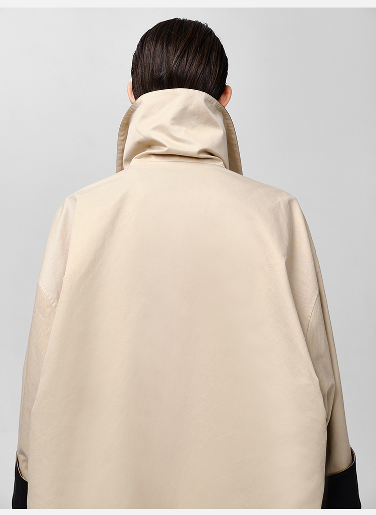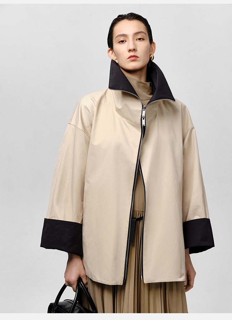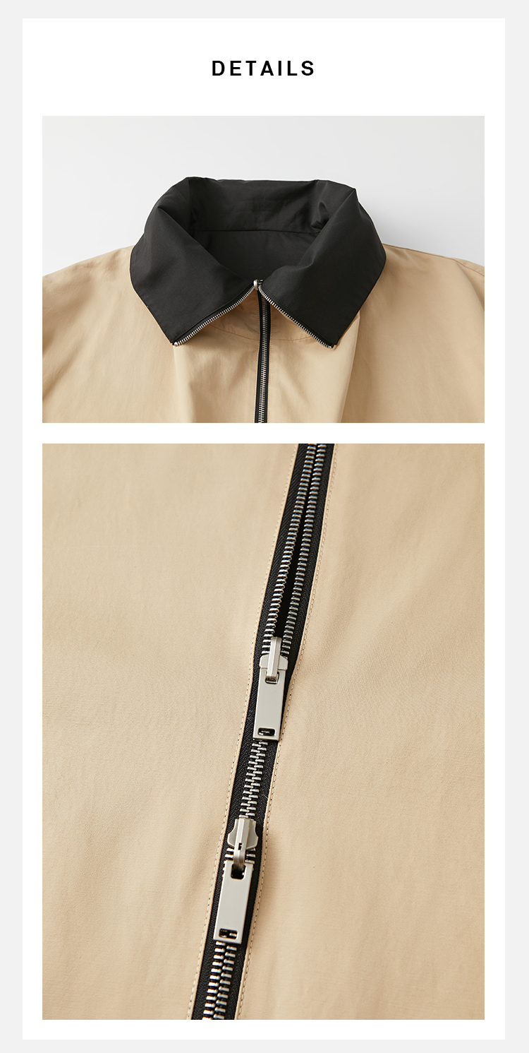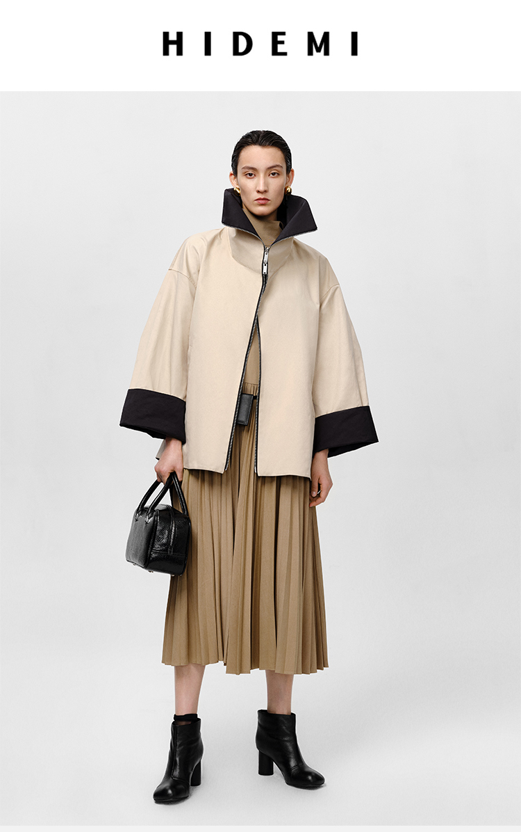 HIDEMI 黑色拼米色双层双面两穿拉链大廓形翻领外套