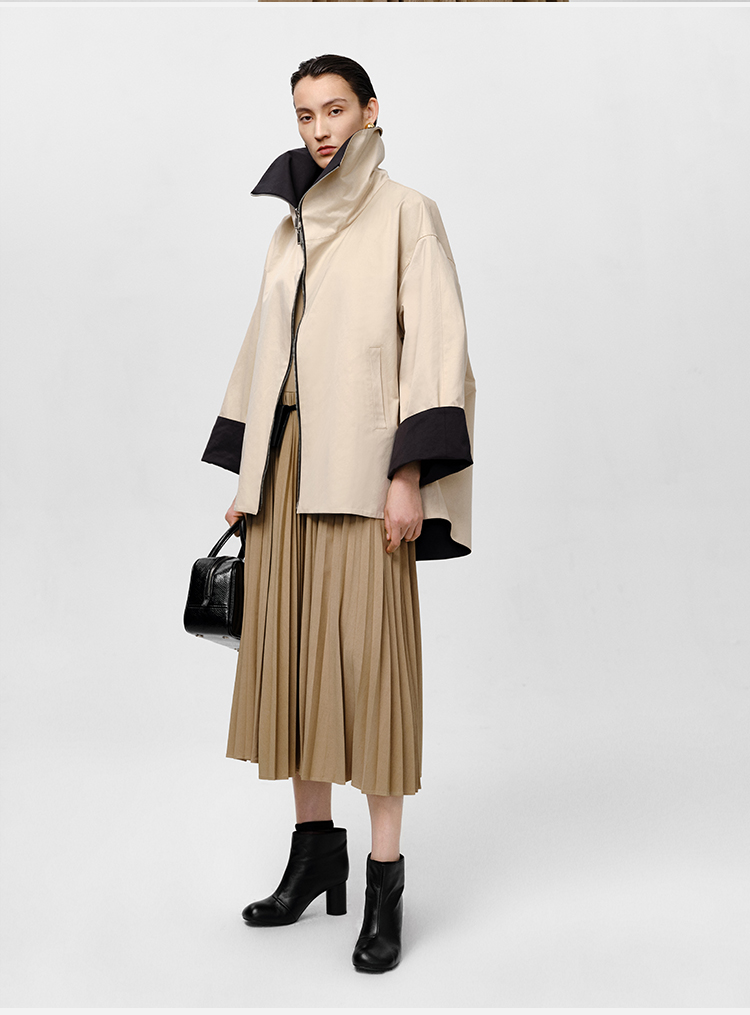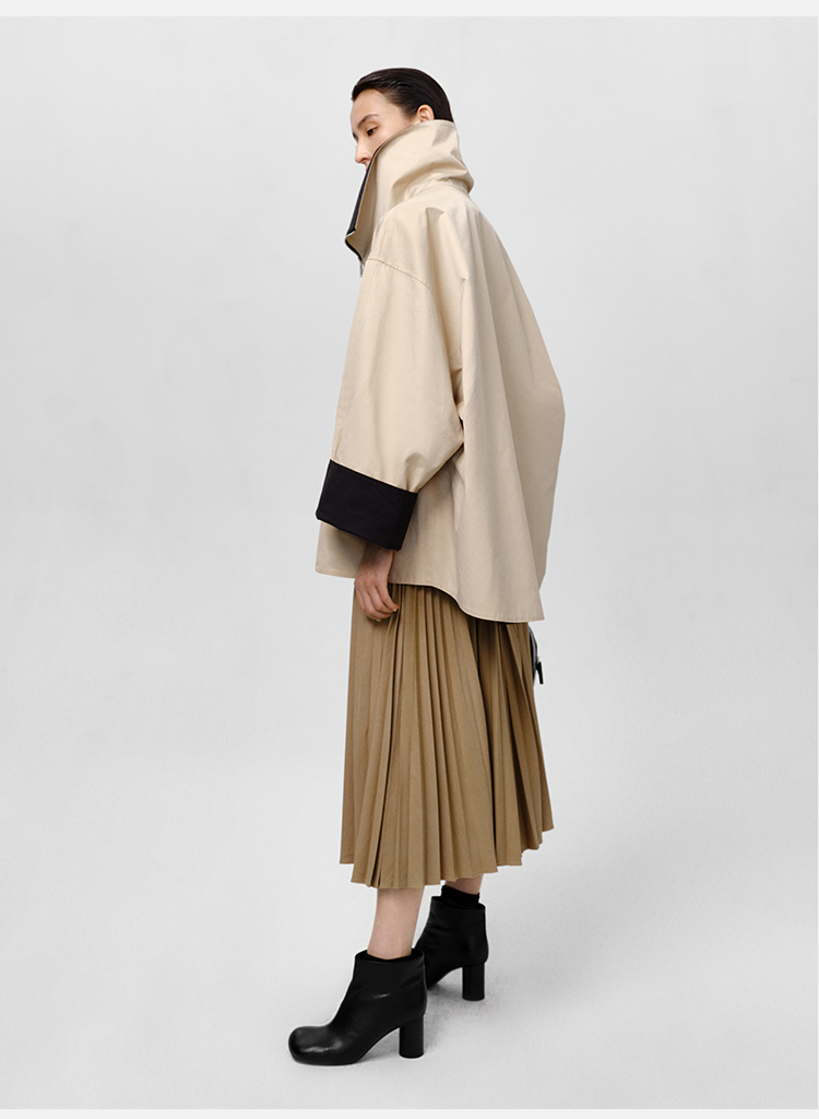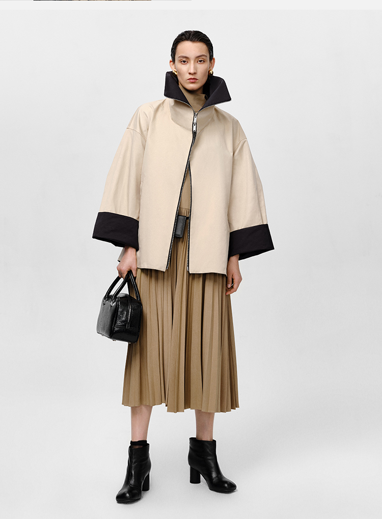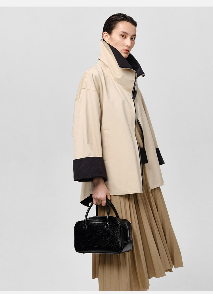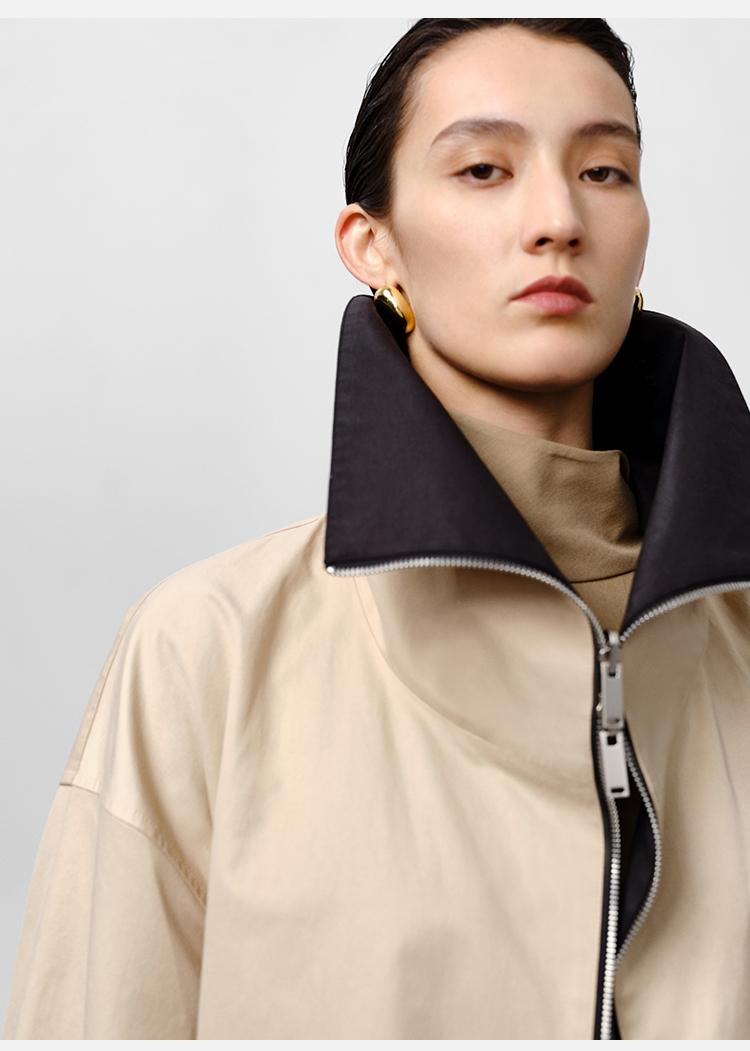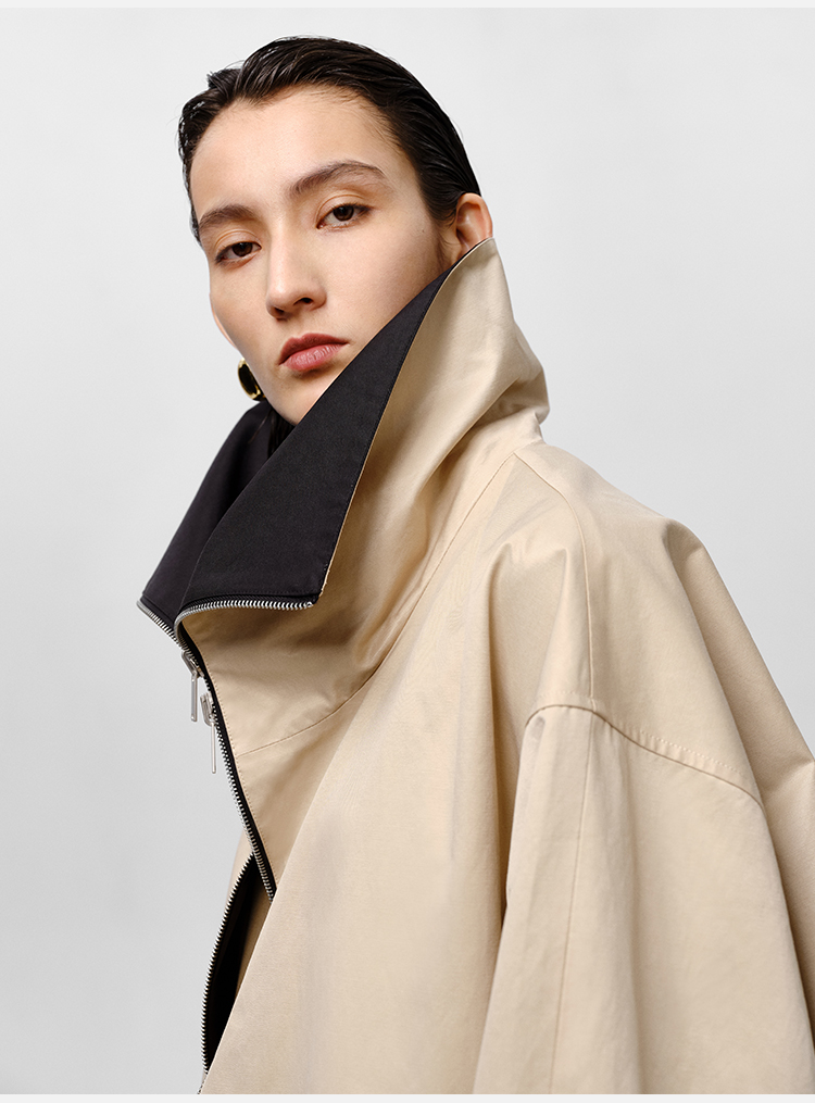 HIDEMI 黑色拼米色双层双面两穿拉链大廓形翻领外套