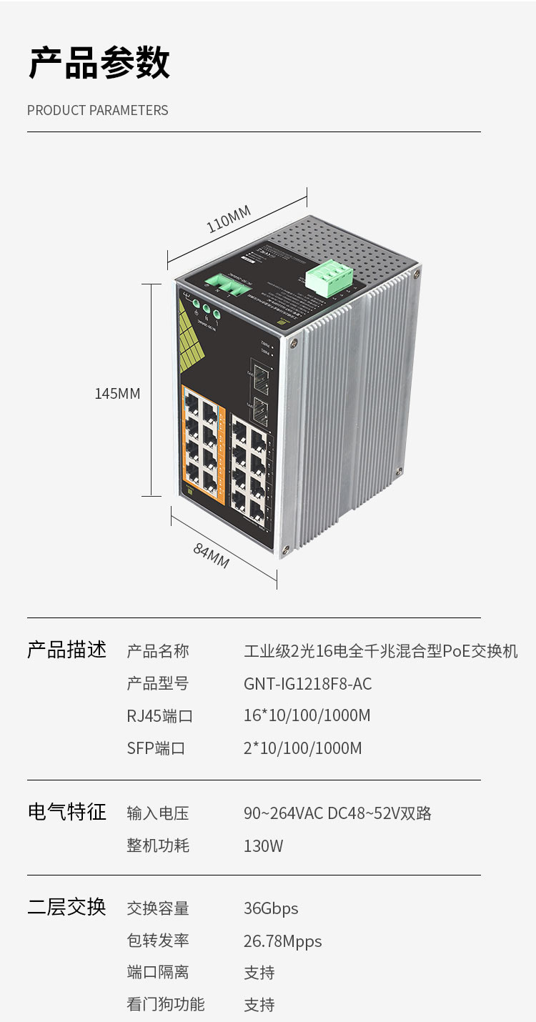 工业级2光16电全千兆交换机 AC+DC三冗余 IG1218F8-AC